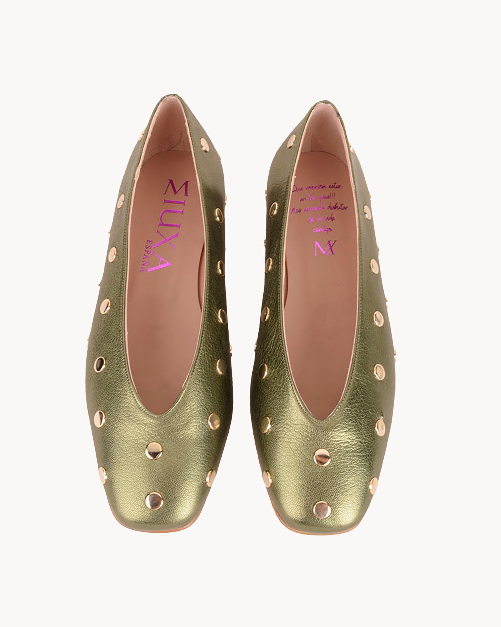Bailarina en piel metalizada color verde. Detalle de tachas doradas. Forro interior en piel con plantilla acolchada. Tacón de 1,5cm y suela antideslizante.