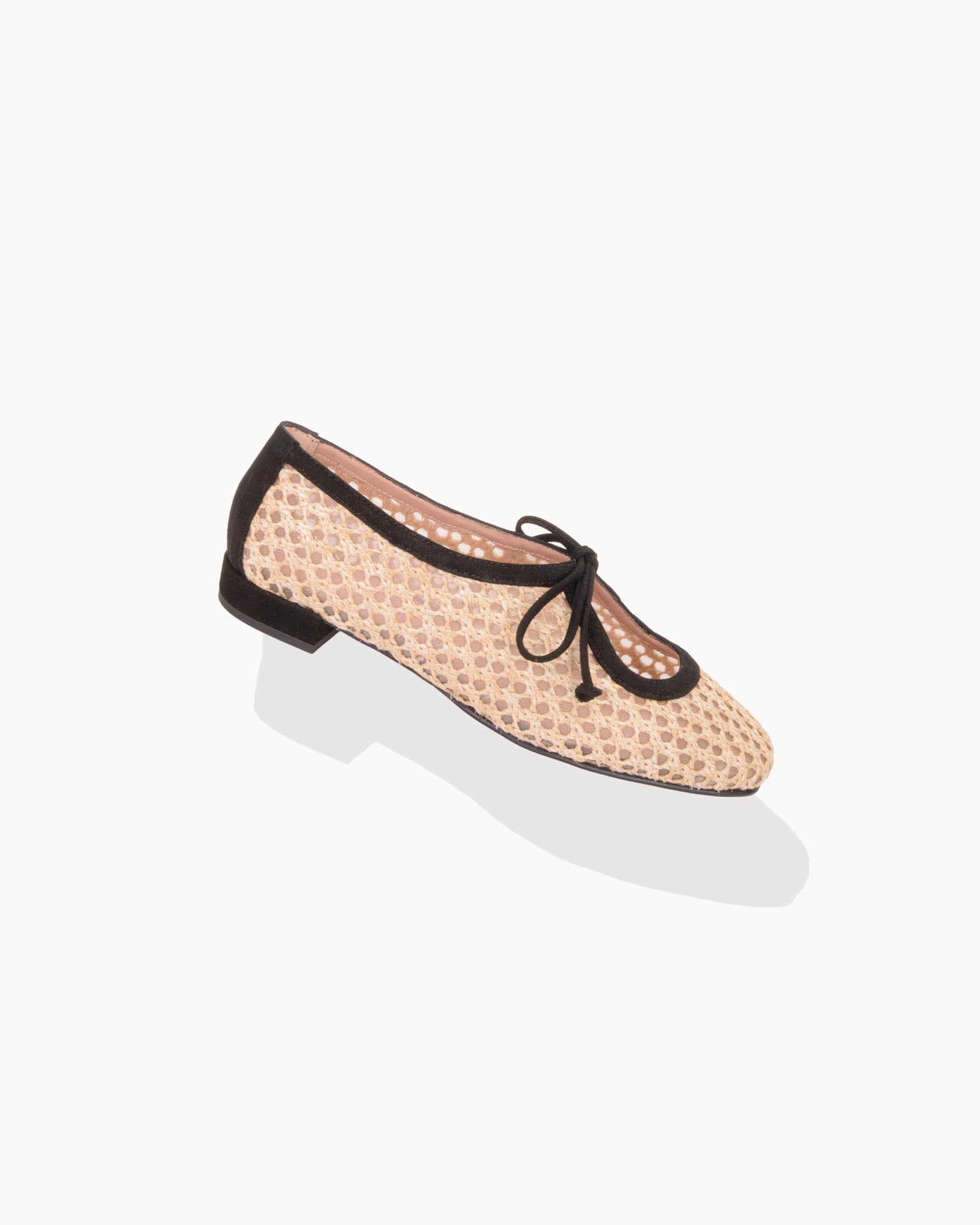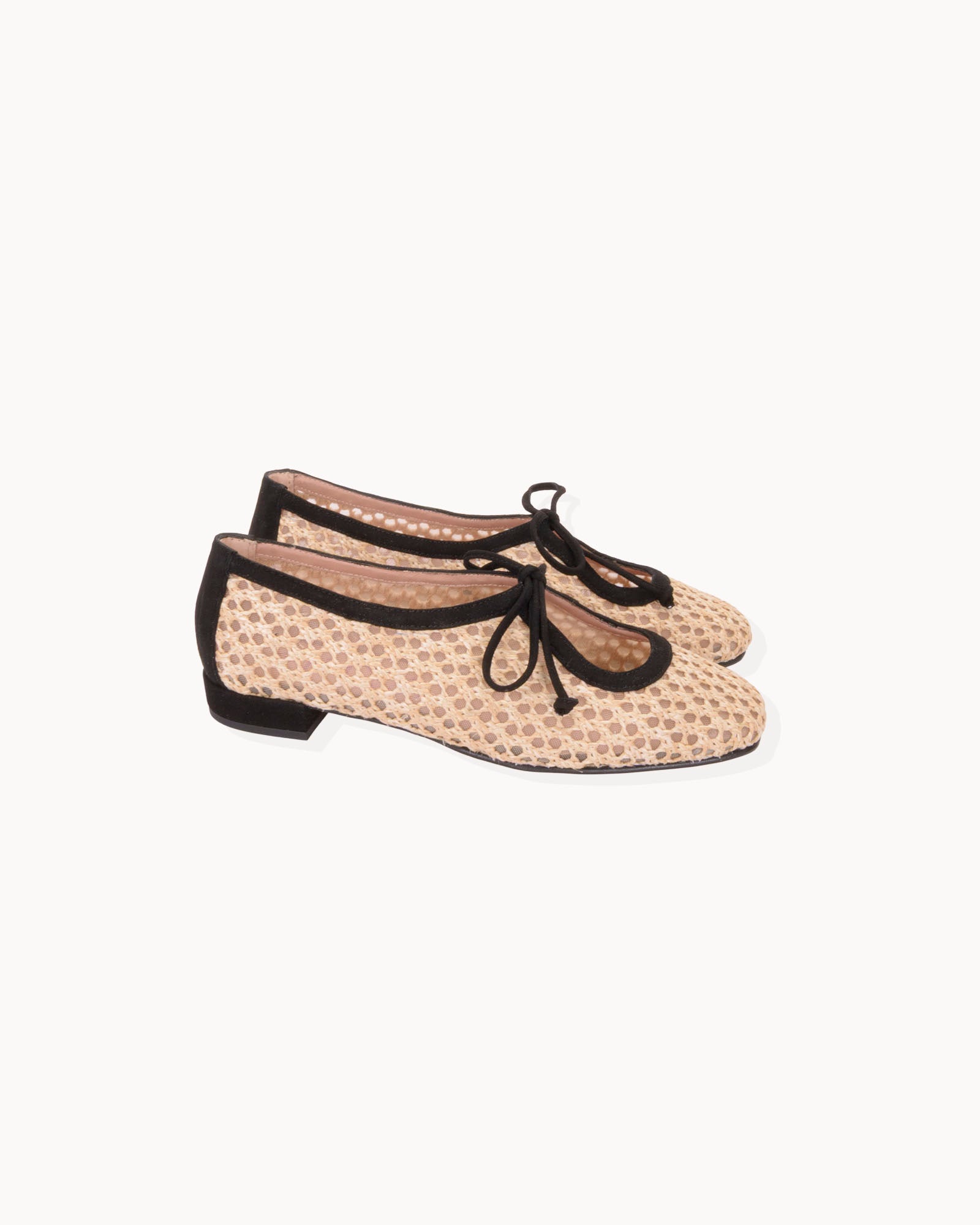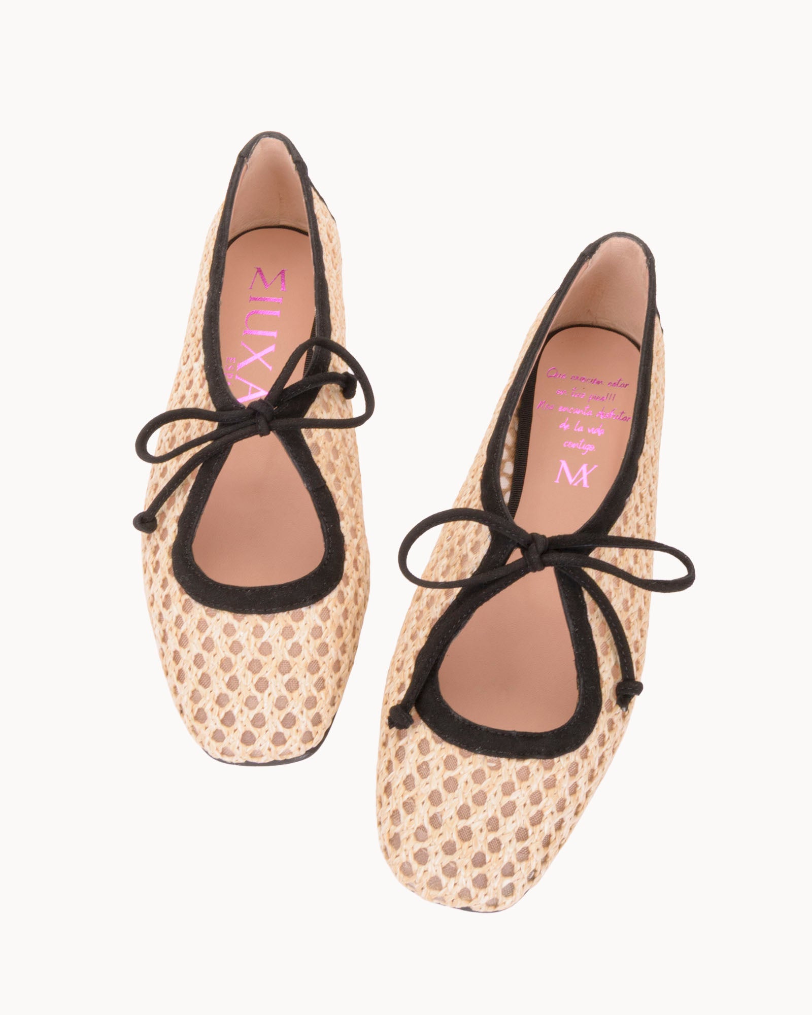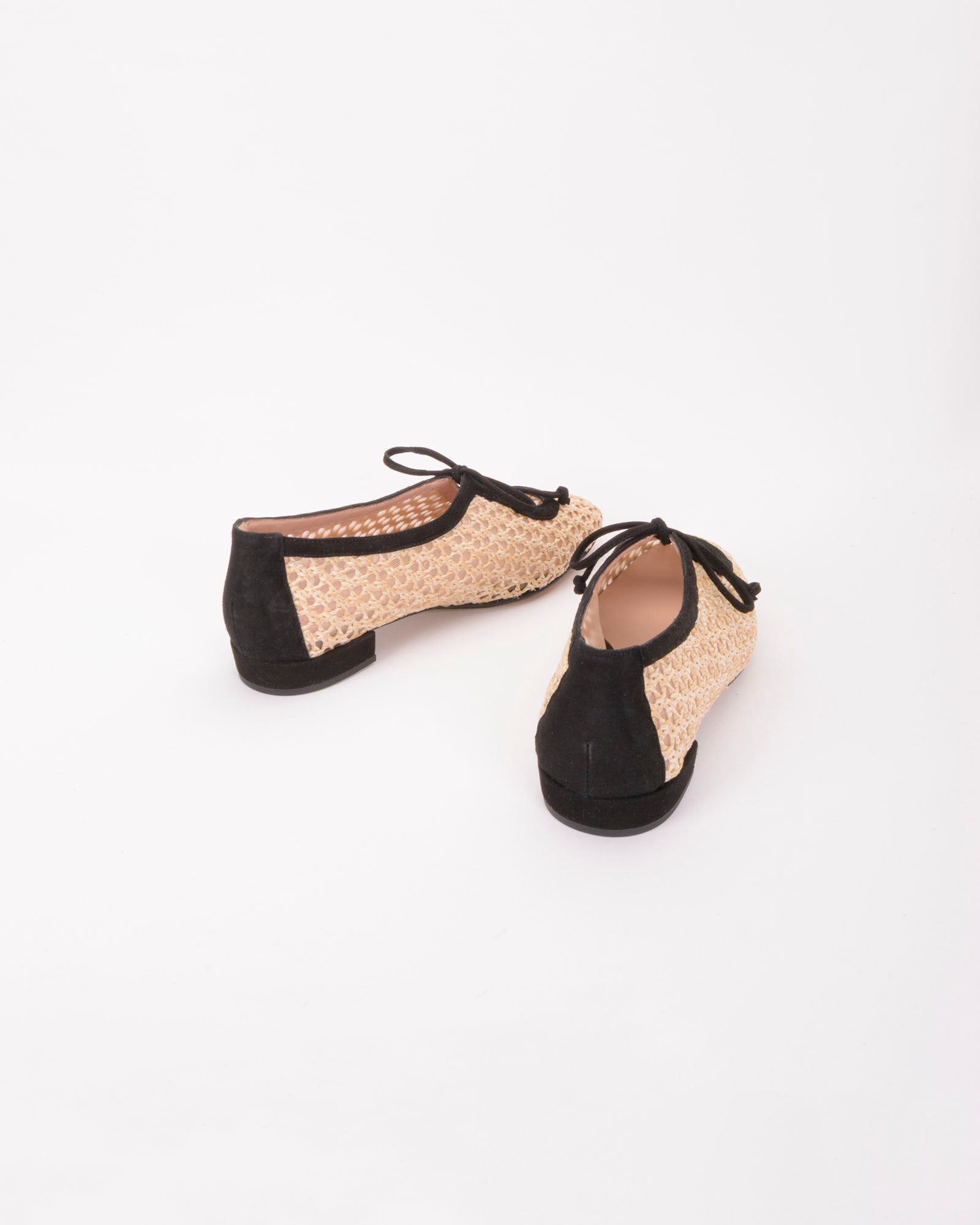 Bailarina en rafia natural. Detalle de lazo, ribete y talón en ante negro. Plantilla de piel acolchada. Tacón de 2cm forrado en ante negro y suela antideslizante.