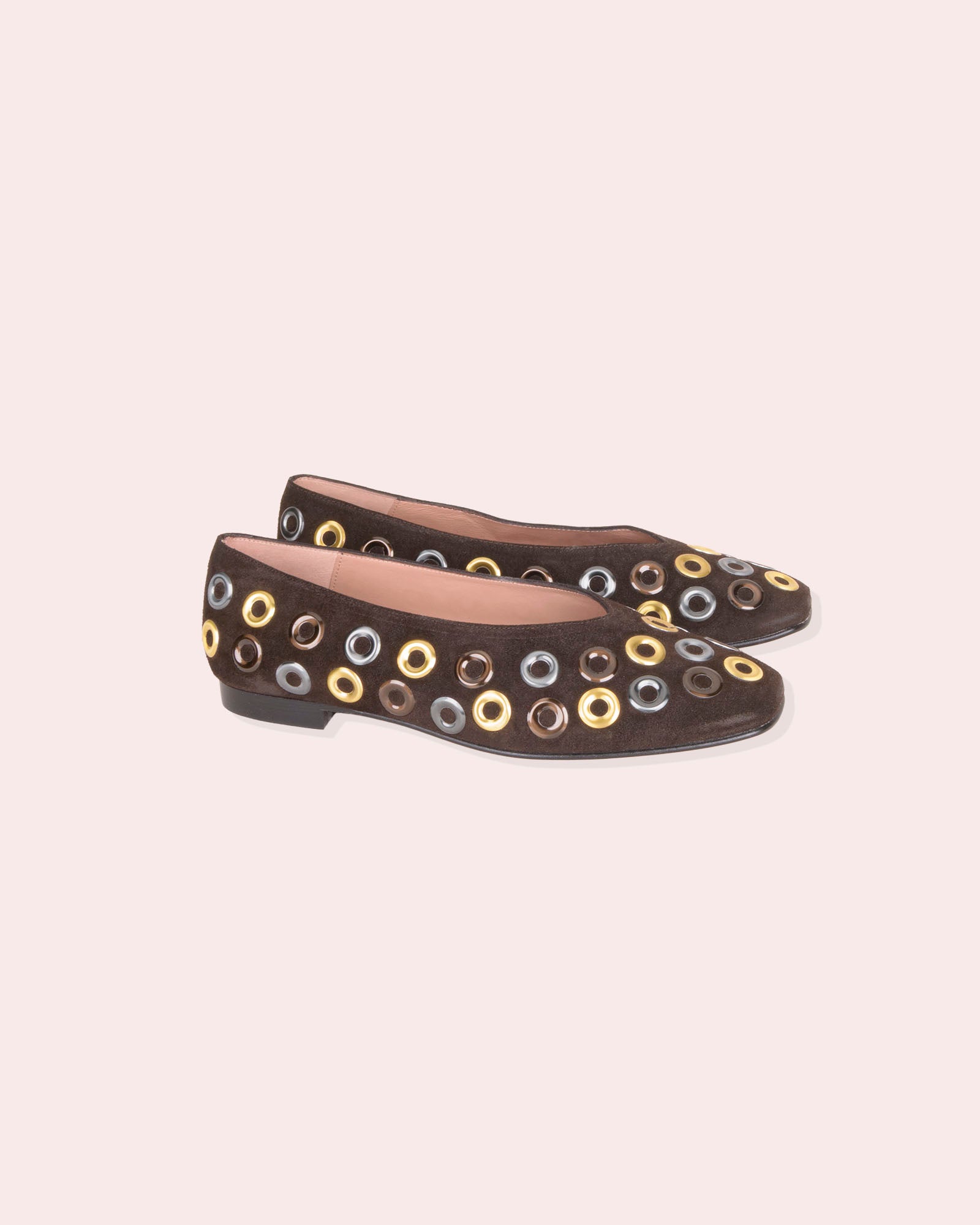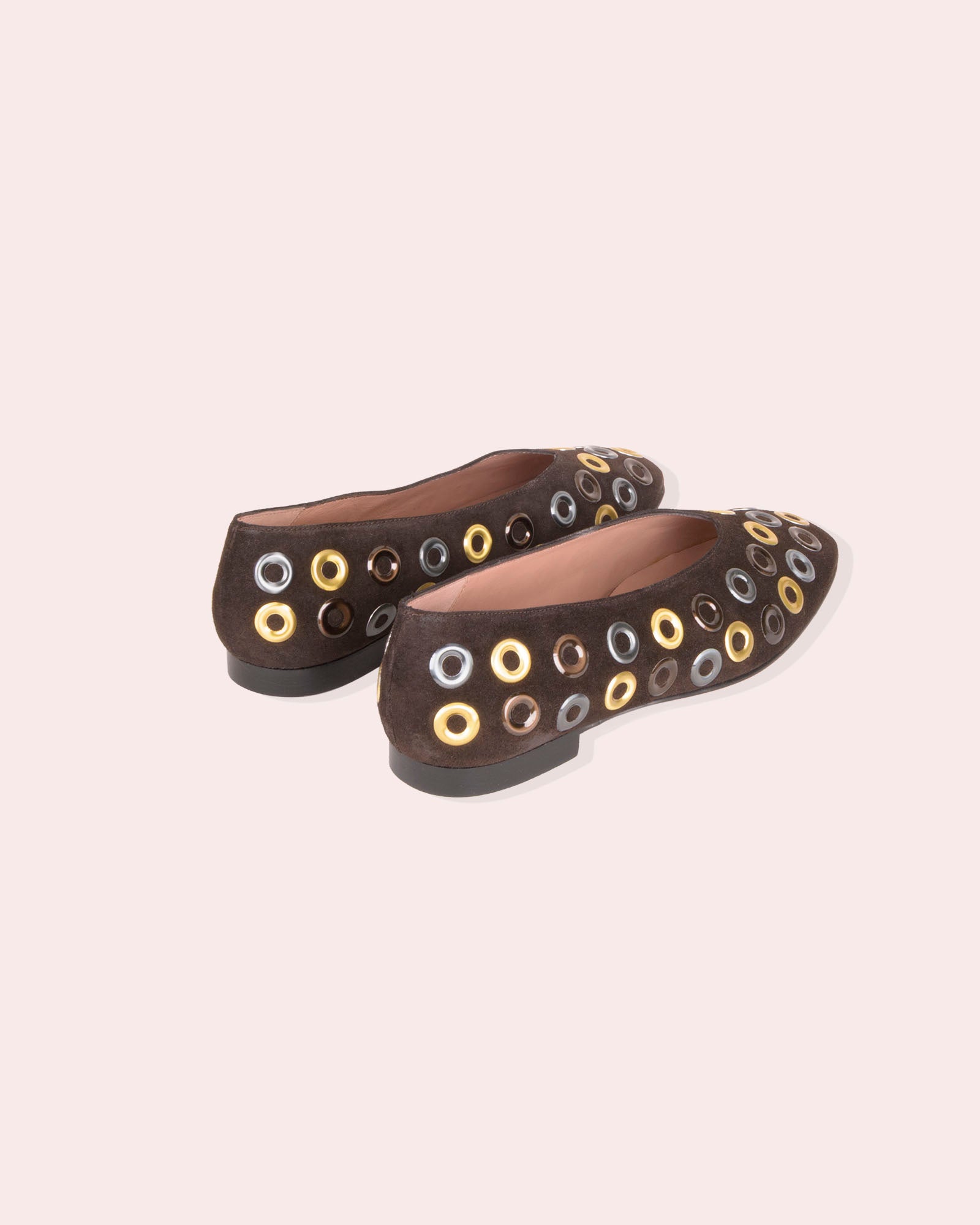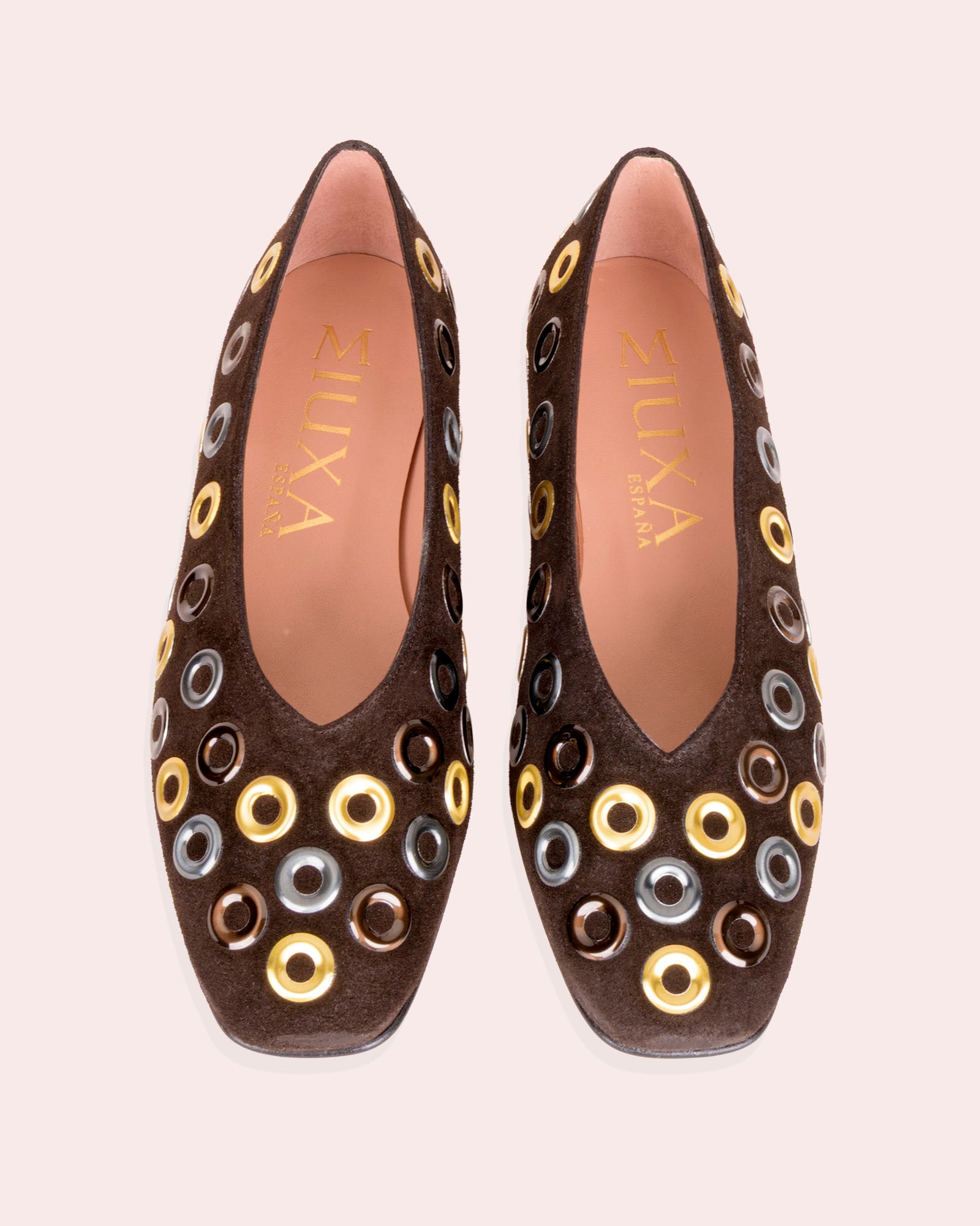 - Detalle de eyelets metalizados en plata, dorado y acero.