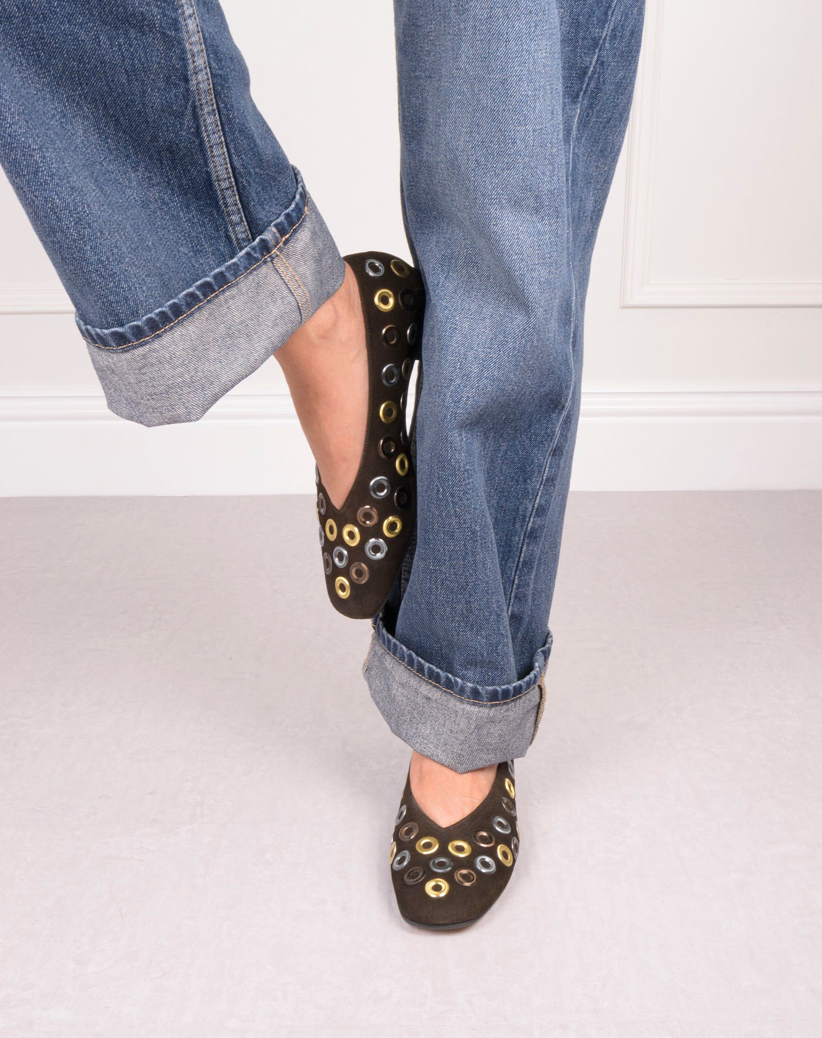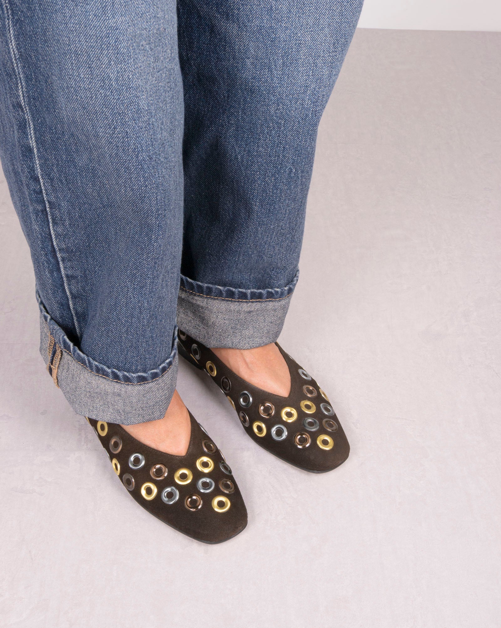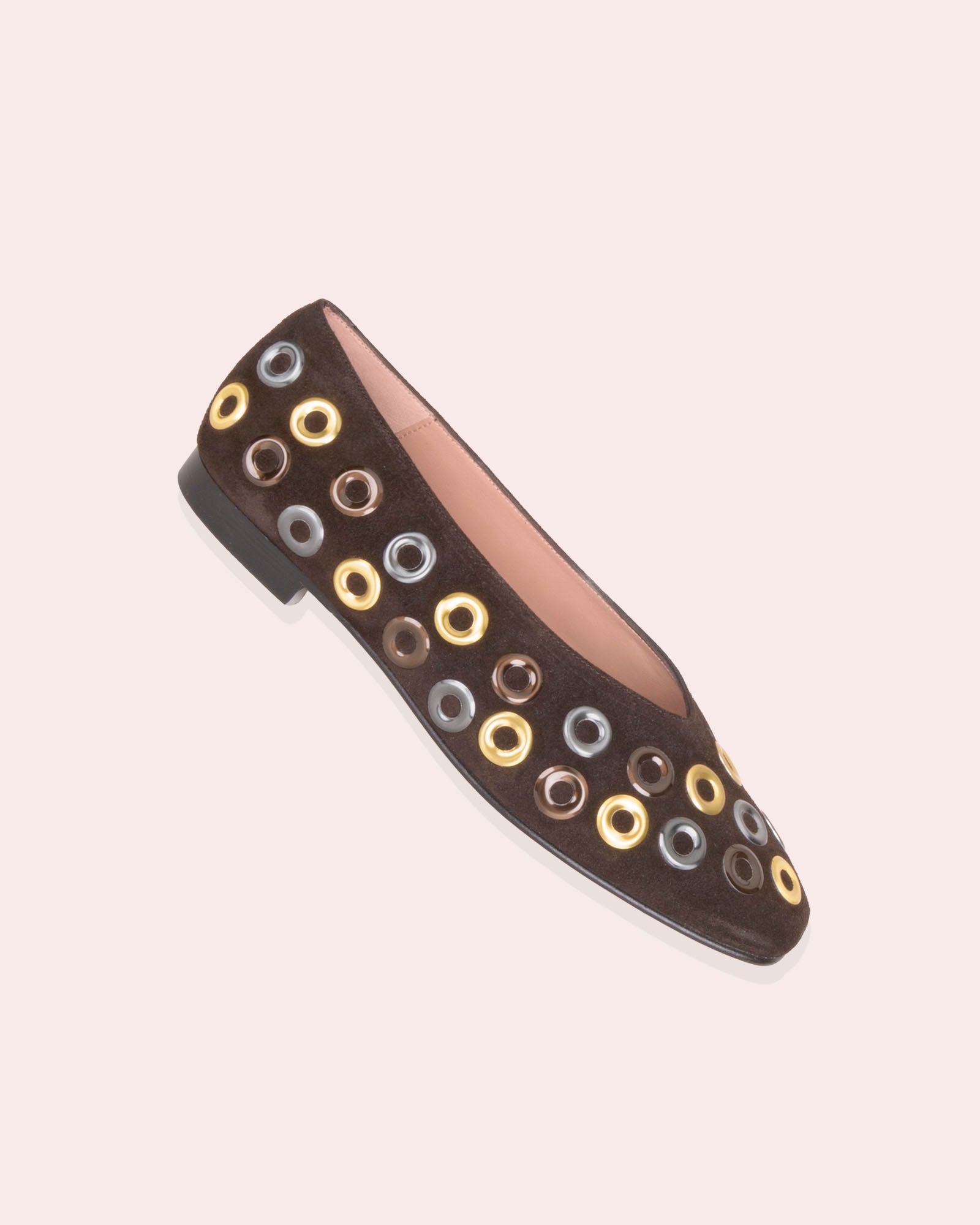 - Detalle de eyelets metalizados en plata, dorado y acero.