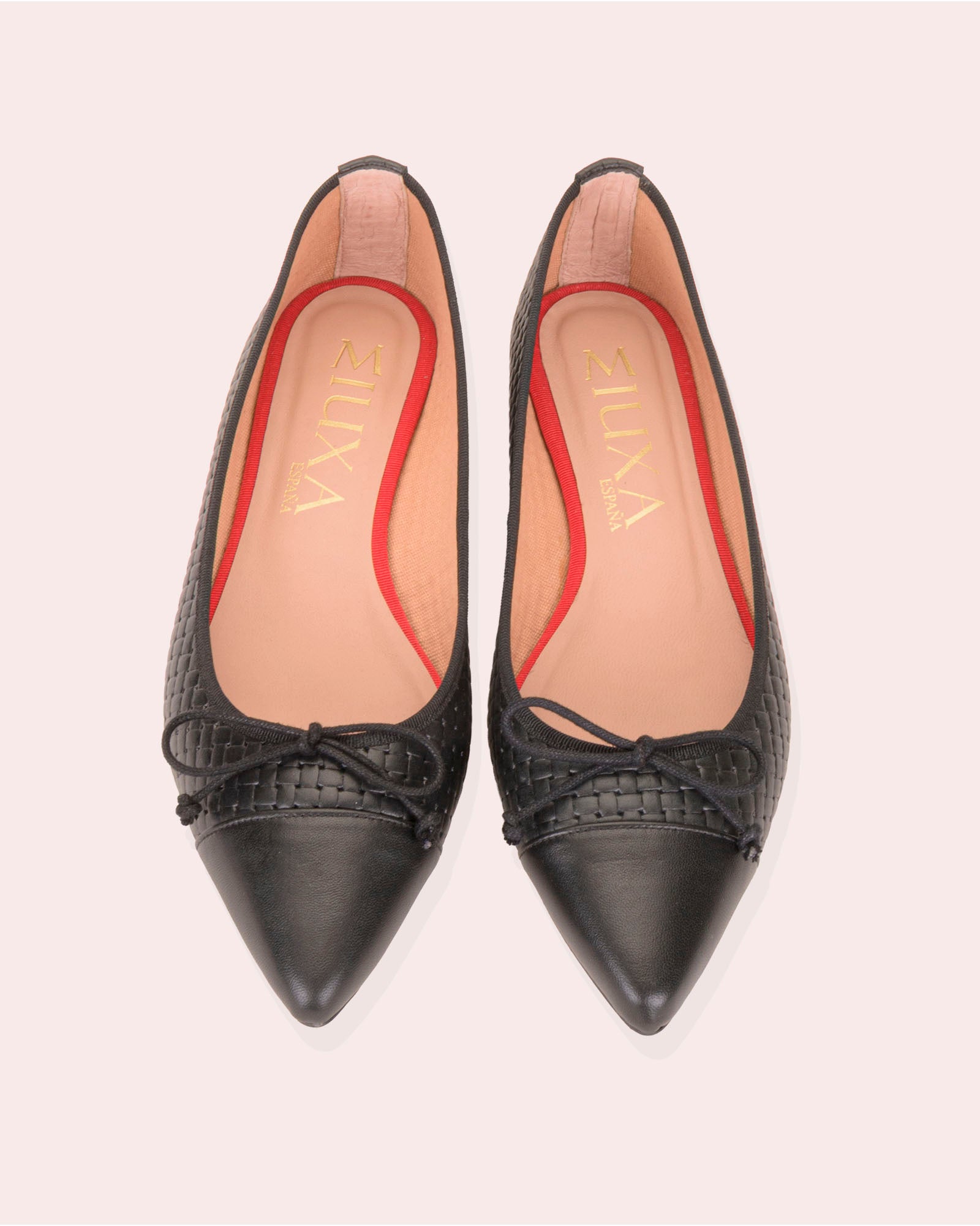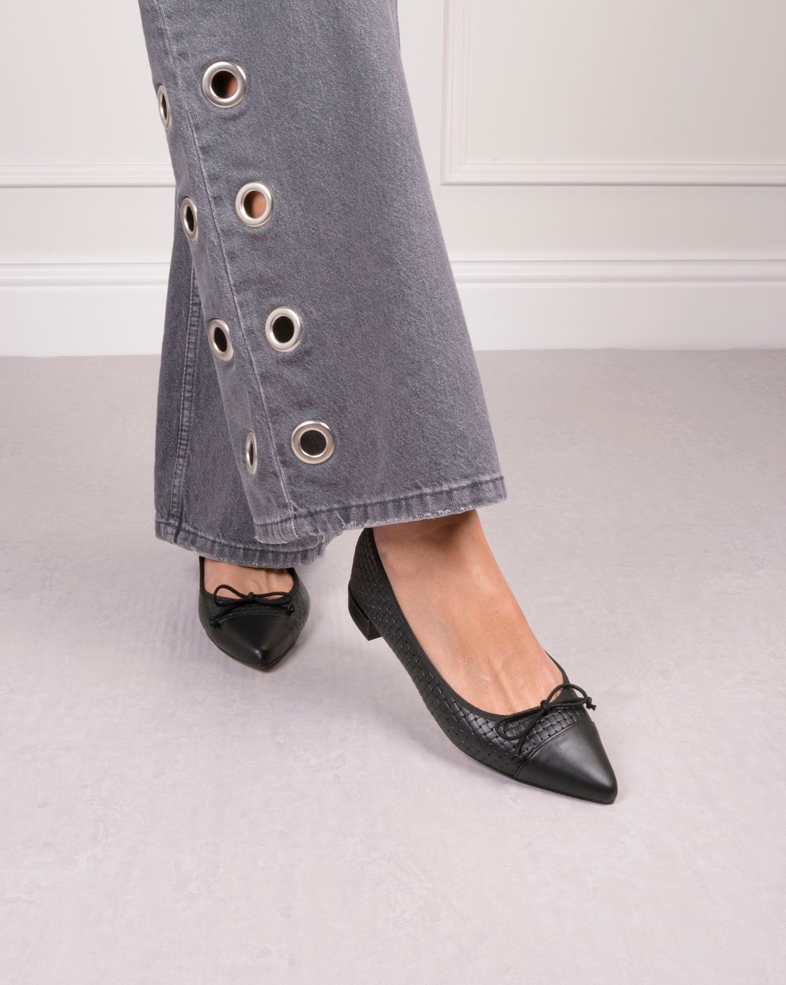 - Detalle de puntera en piel lisa negra y lazo negro.