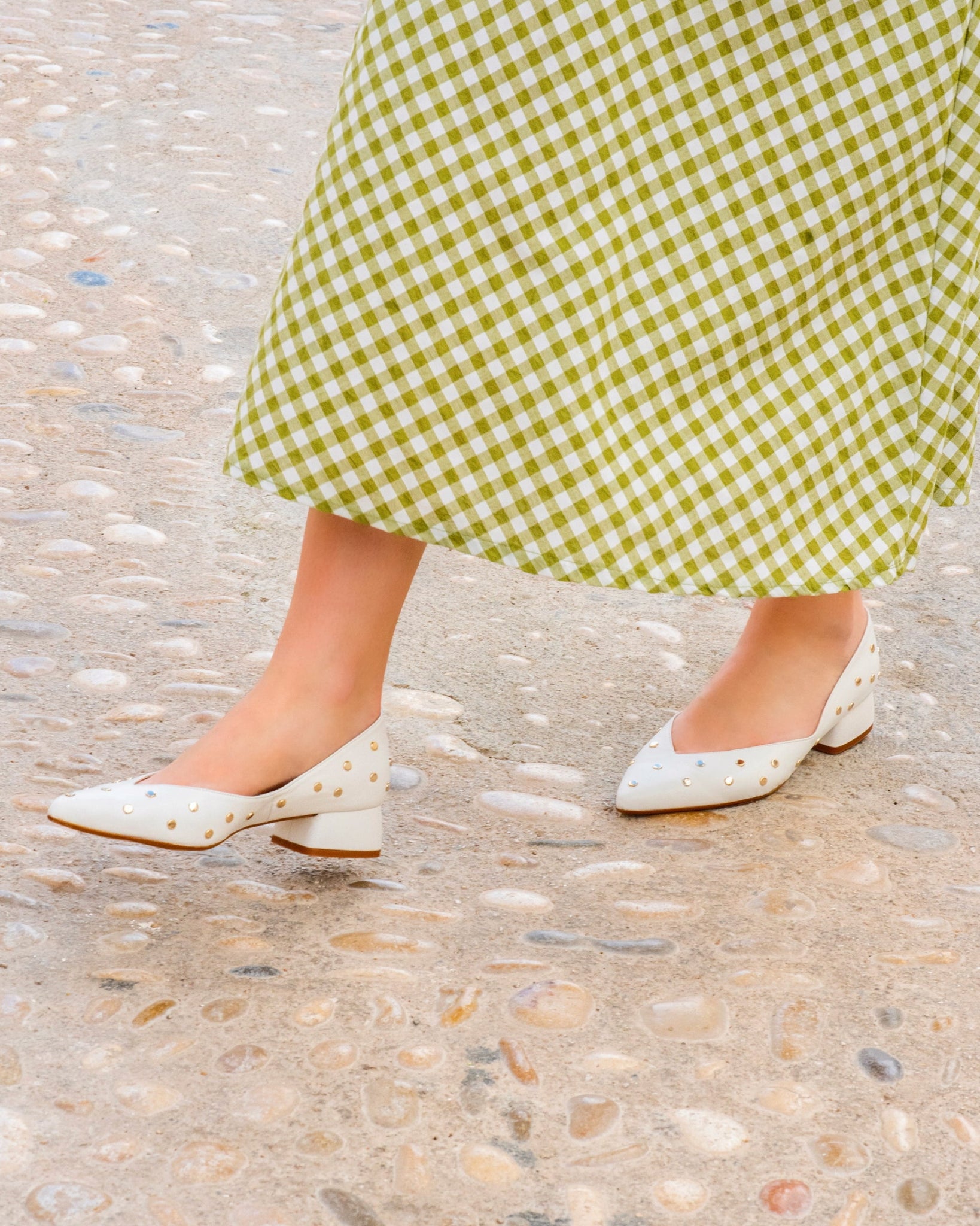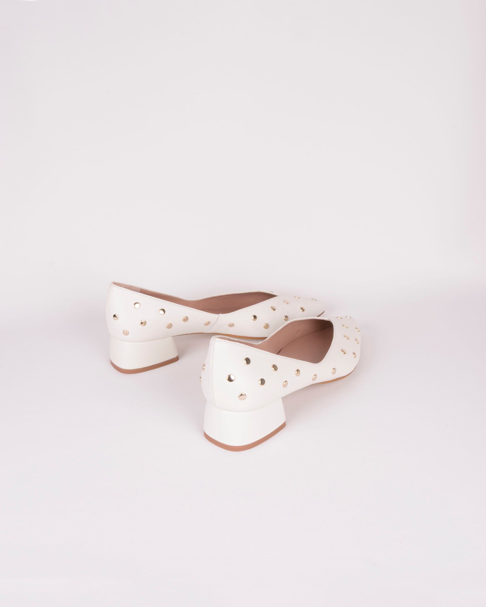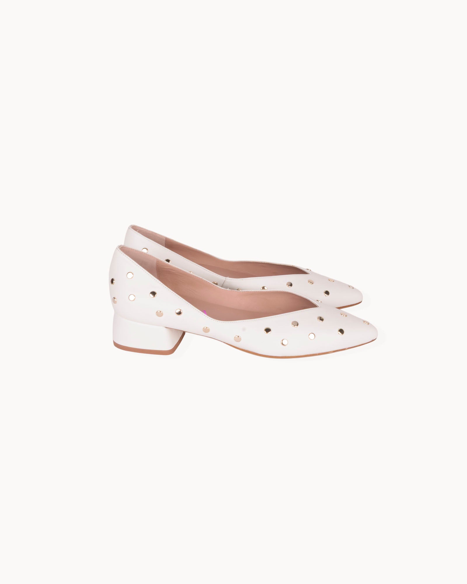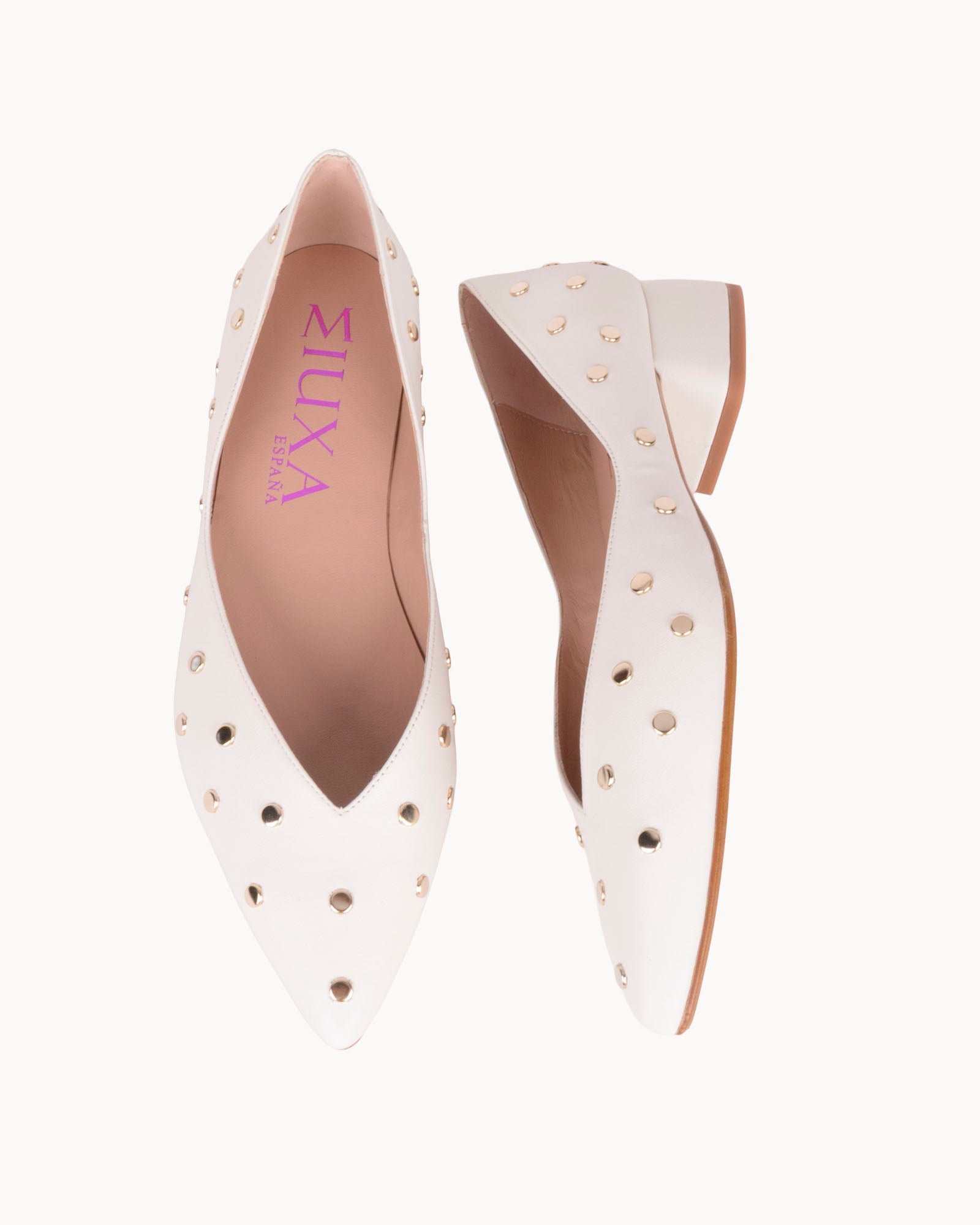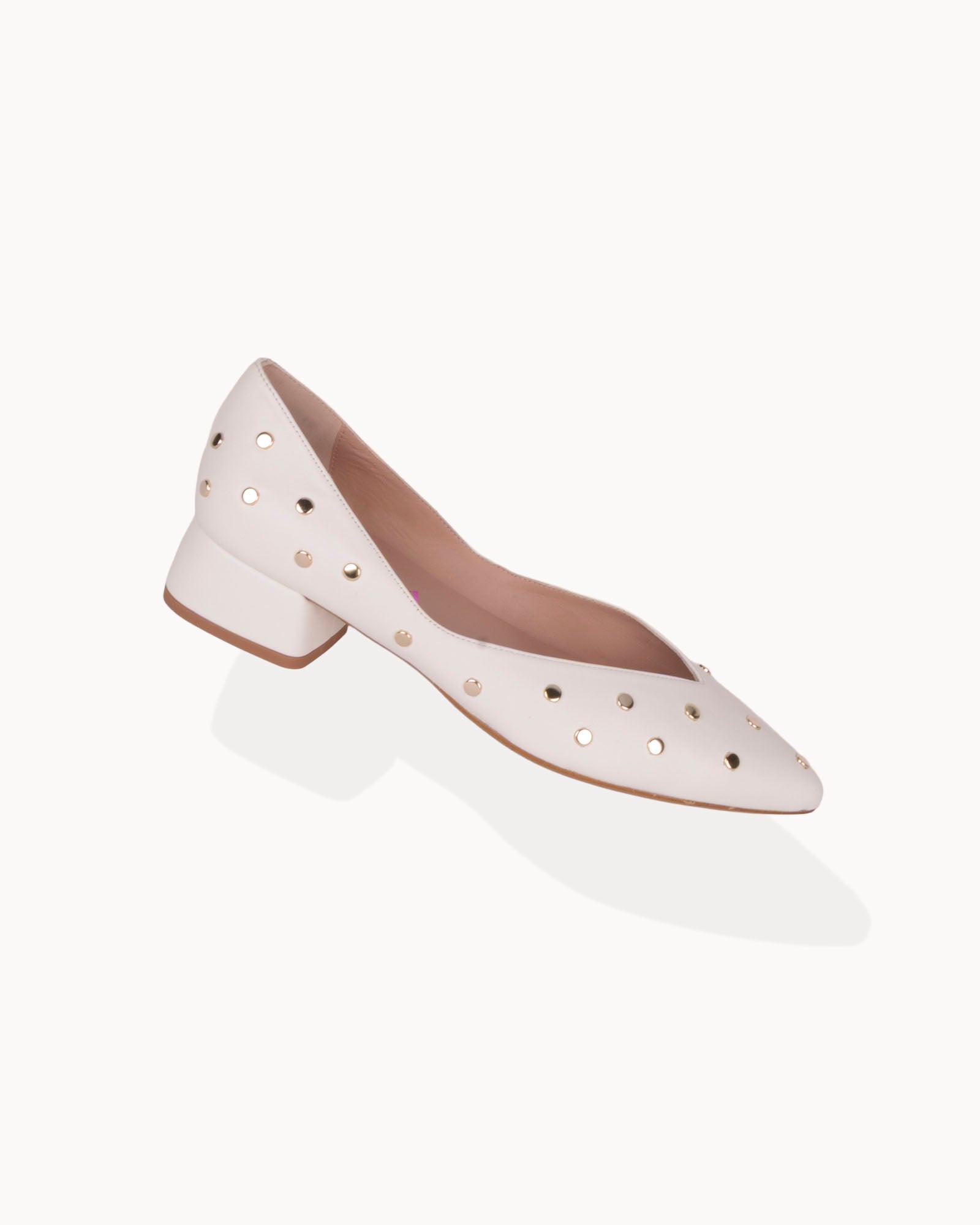 Bailarina en piel color blanco con puntera en pico. Detalle de tachas doradas. Interior forrado en piel con plantilla acolchada. Tacón de 3,5cm forrado en piel color blanco y suela antideslizante.