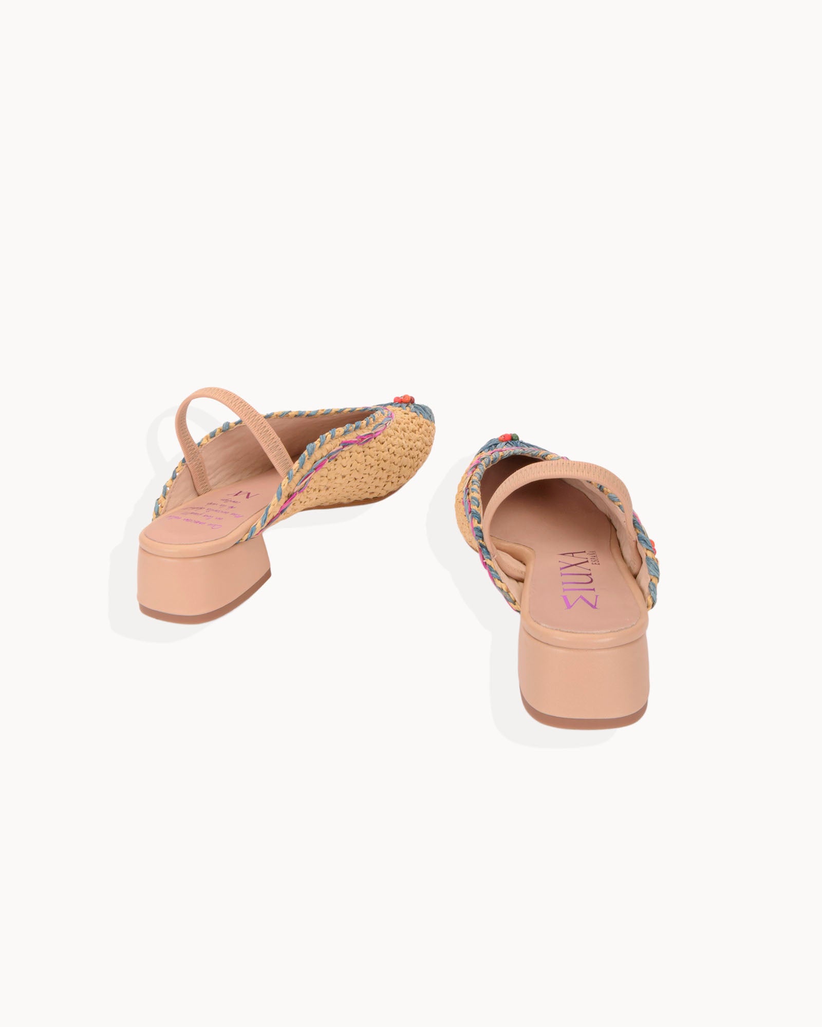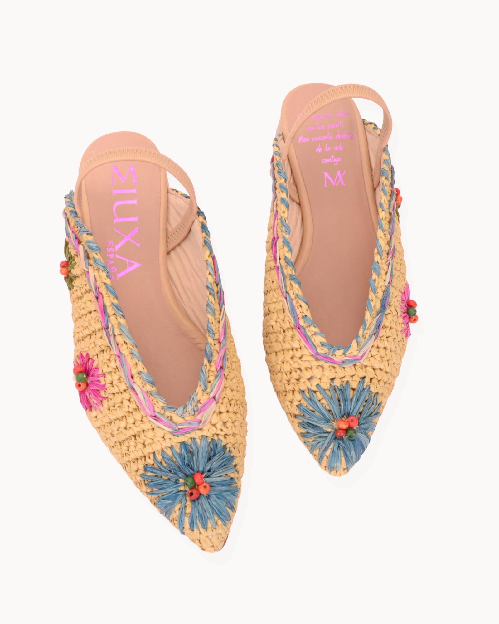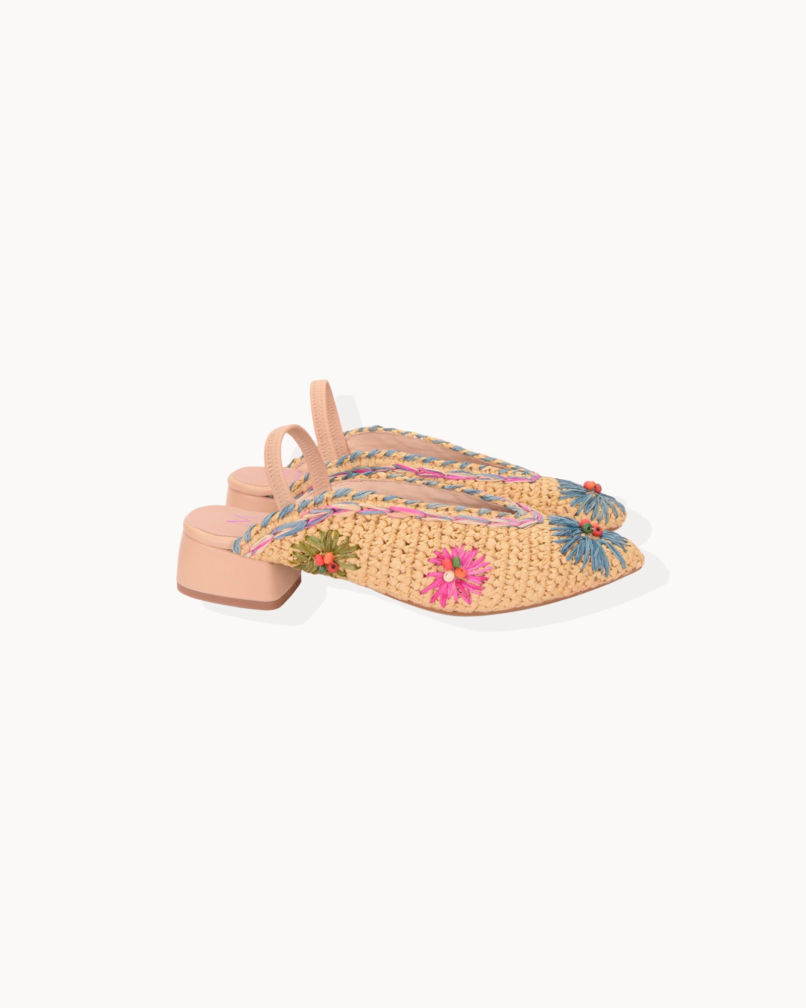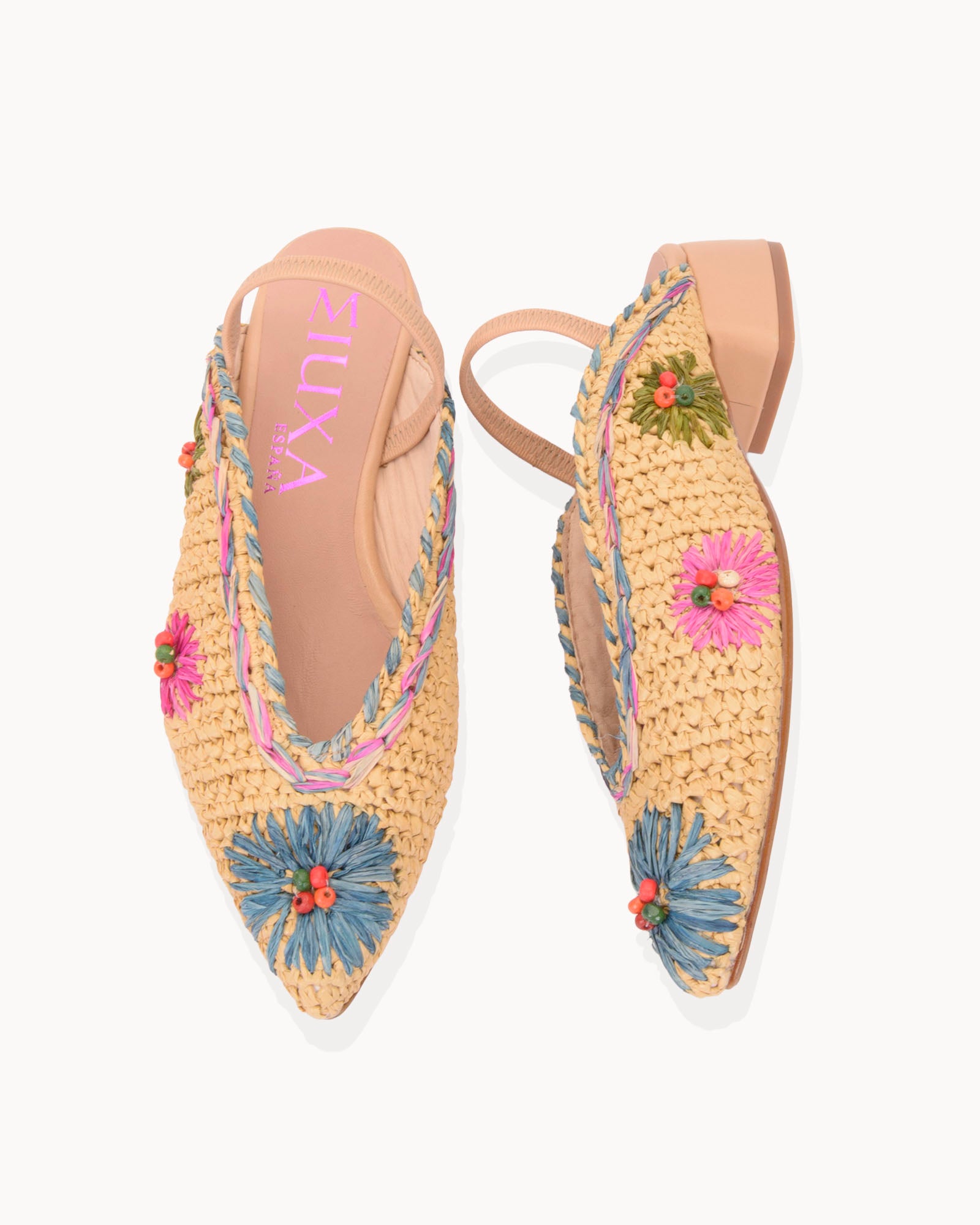Bailarina destalonada en rafia natural. Detalle de flores bordadas en colores. Tira elástica forrada en piel beige. Forro interior en piel con plantilla acolchada. Tacón de 3,5cm forrado en piel y suela antideslizante.