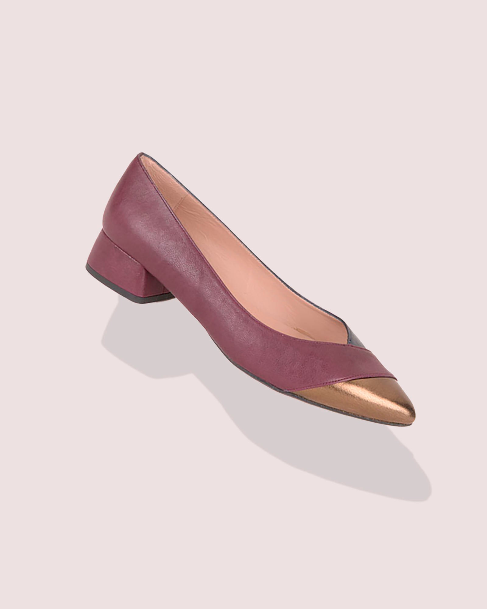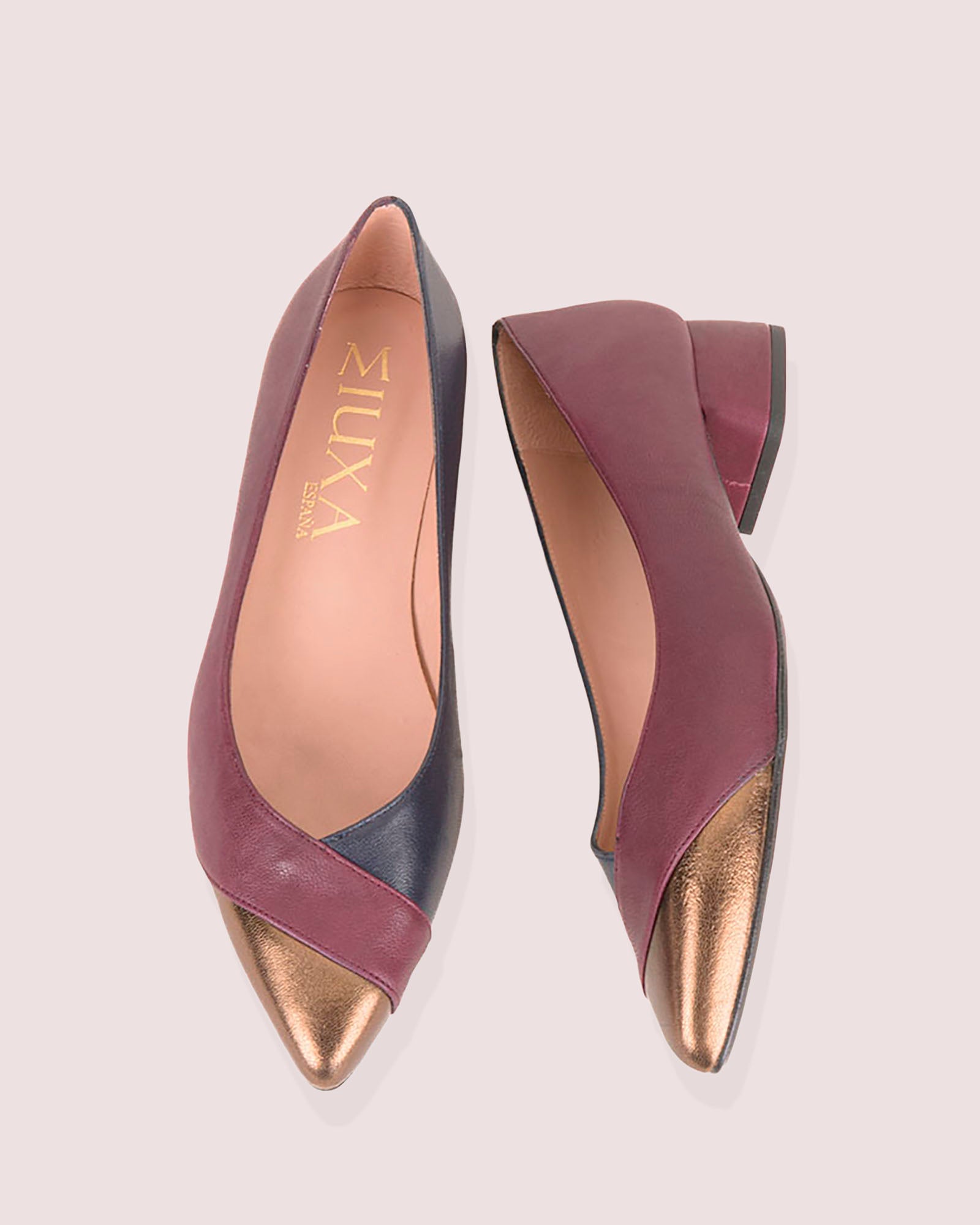 - Bailarina en piel con acabado natural color burdeos y marino.