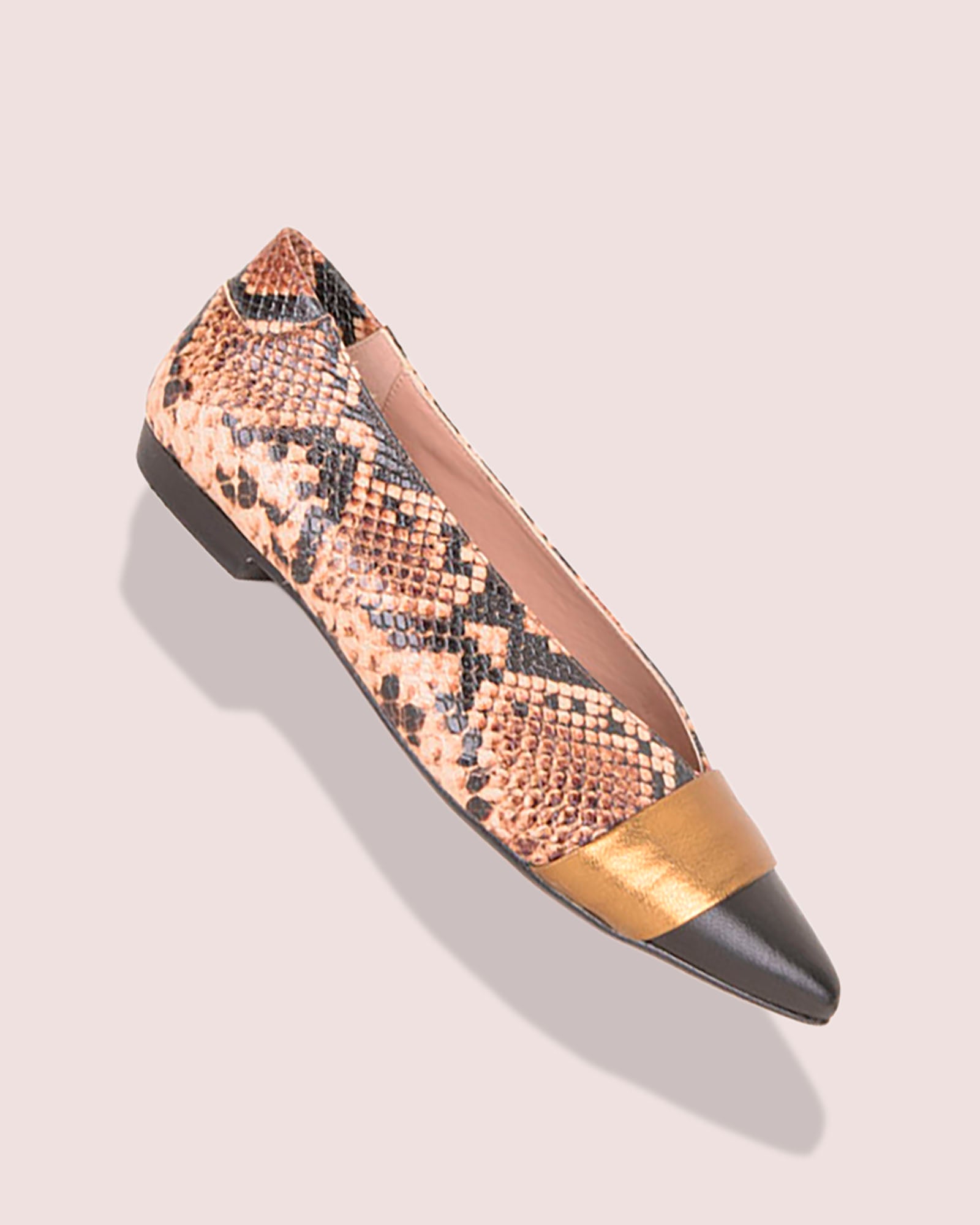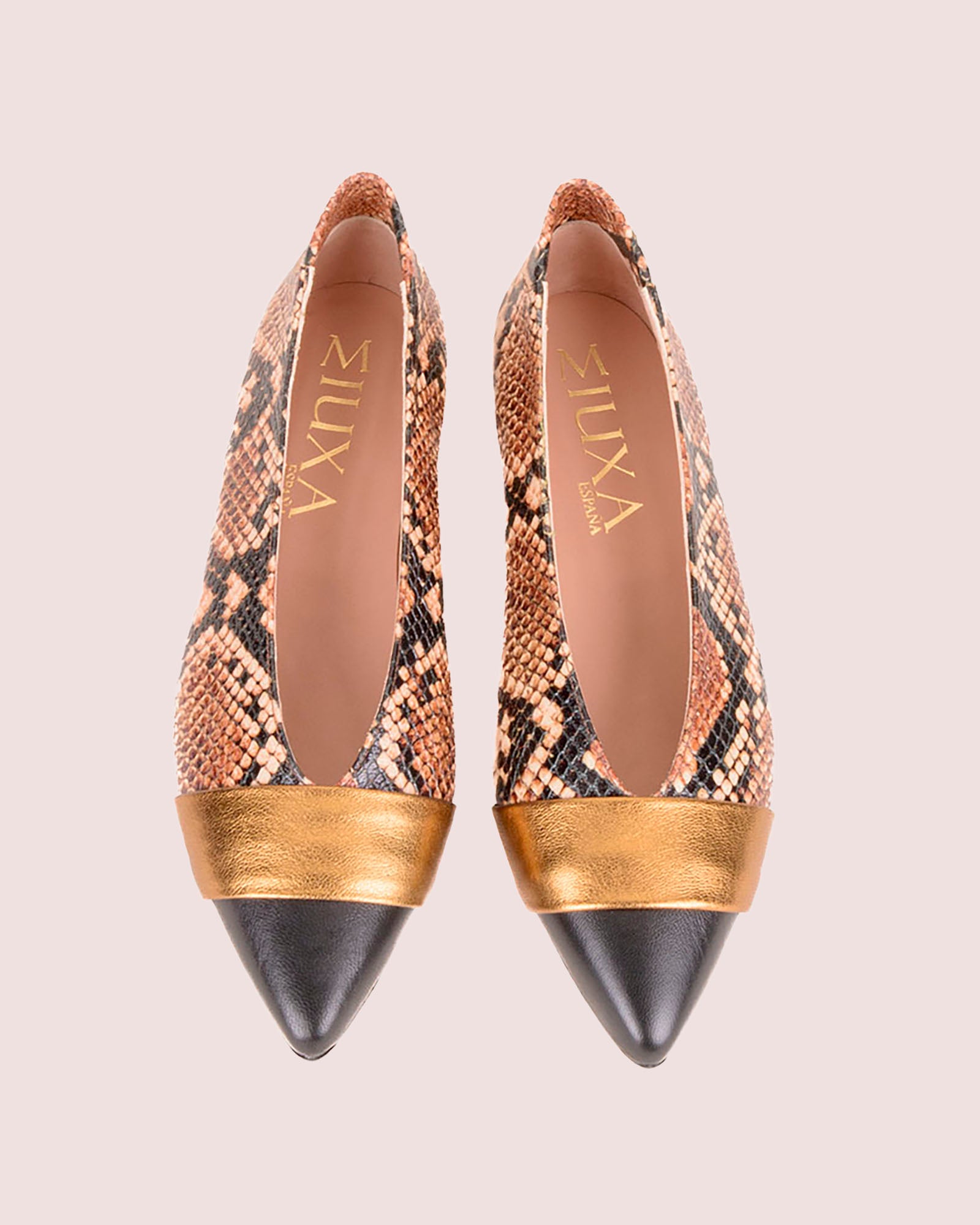 - Bailarina en piel con grabado de serpiente en tonos marrones.