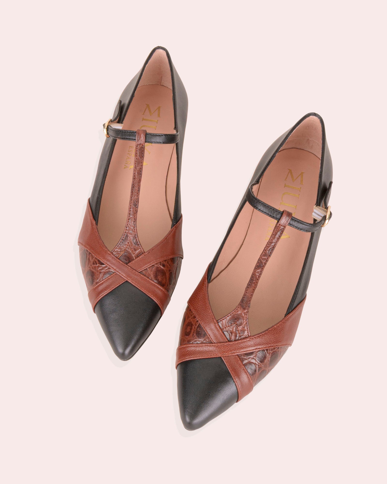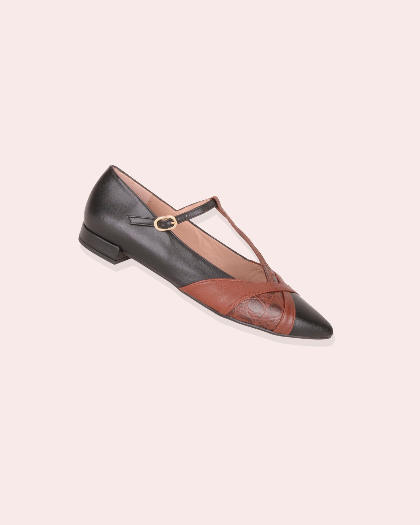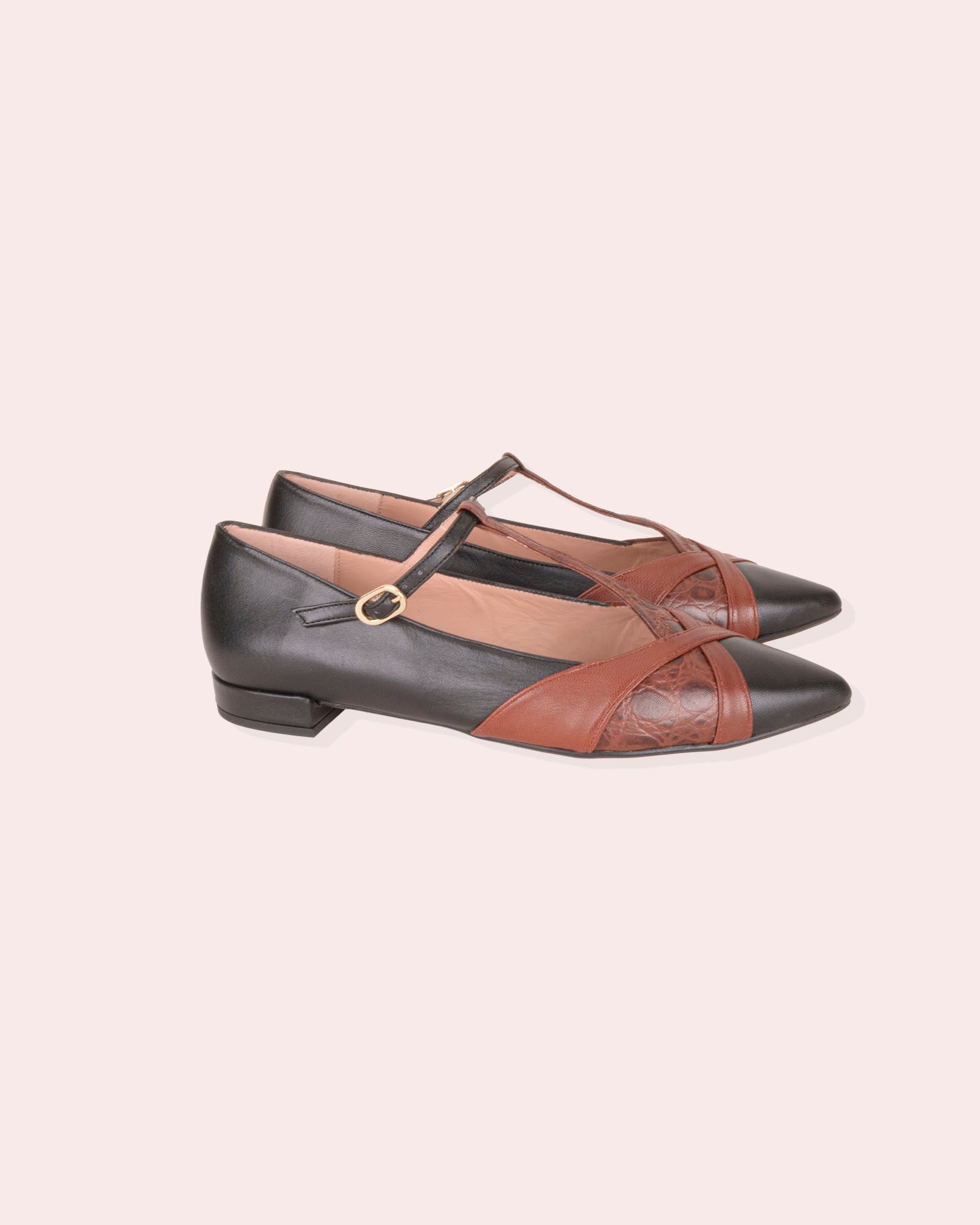 • Tras t-bar en piel color negro y piel con grabado en cocodrilo.