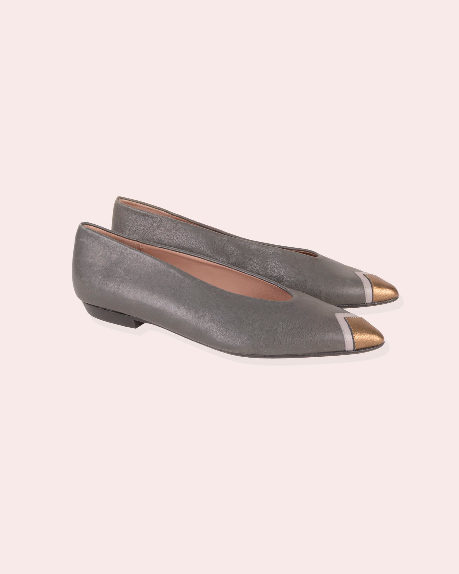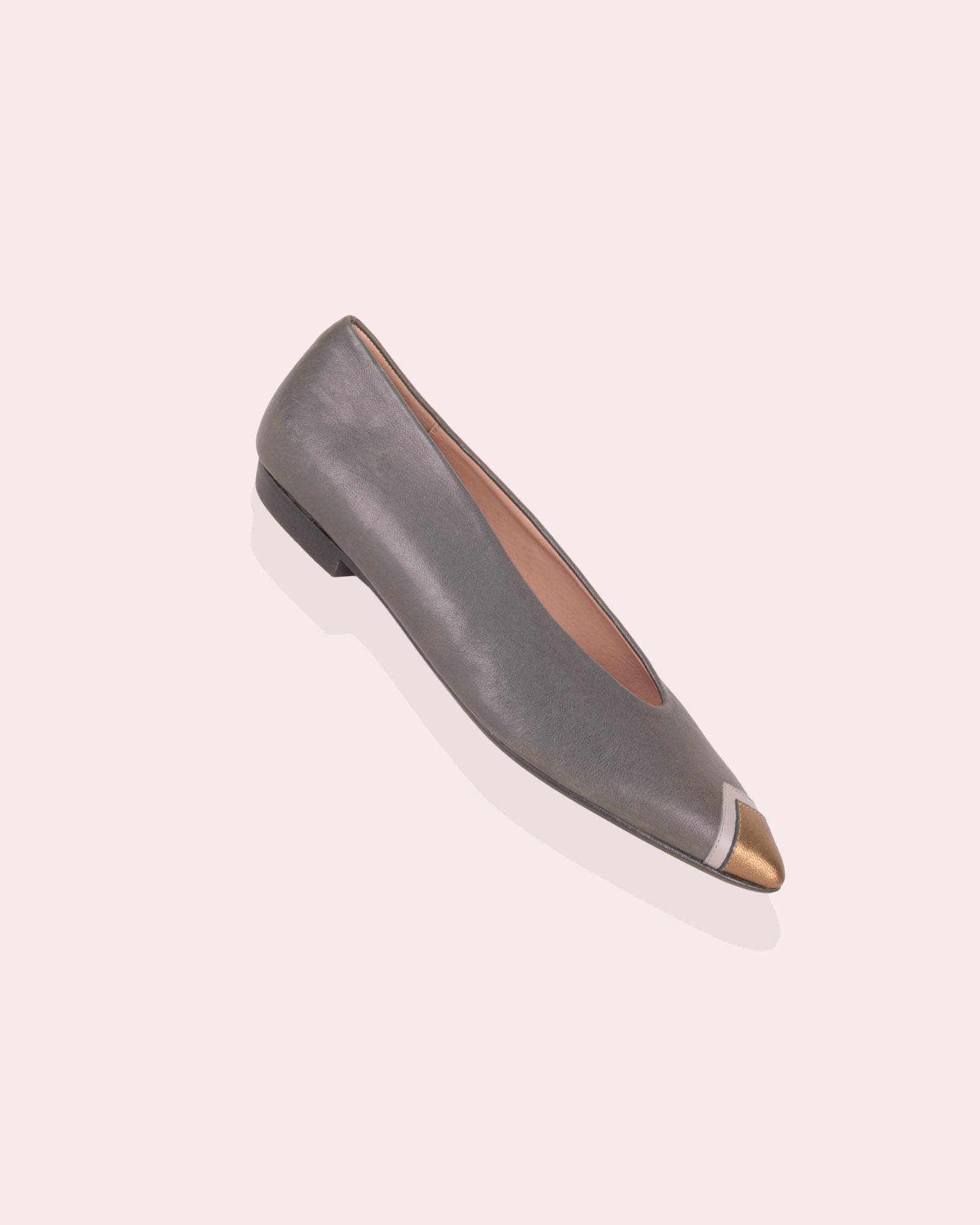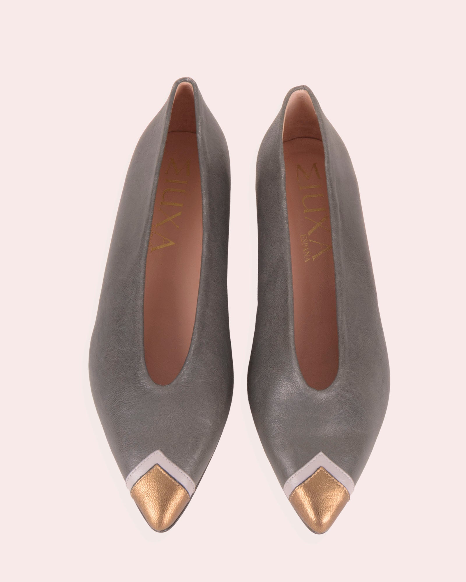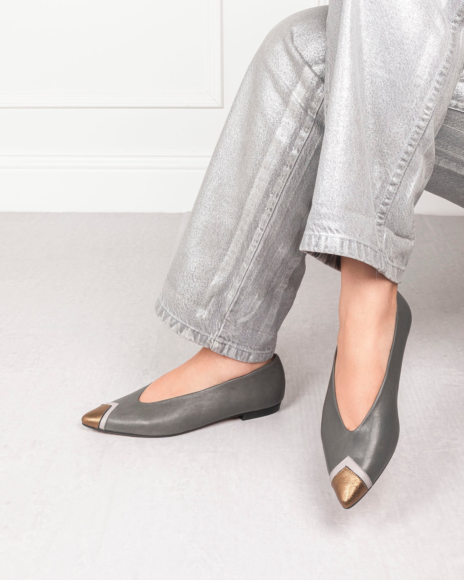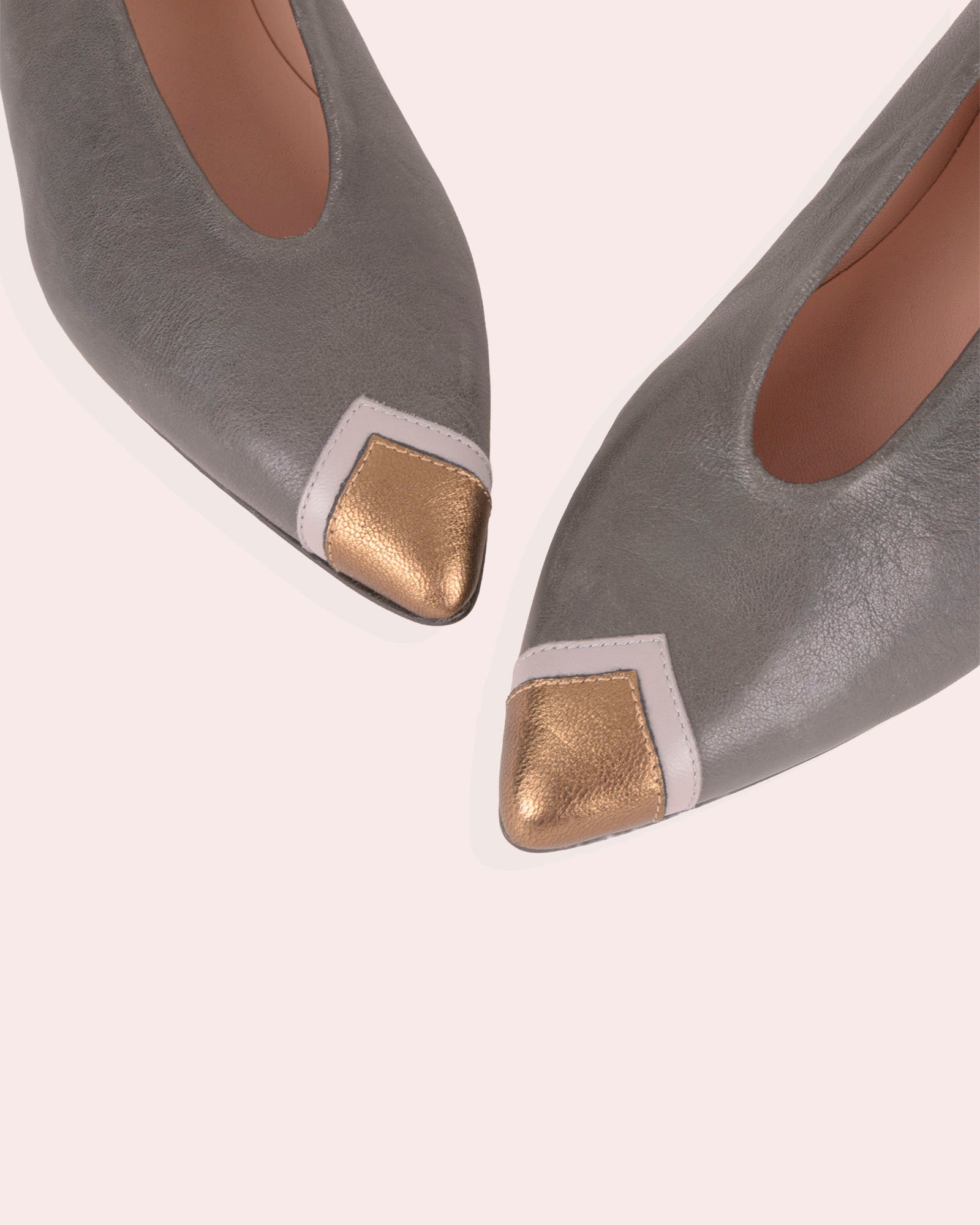 • Detalle de puntera en piel metalizada dorada y gris claro.