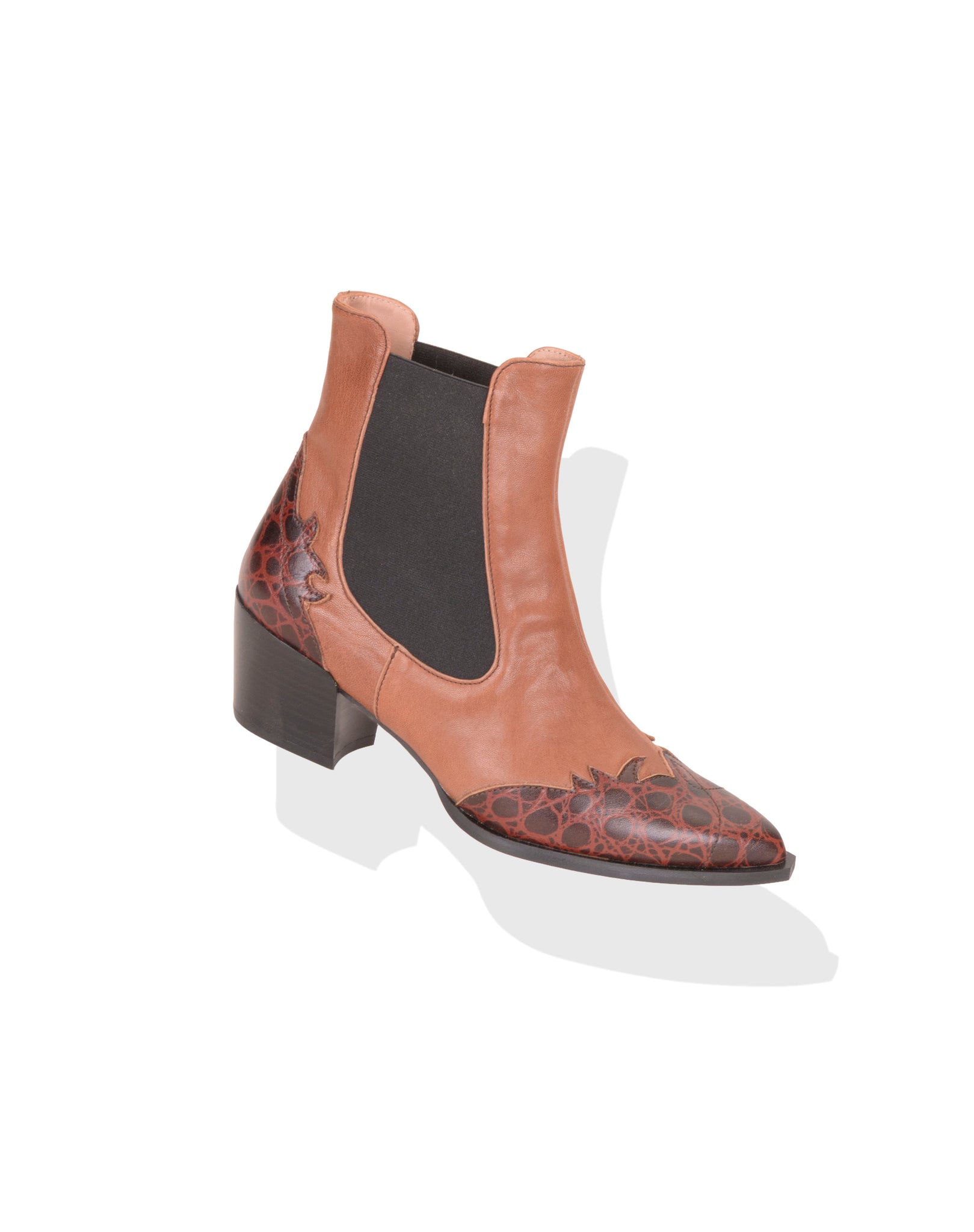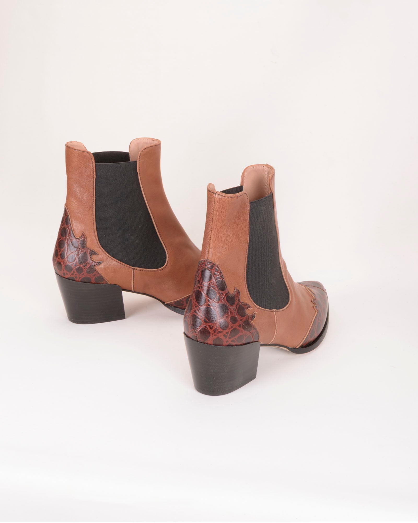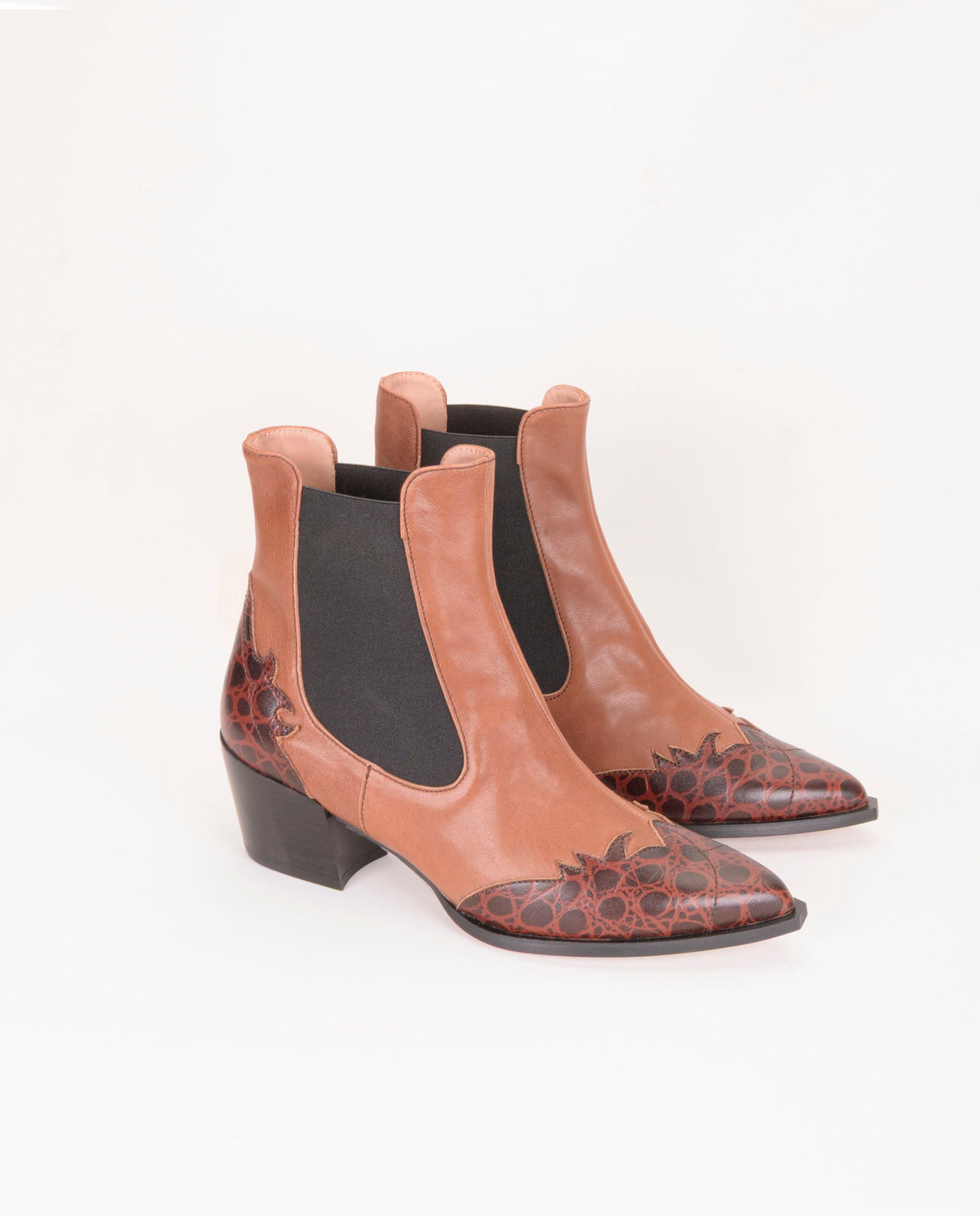 - Detalle de punta en piel con grabado en colodrillo marrón.