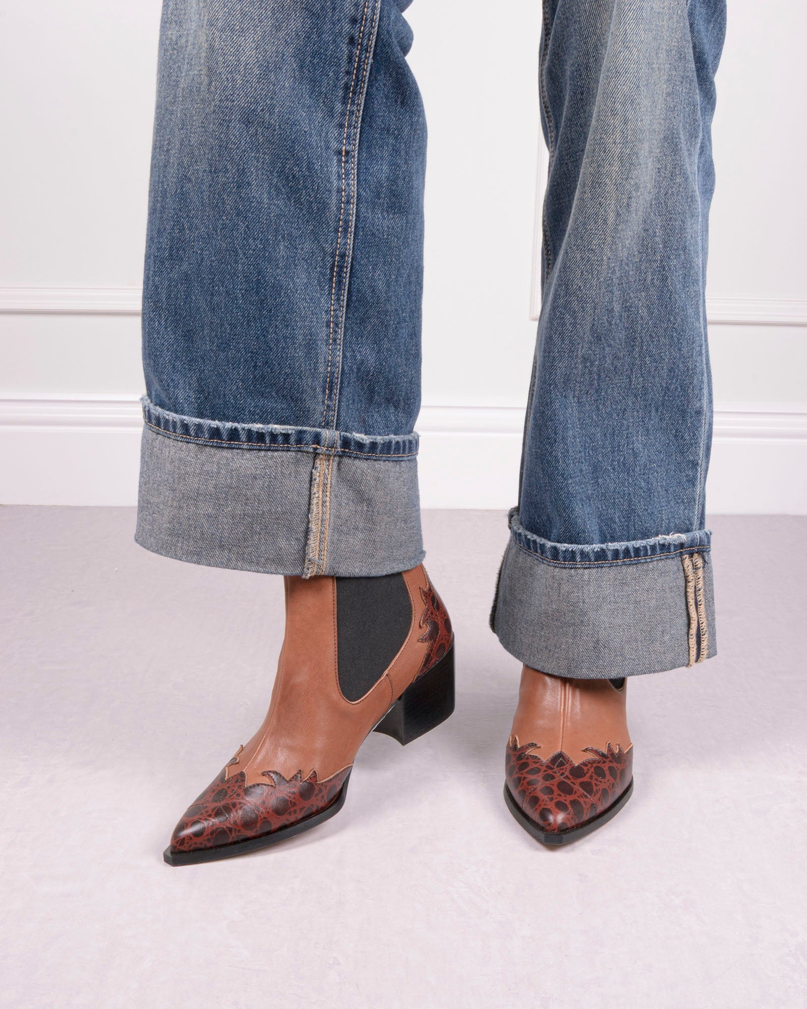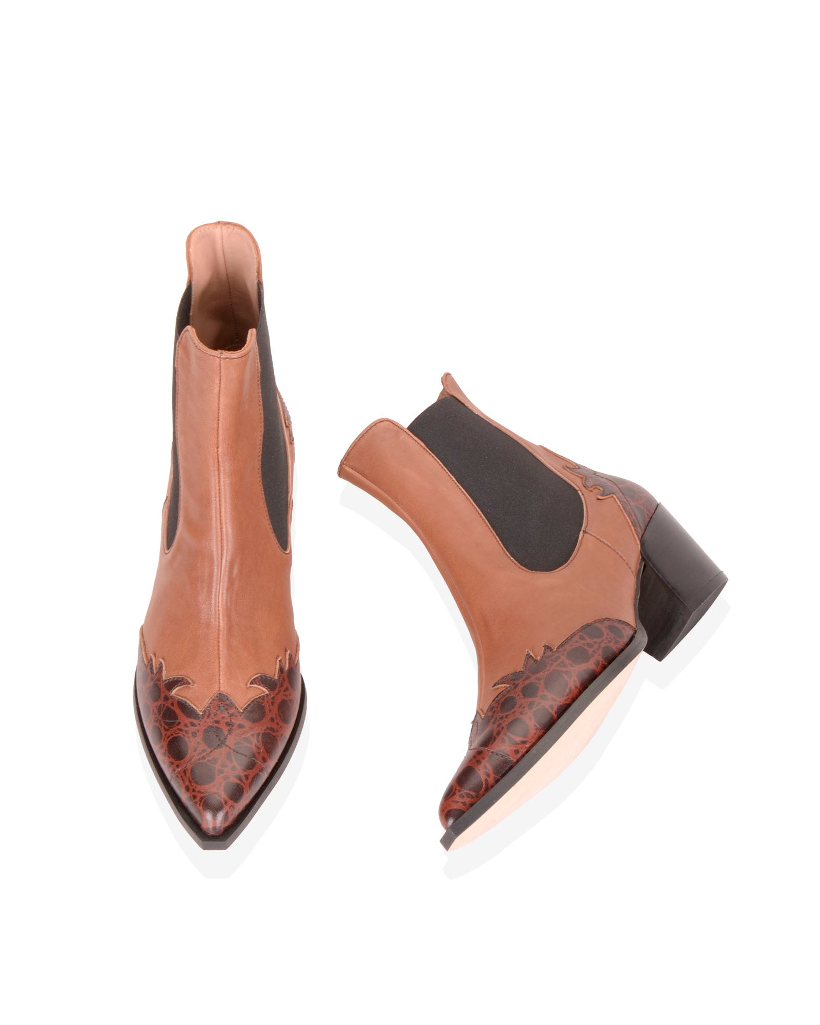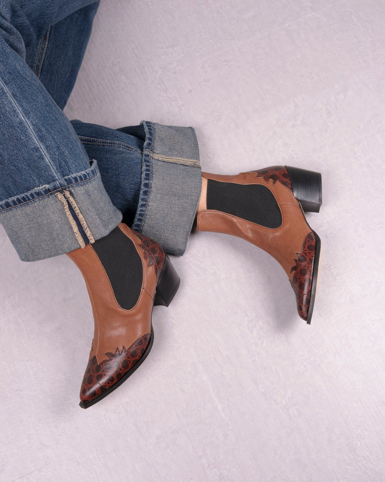 - Detalle de punta en piel con grabado en colodrillo marrón.