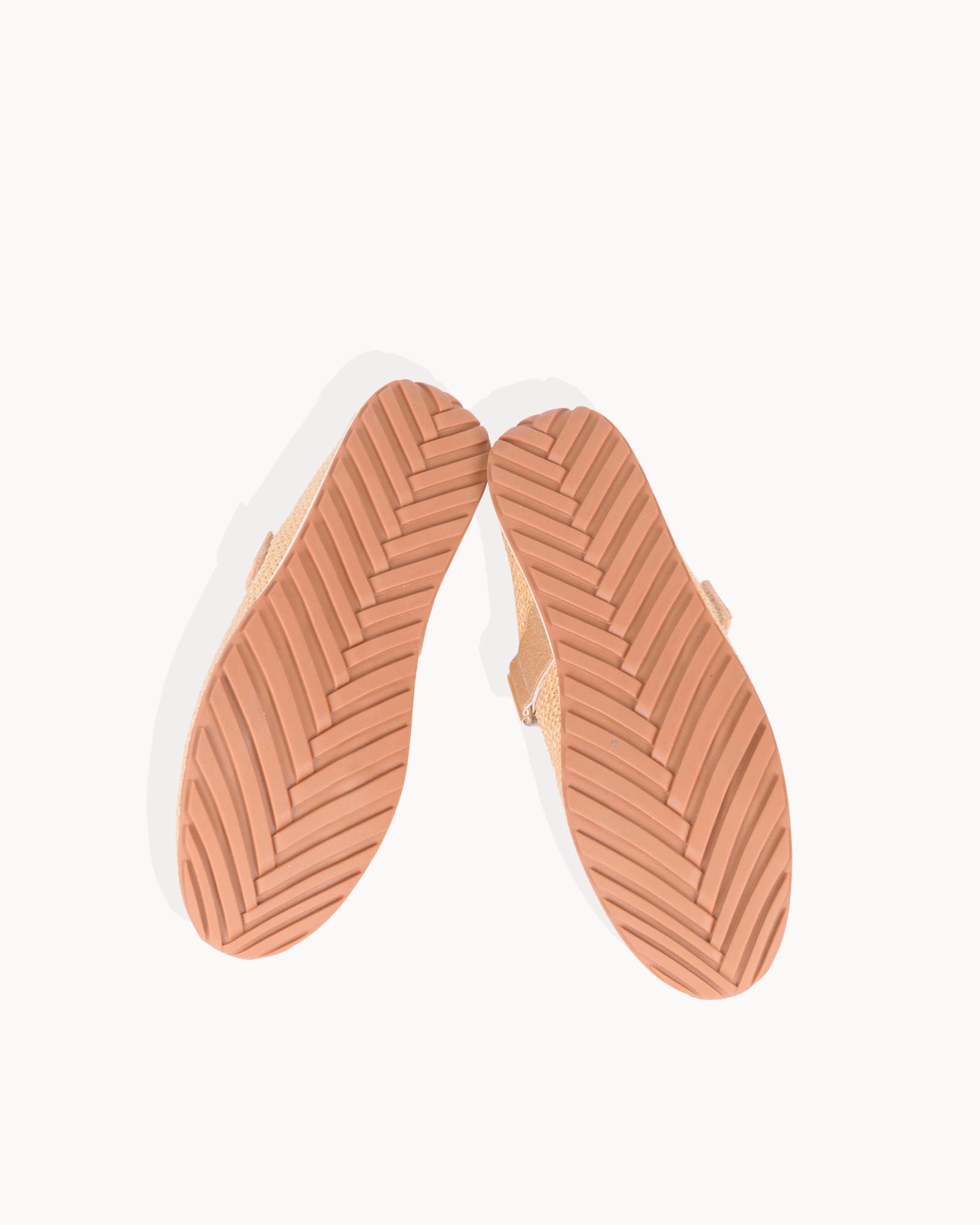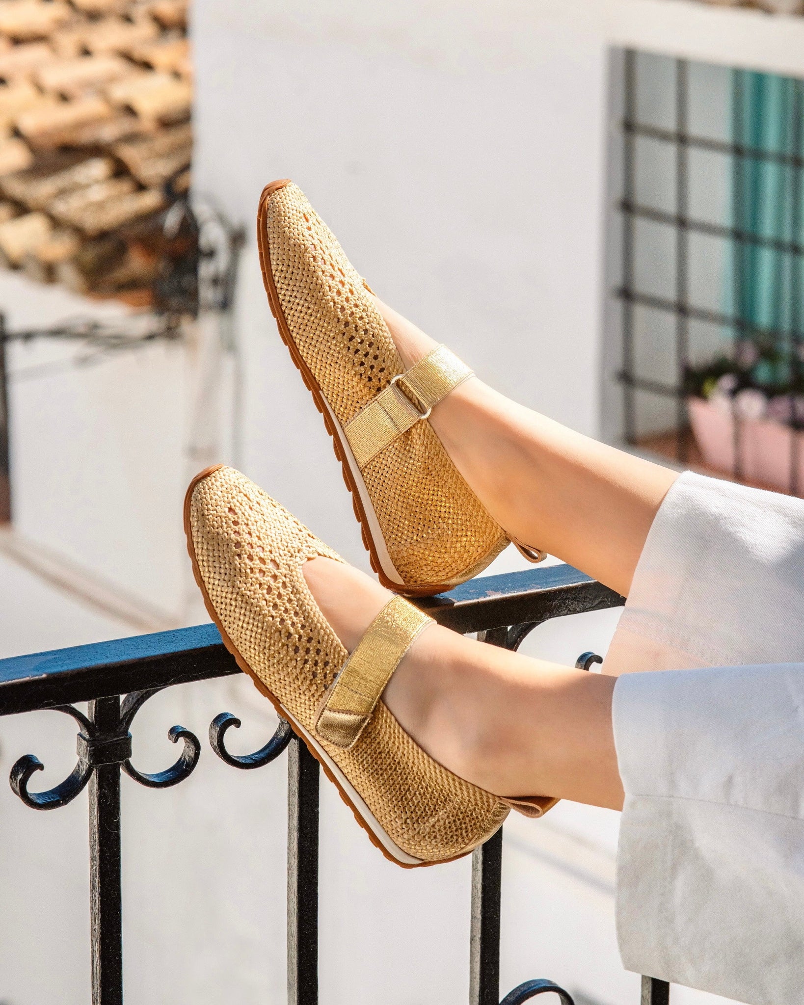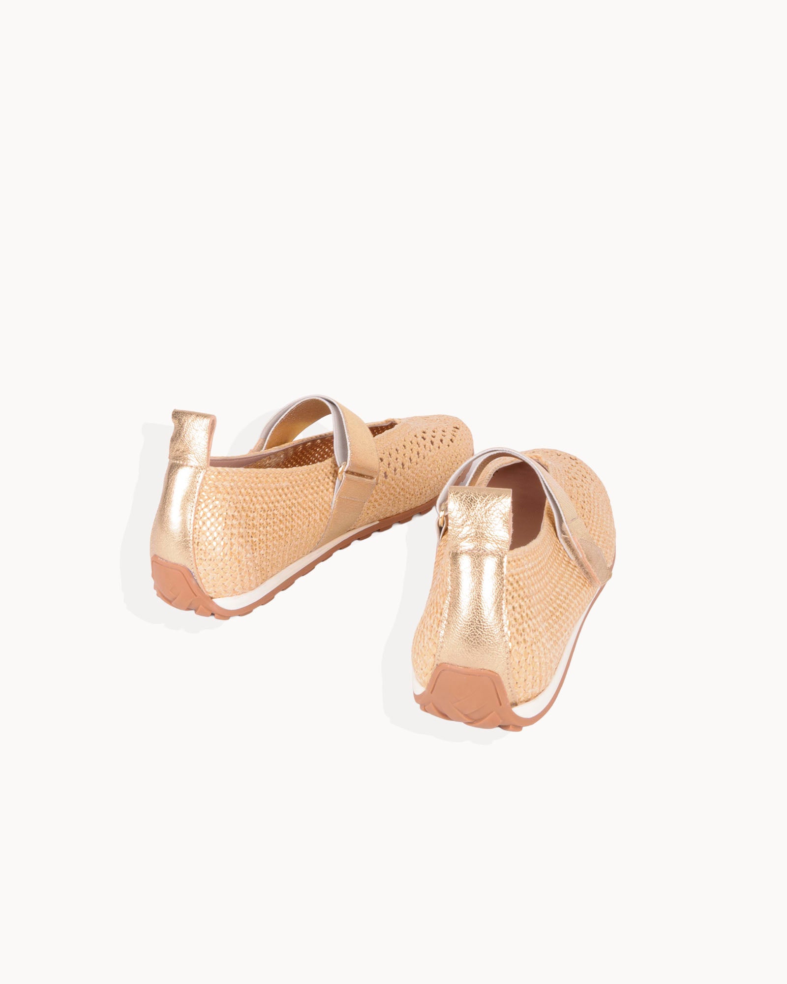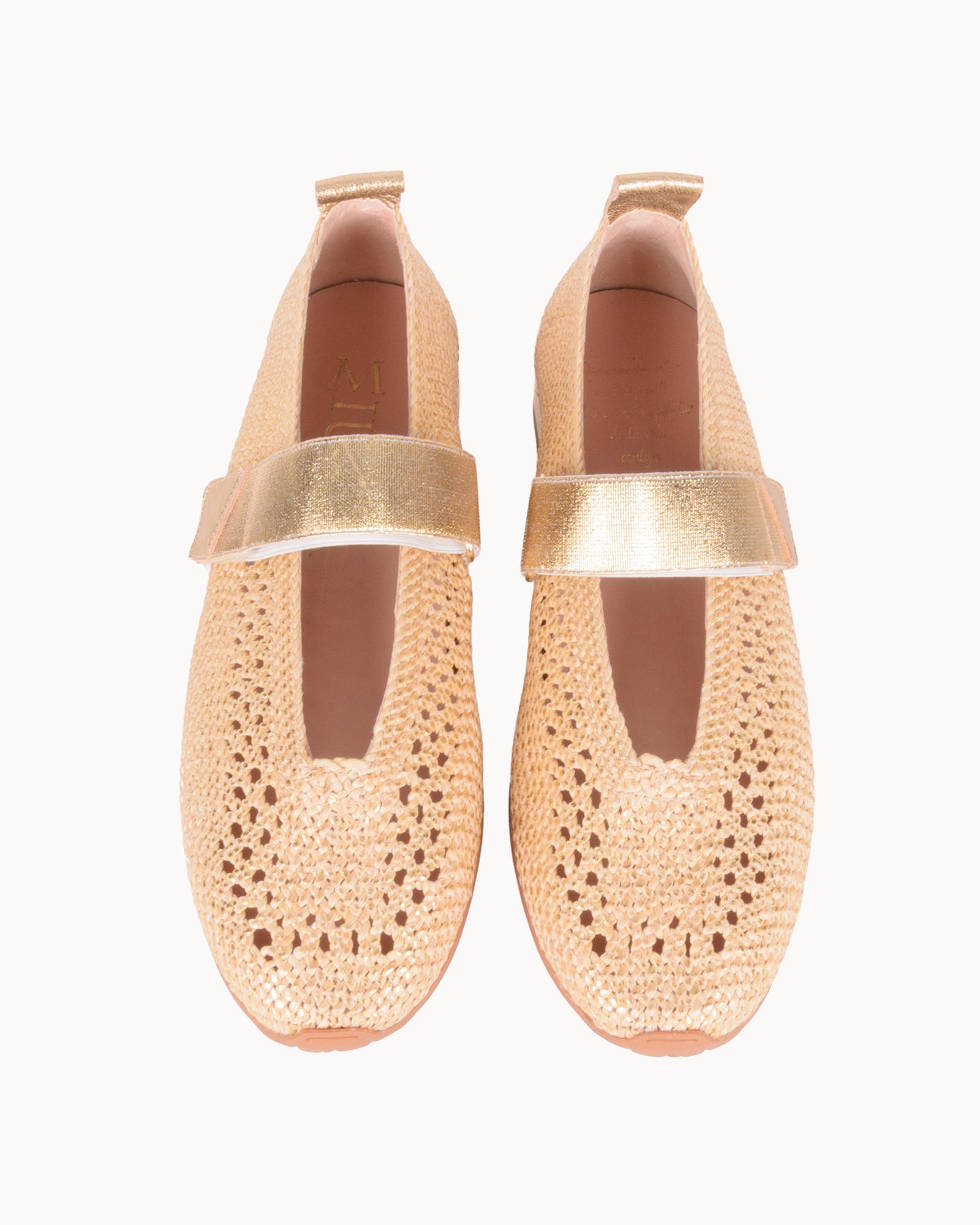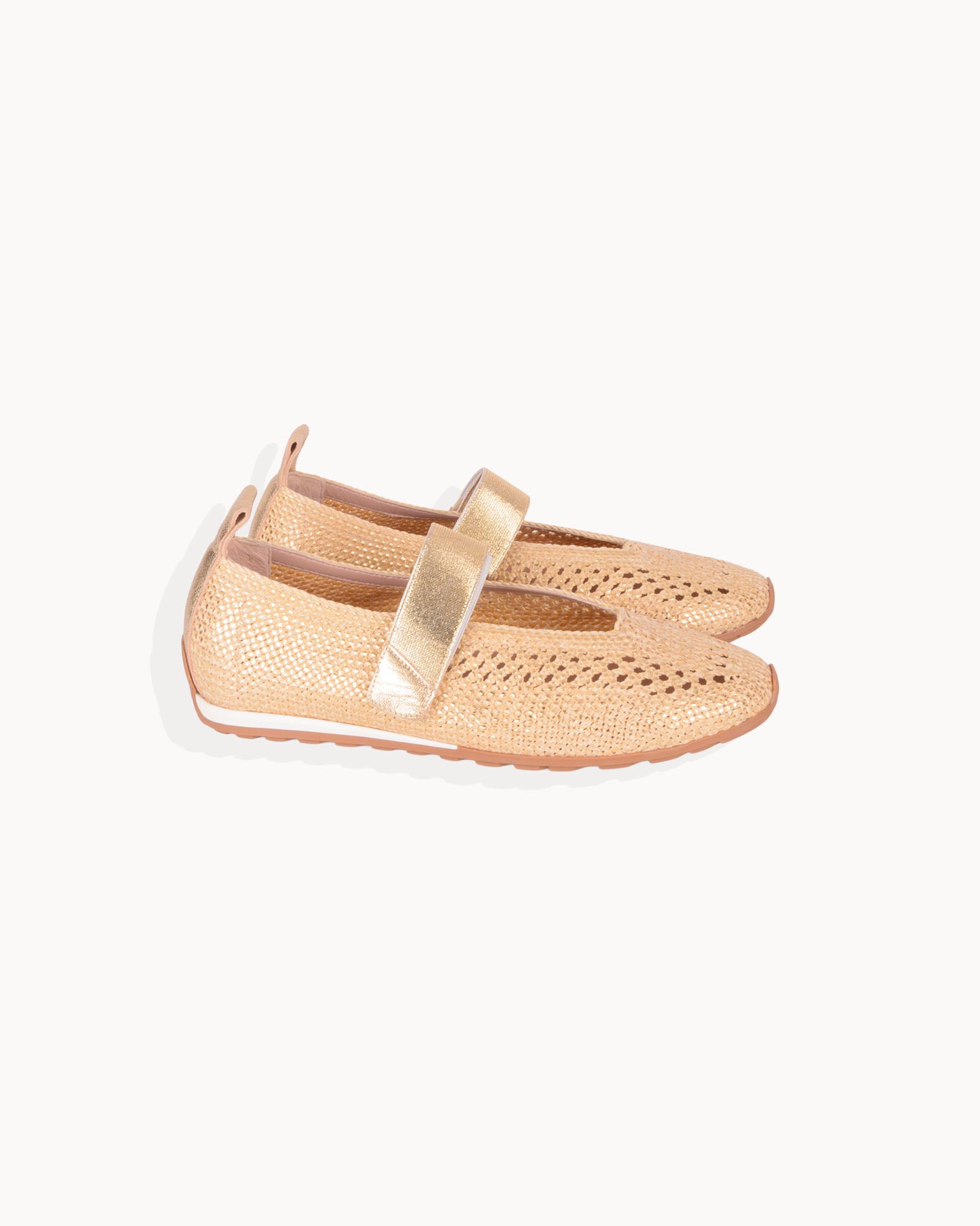 Bailarina deportiva en crochet y piel color oro. Cierre con goma elástica al tono. Plantilla de piel acolchada y suela de goma ligera.