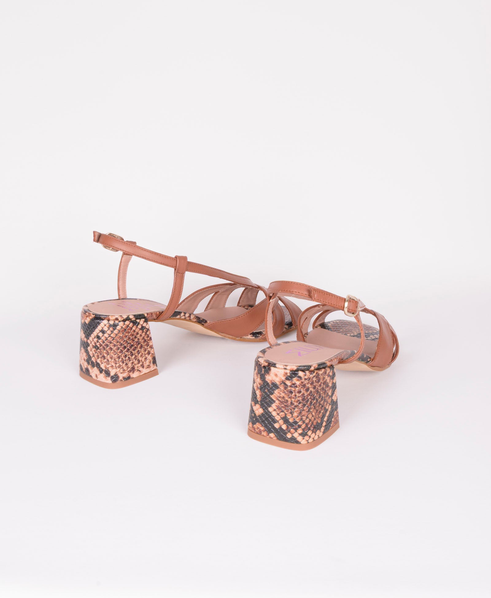 Sandalia en piel marrón combinada con piel grabada efecto serpiente en tonos marrones. Pala trabajada artesanalmente en piel marrón y cierre con hebilla dorada. Interior forrado en piel con plantilla acolchada. Tacón de 4,5cm forrado en piel grabada efecto serpiente y suela antideslizante.