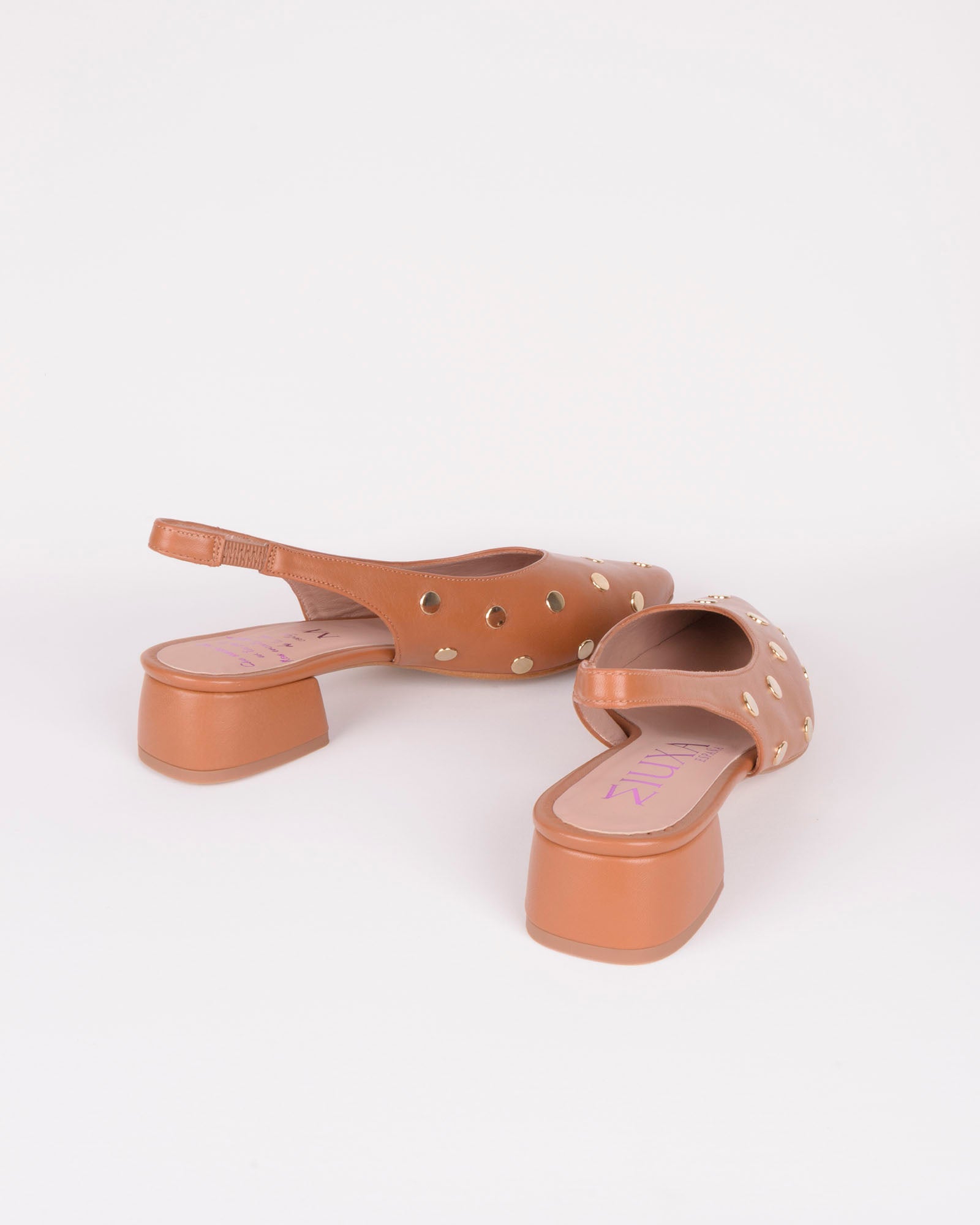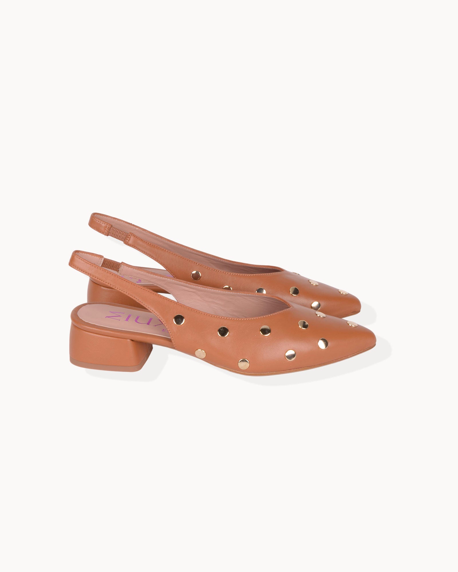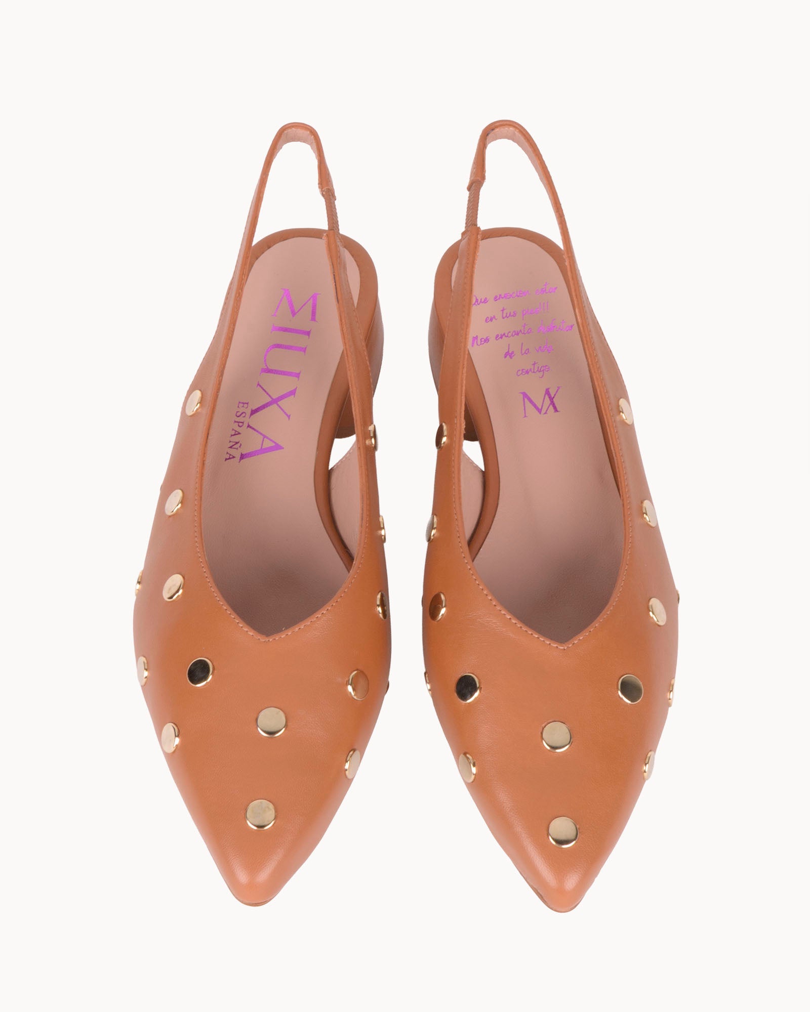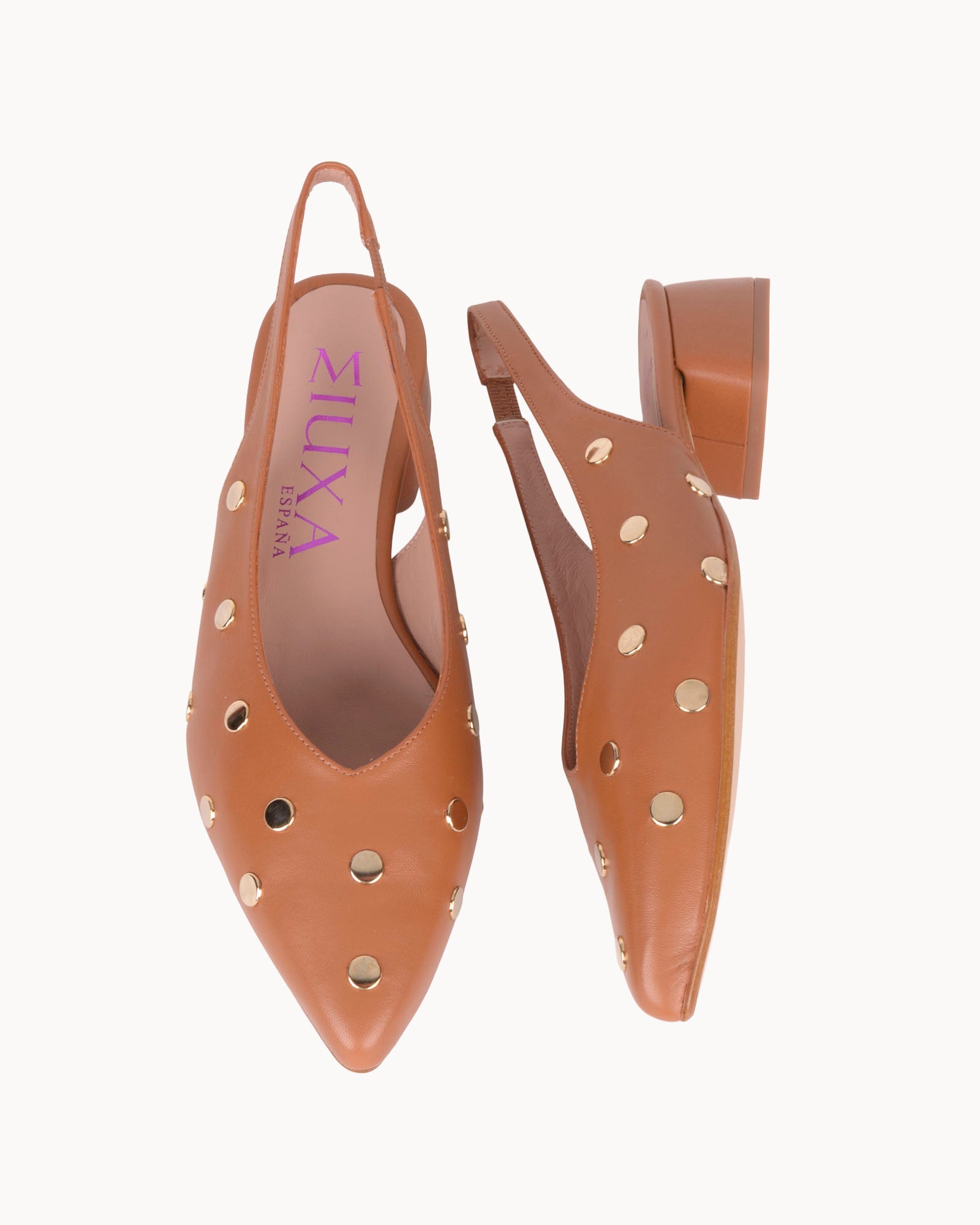 Bailarina destalonada en piel color camel. Detalle de tachas doradas. Interior forrado en piel con plantilla acolchada. Tacón de 3,5cm forrado en piel color camel y suela antideslizante.