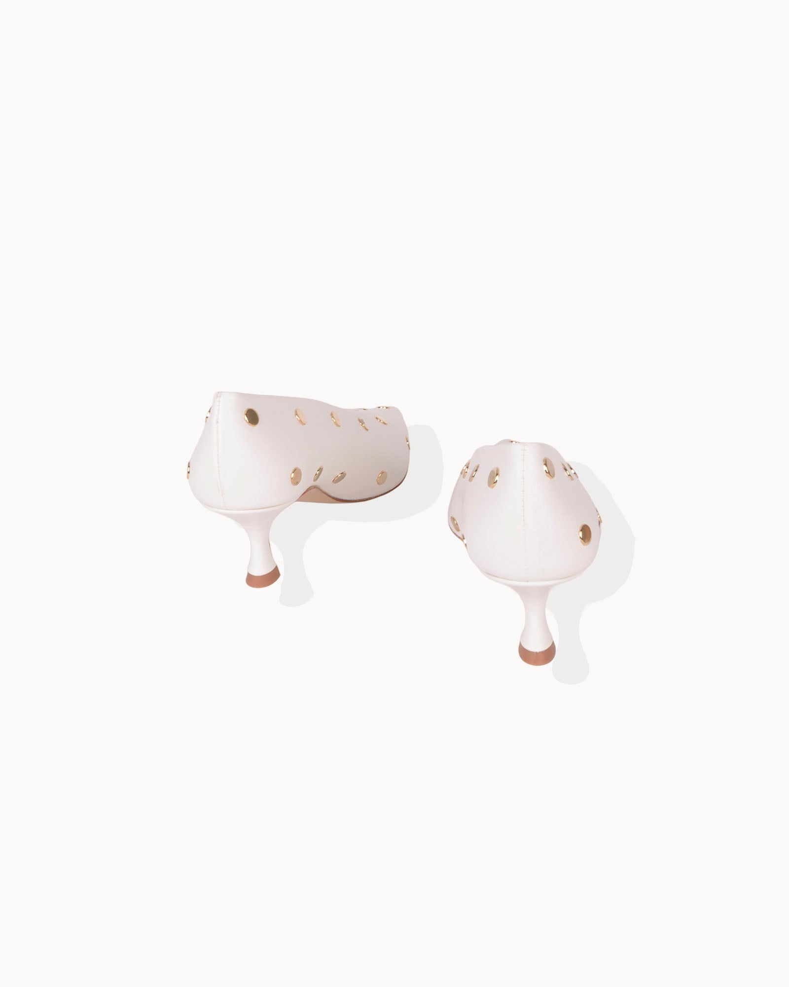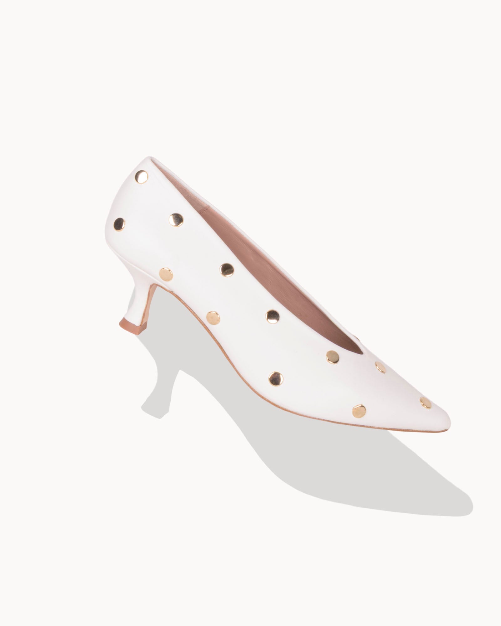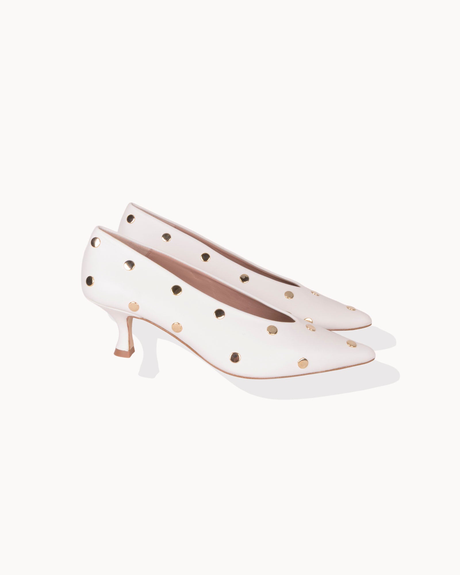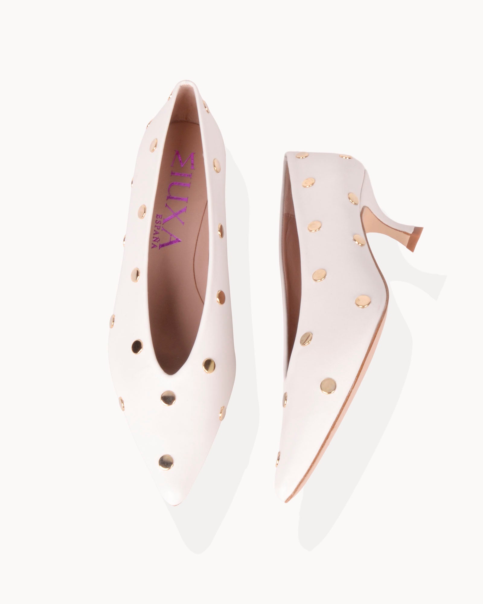 Salón en piel color blanco. Detalle de tachas doradas. Forro interior en piel con plantilla acolchada. Tacón de 4,5cm forrado en piel color blanco y suela antideslizante.