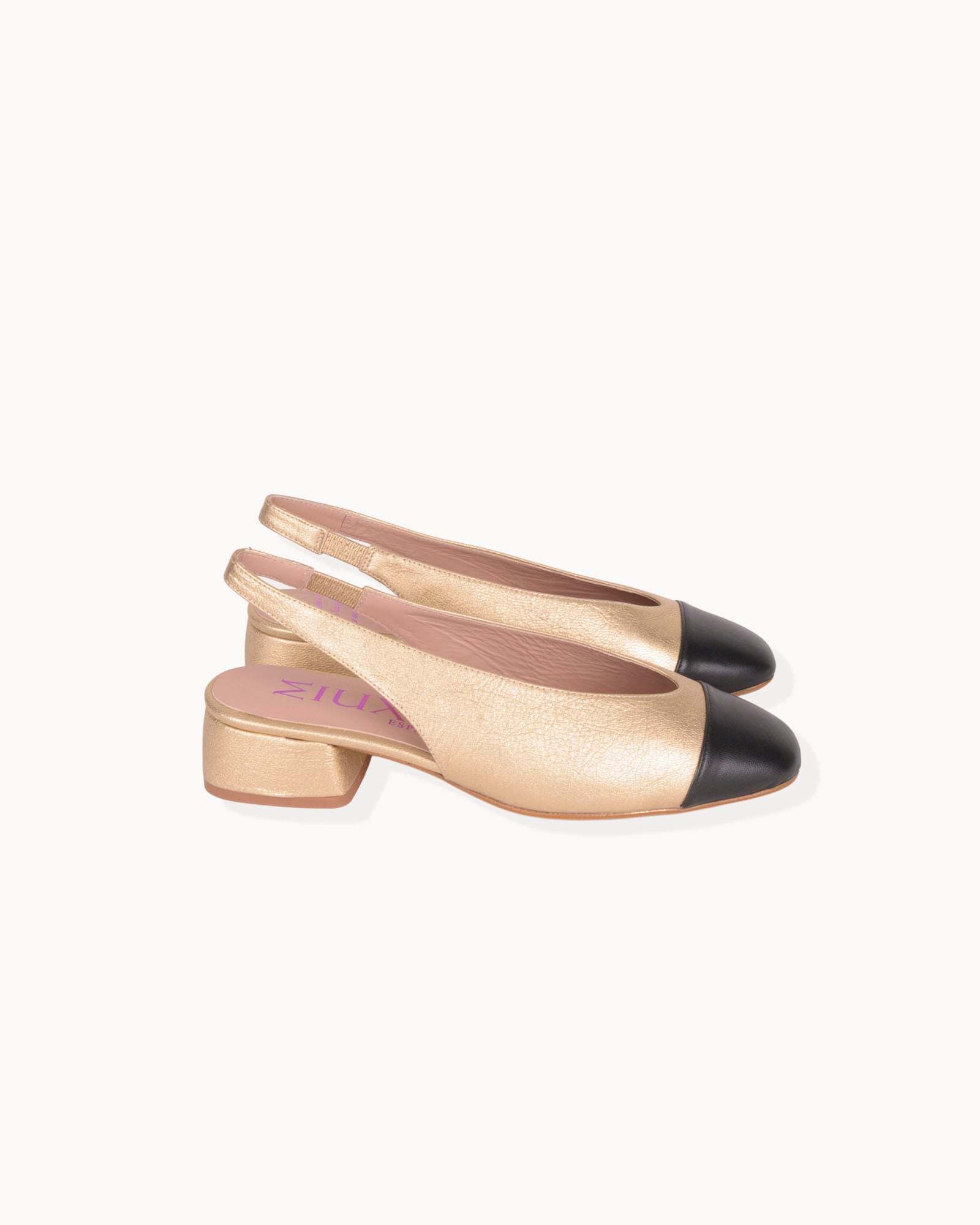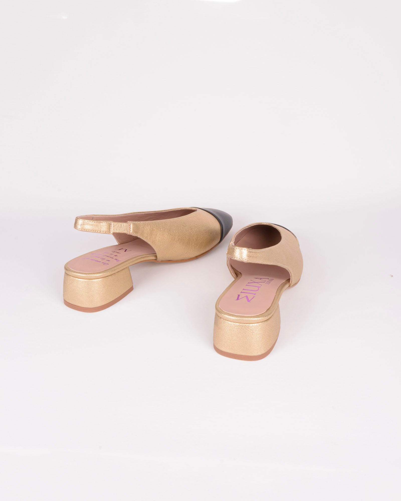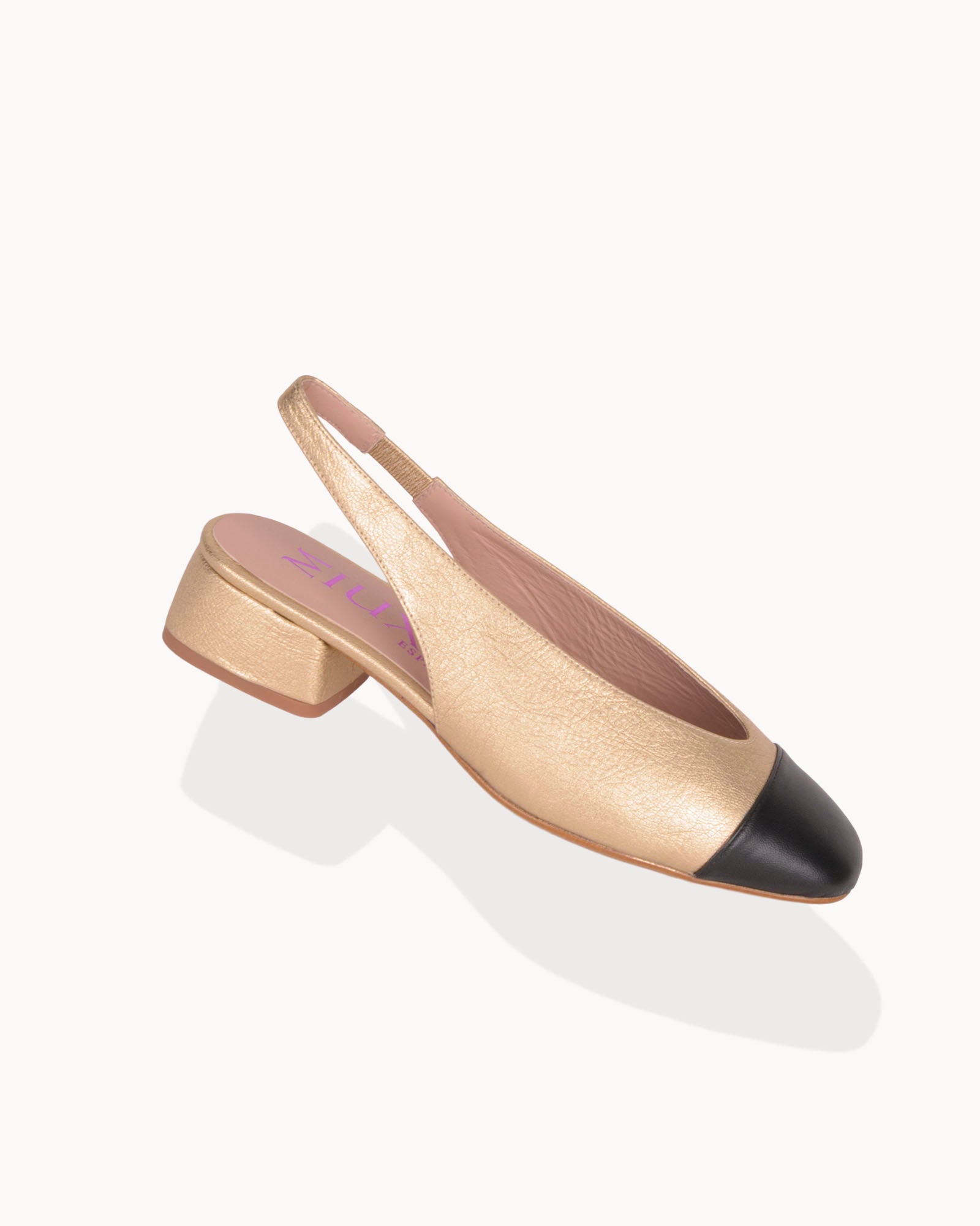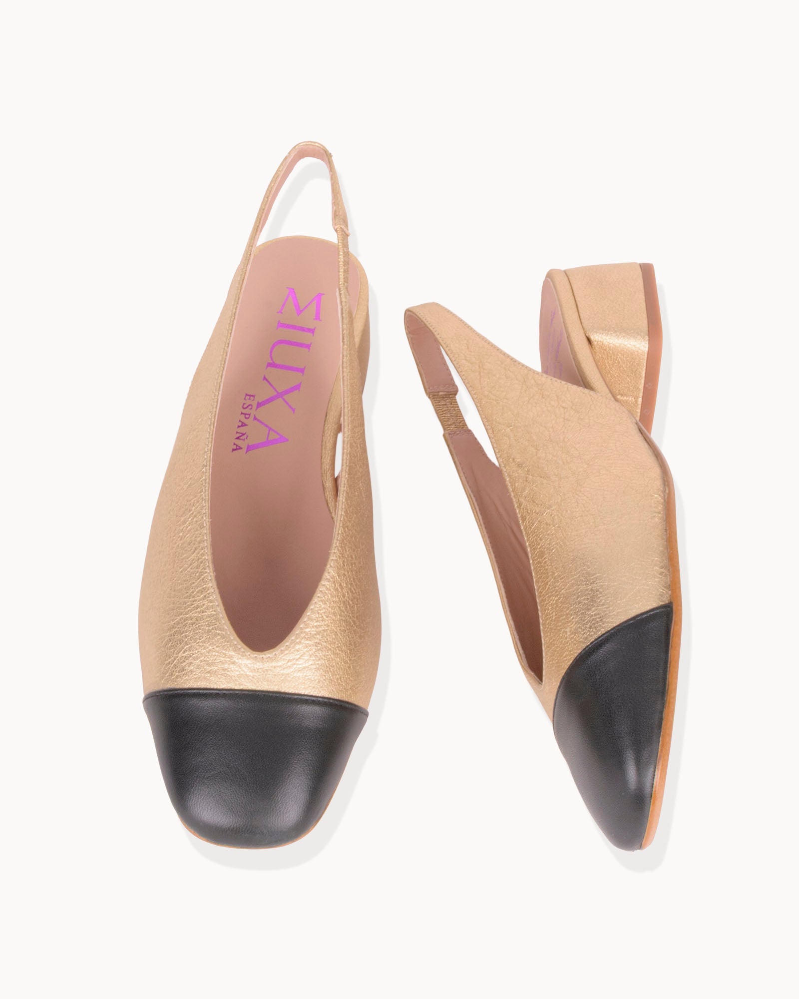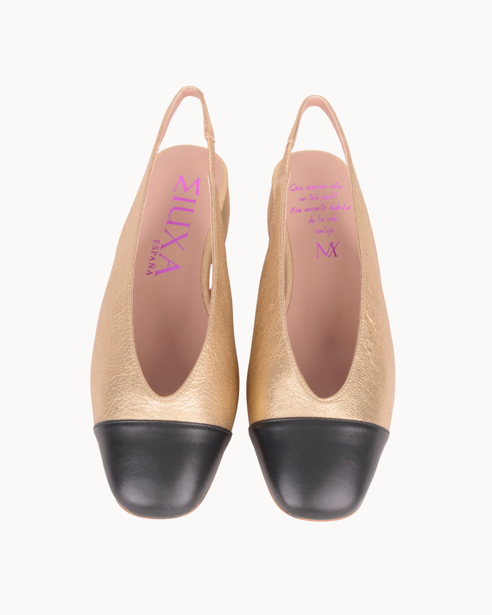 Bailarina destalonada en piel metalizada color oro. Detalle de puntera en piel negra. Interior forrado en piel con plantilla acolchada. Tacón de 3,5 cm forrado en piel metalizada color oro y suela antideslizante.