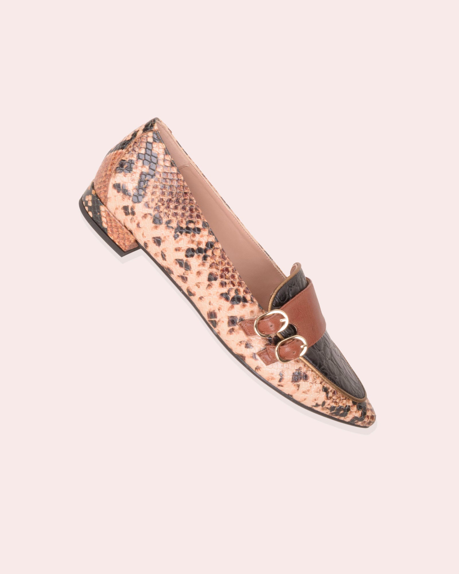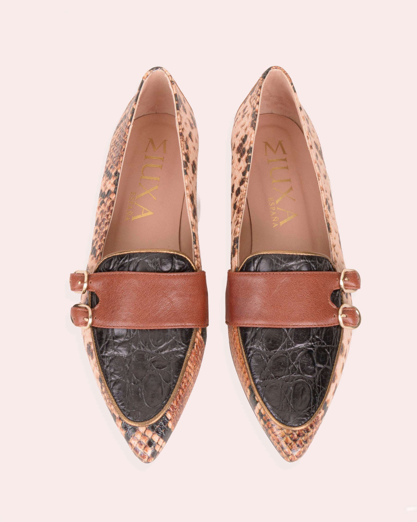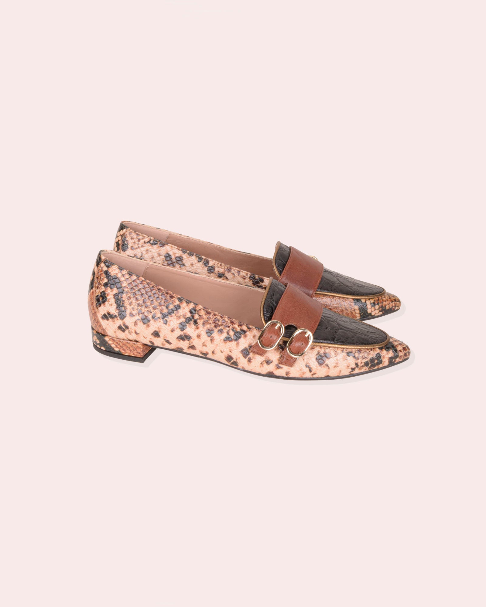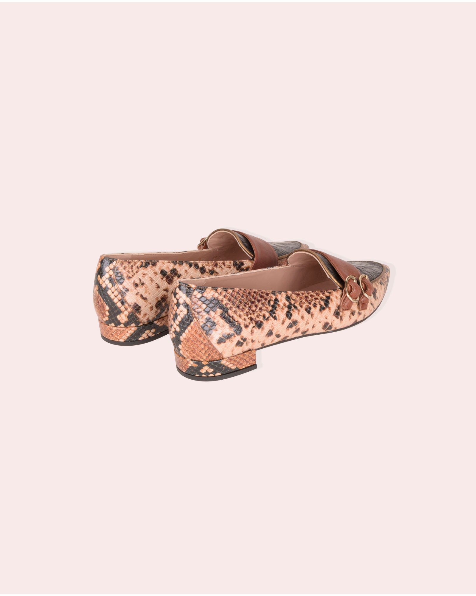 - Mocasín en piel con grabado de serpiente en tonos marrones.