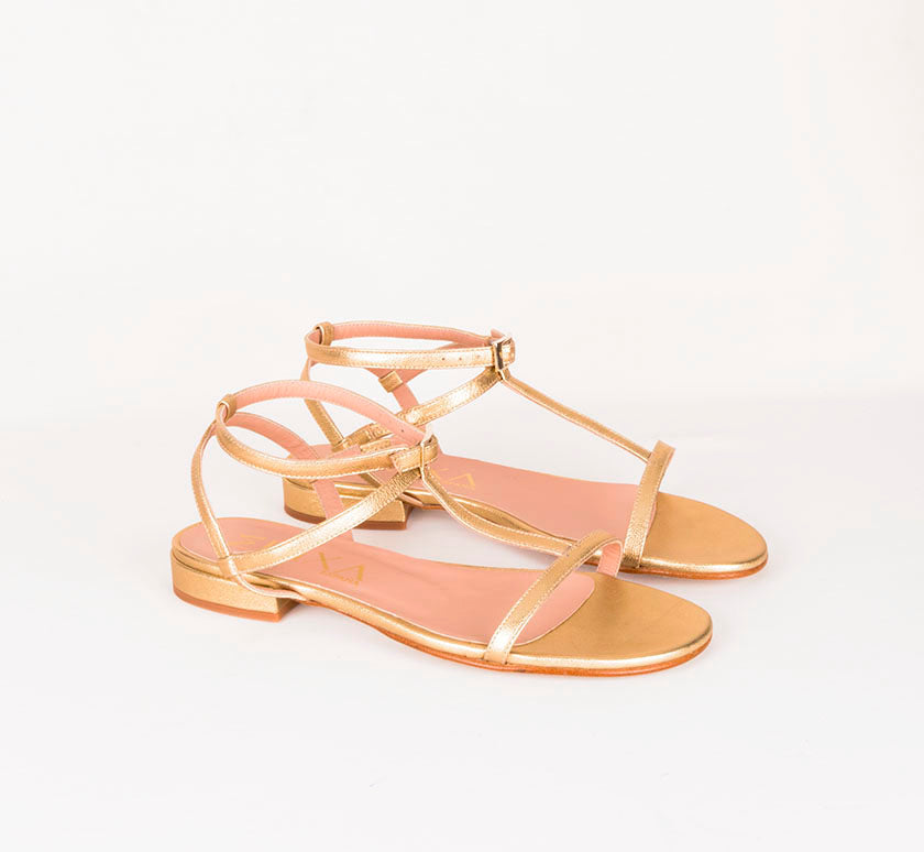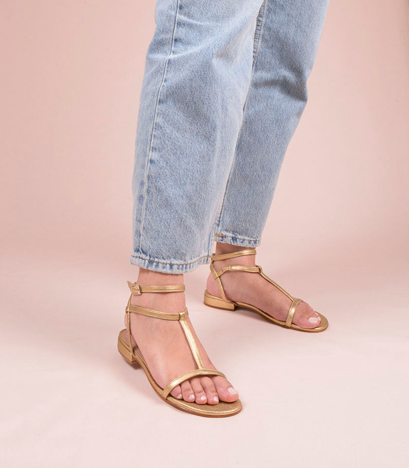 Sandalia plana fabricada en piel suave color dorado. Forro interior en piel. Plantilla de piel acolchada. Tacón de 1,5cm de altura, forrado en piel. Suela antideslizante.