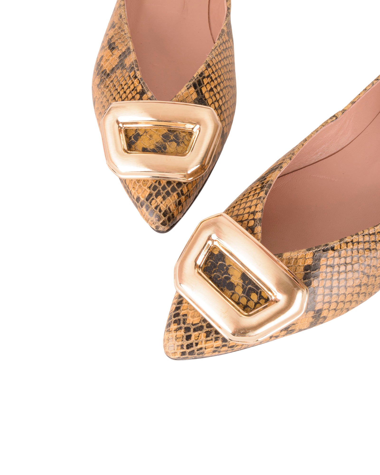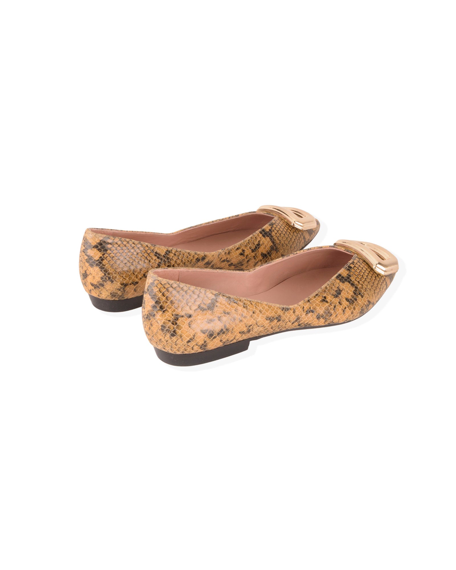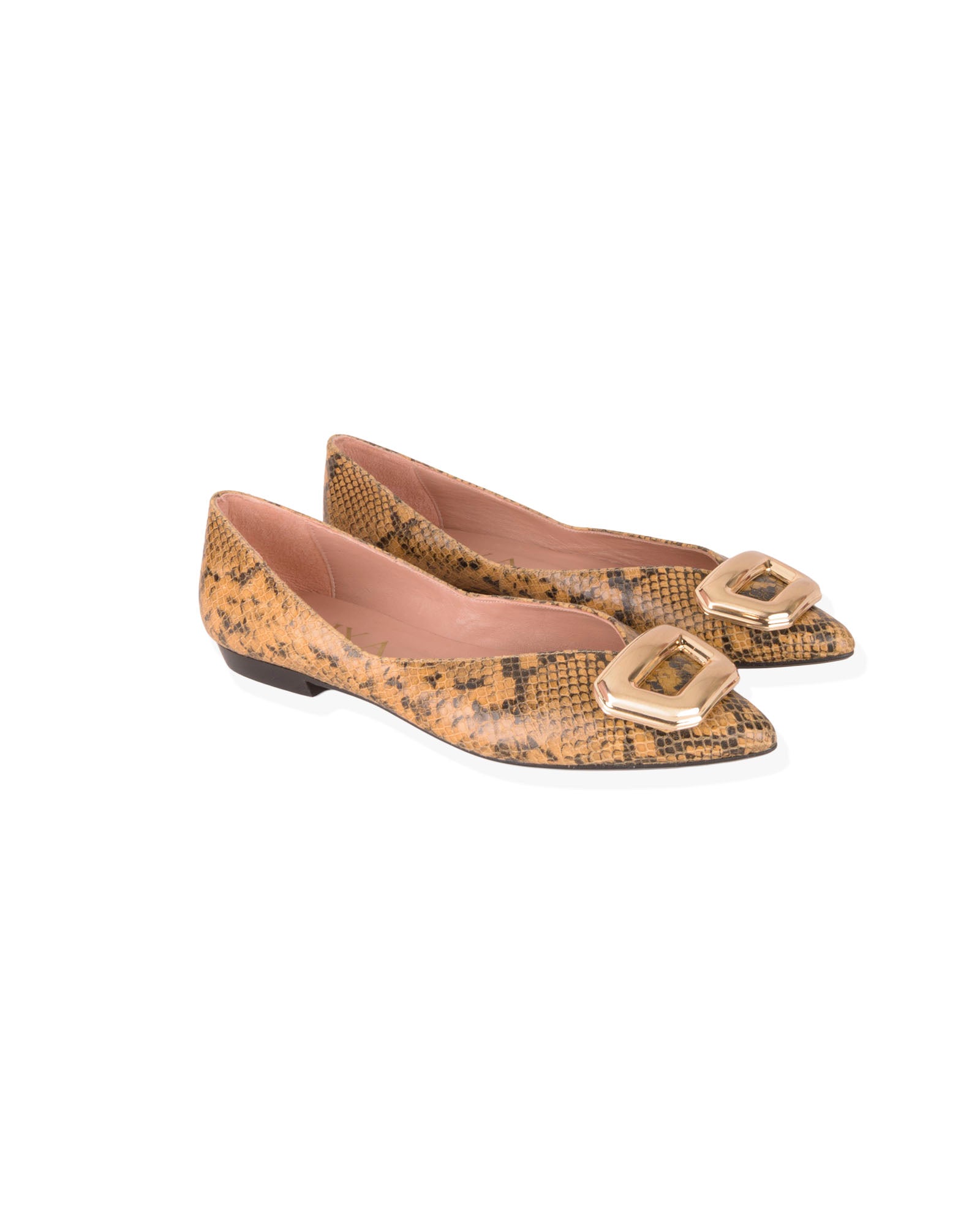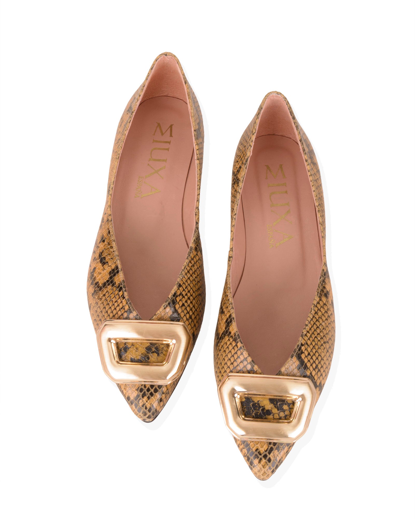 Bailarina en piel laminada serpiente color mostaza y negro . Detalle de adorno dorado. Forro interior piel. Plantilla de piel acolchada. Tacón de 1,5 cm de altura. Suela antideslizante.