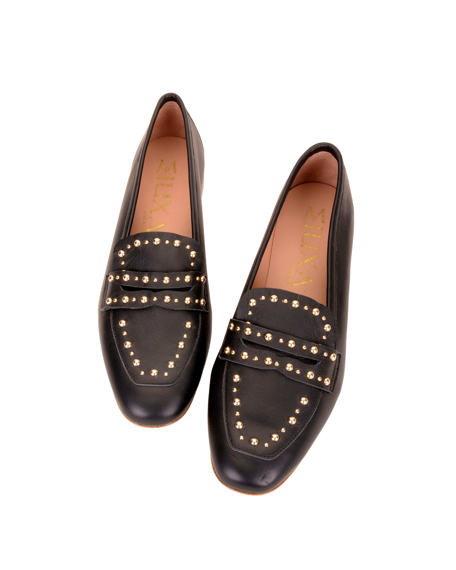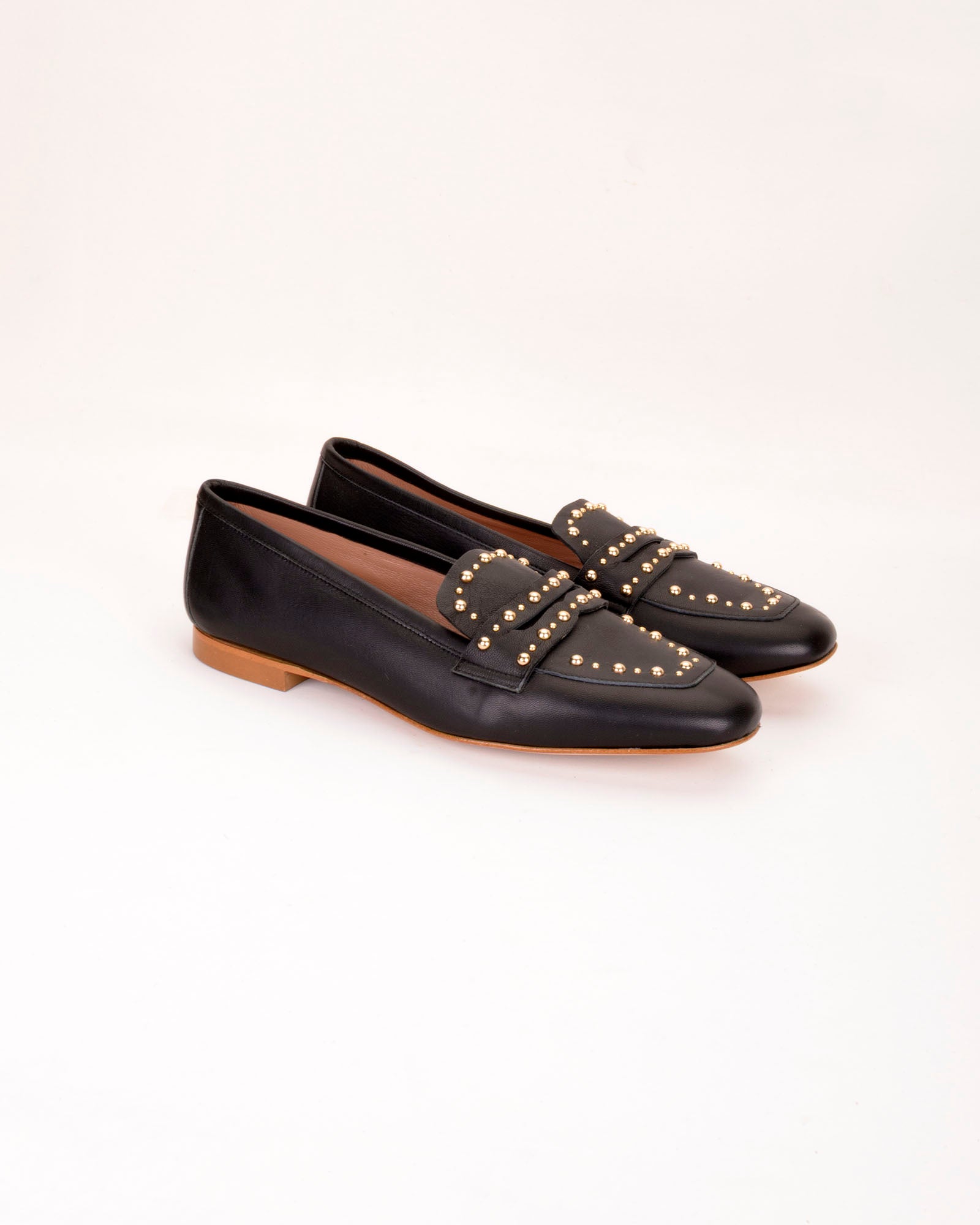 Mocasín en piel suave color negro. Detalle mini tachas doradas. Forro interior piel. Plantilla de piel acolchada. Tacón de 1,5cm. Suela antideslizante.