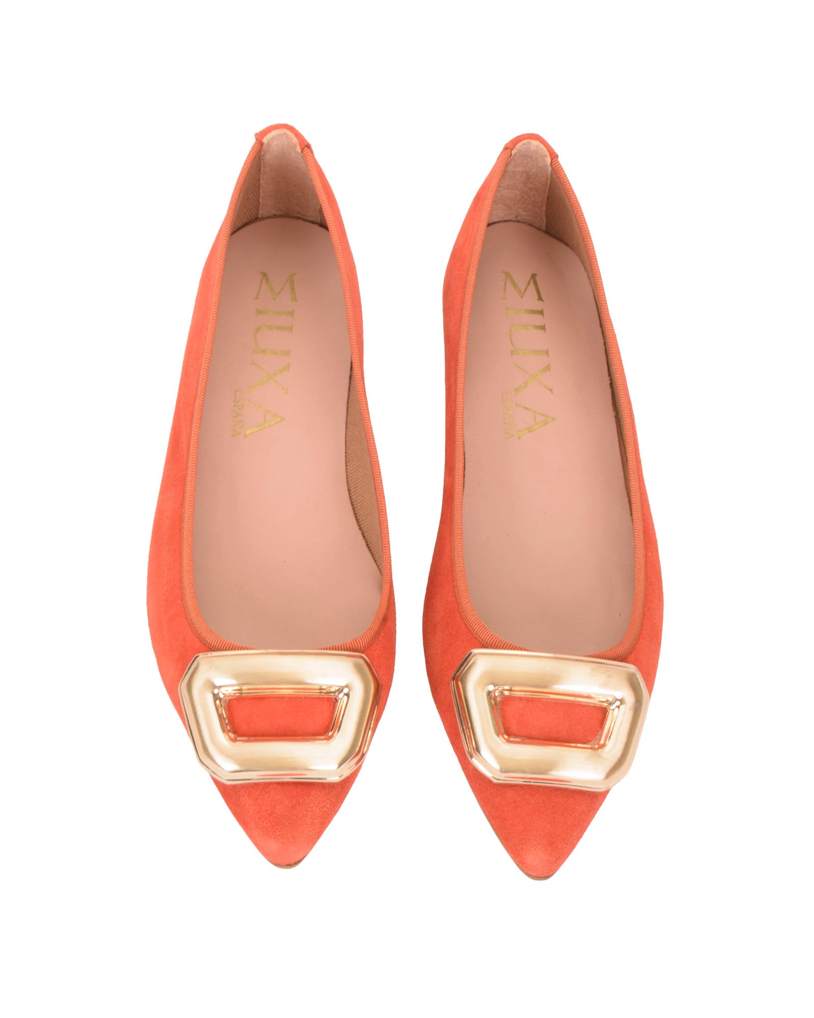 Bailarina en ante muy suave color naranja. Detalle de adorno dorado. Forro interior textil. Plantilla de piel acolchada. Tacón de 1,5 cm. Suela antideslizante.