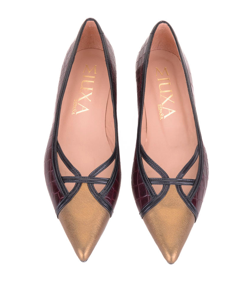 Bailarina en piel con grabado de cocodrilo color burdeos. Detalle de punta en piel bronce y vivo en piel negra. Forro interior piel. Plantilla de piel acolchada. Tacón de 2cm forrado en piel color burdeos. Suela antideslizante.