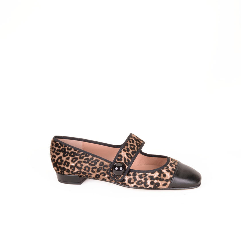 Bailarina en piel animal print color gris y negro. Detalle de puntera en piel negra. Cierre con velcro. Forro interior en piel. Plantilla en piel acolchada. Tacón de 2cm forrado en piel color negro. Suela antideslizante.