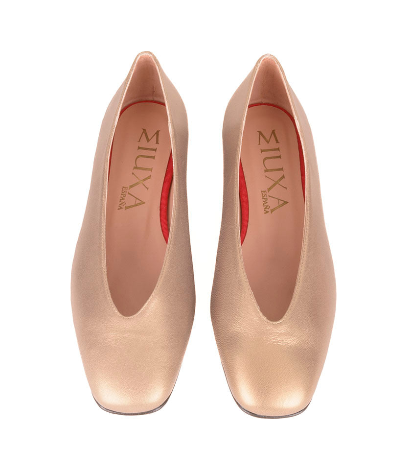 Bailarina en napa efecto seda muy suave color bronce. Forro interior en piel. Plantilla de piel acolchada. Tacón de 1,5cm. Suela antideslizante.