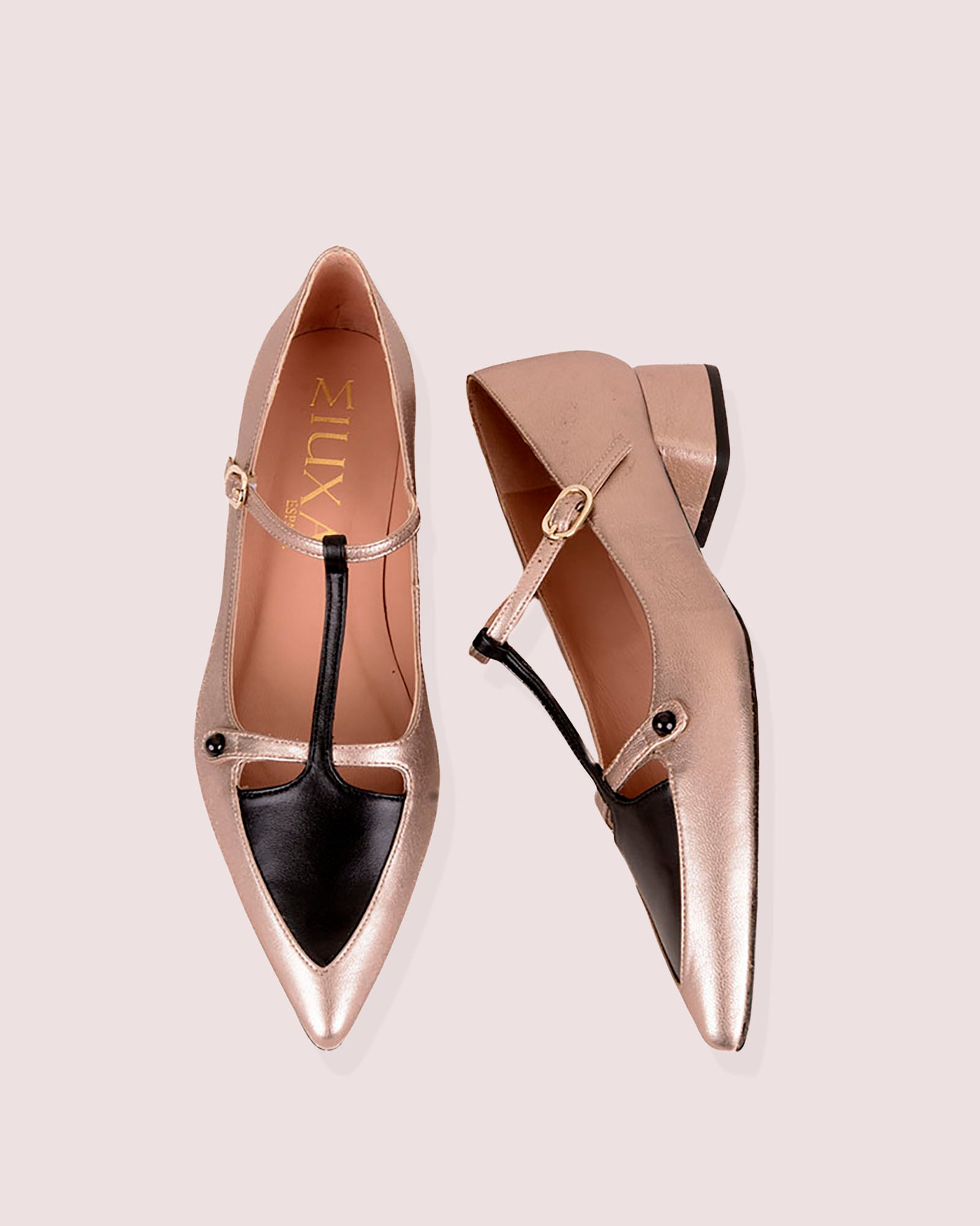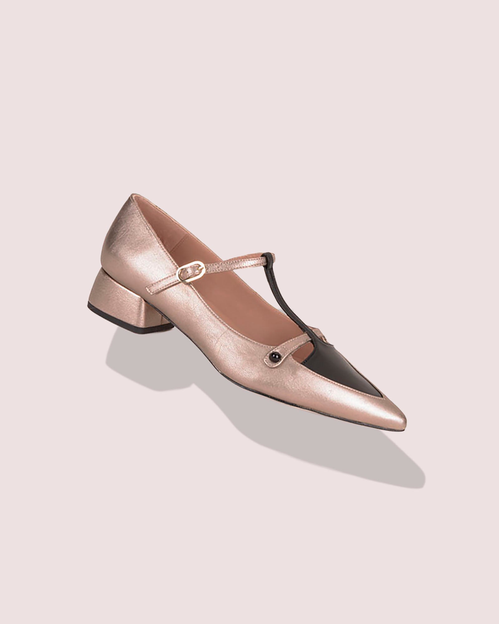 Zapato en piel metalizada color bronce. Pala en piel suave color negro. Detalle de tiras t-bar en piel color burdeos y broche dorado. Cierre con hebilla. Forro interior en piel. Plantilla en piel acolchada. Tacón de 3,5cm forrado en piel color bronce. Suela antideslizante.