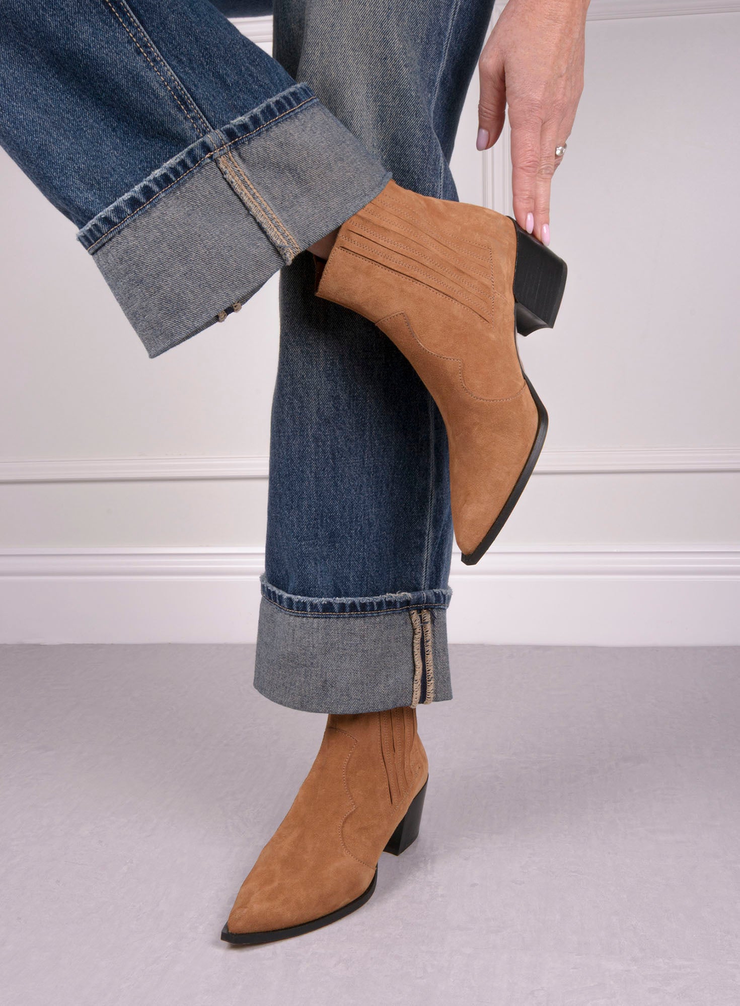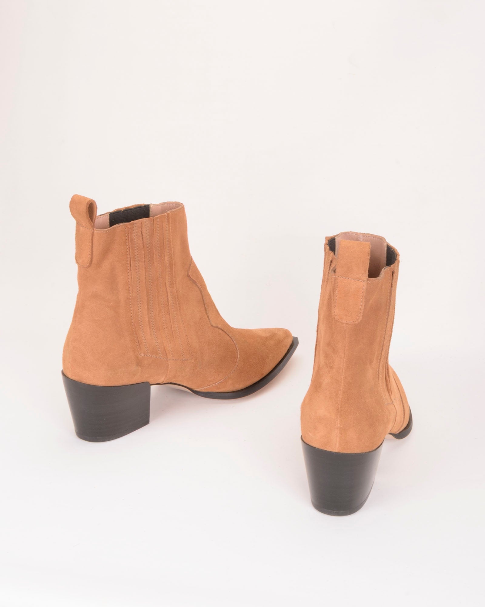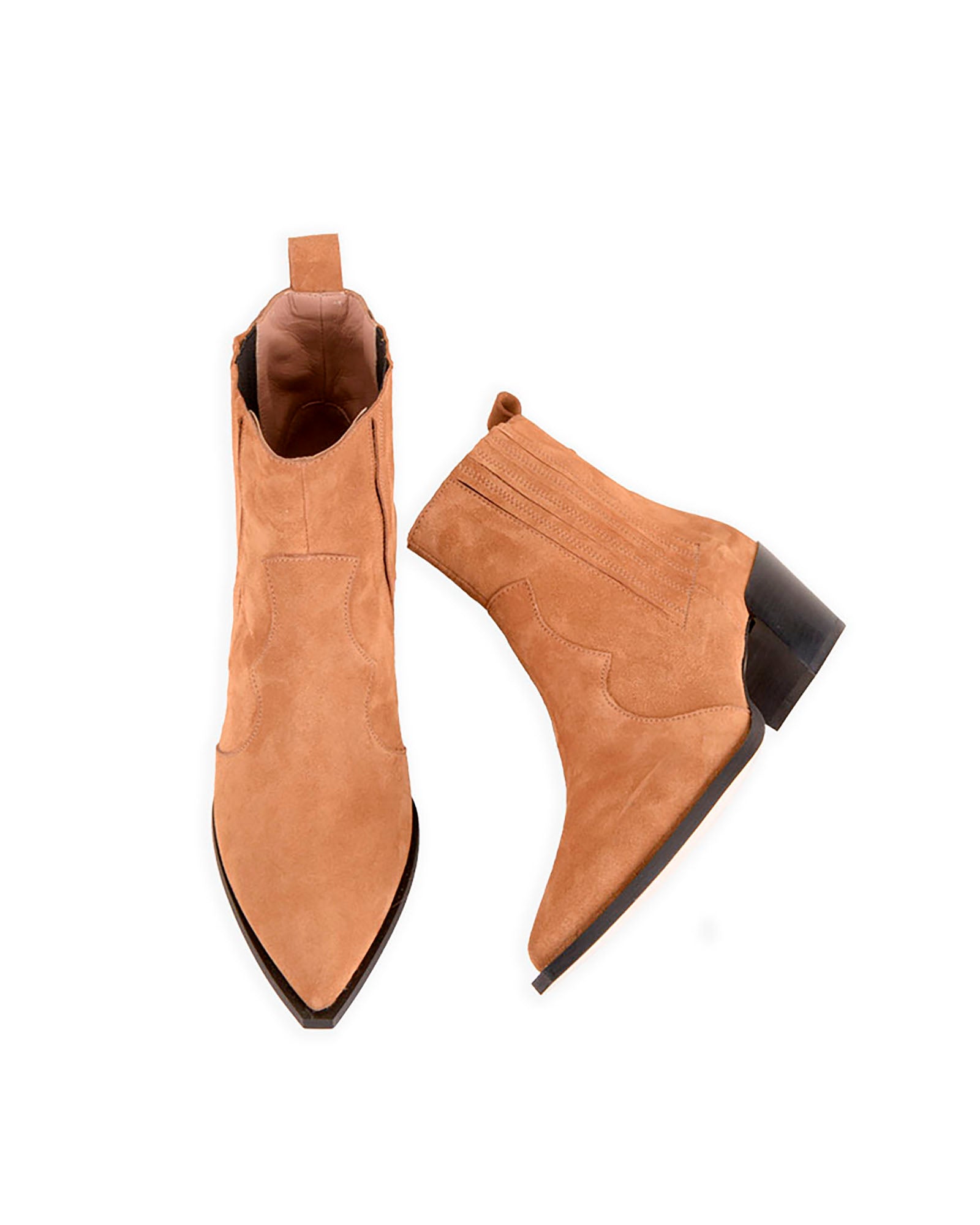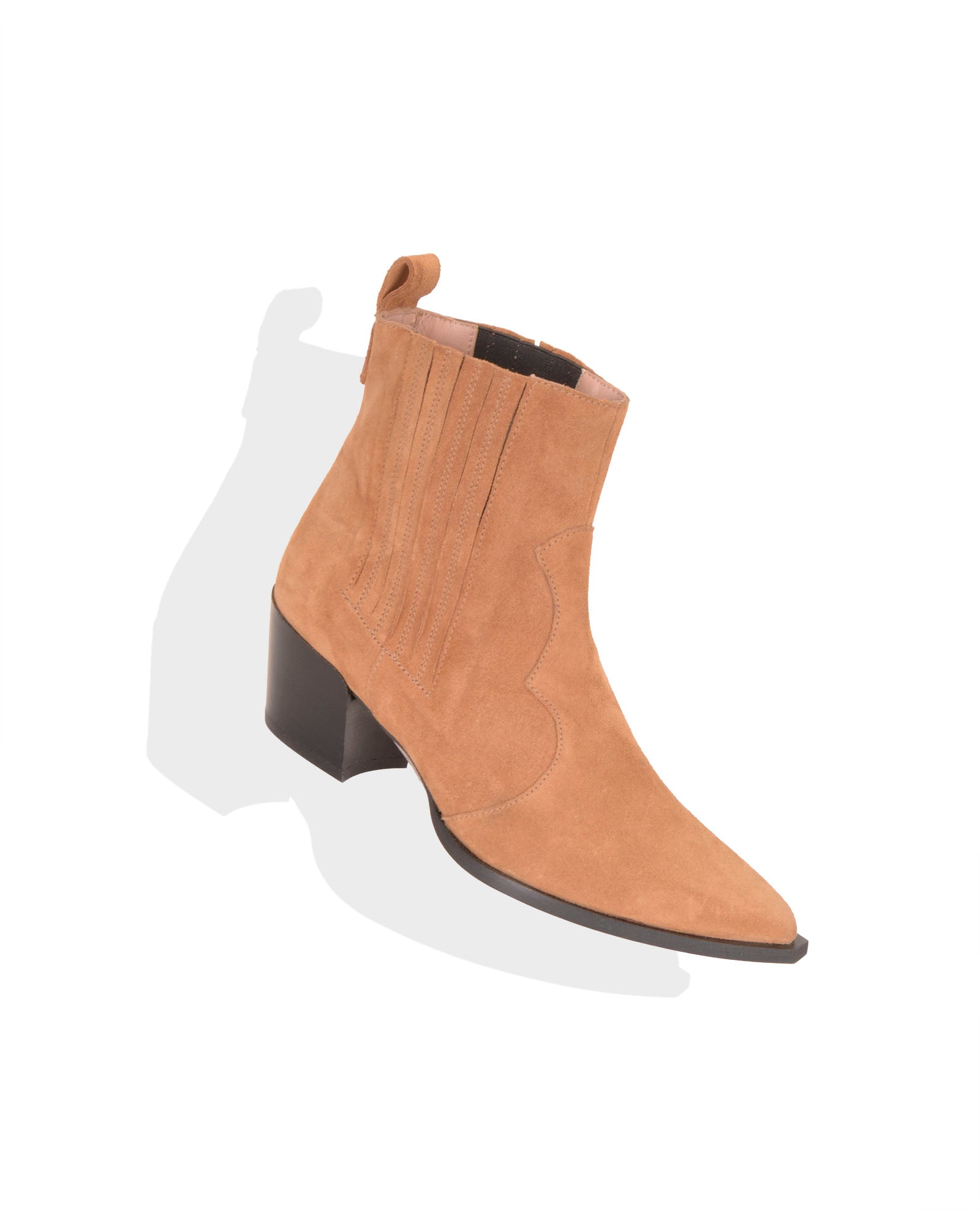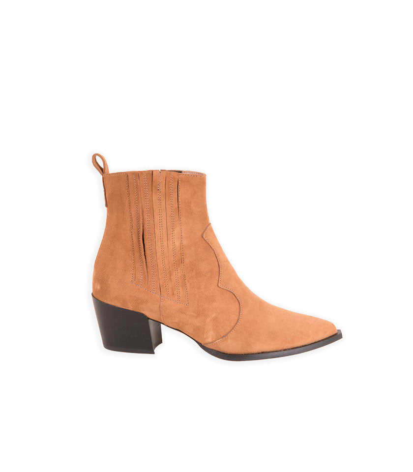 Botín en serraje suave color camel. Forro interior en piel. Plantilla de piel acolchada. Tacón de 4,5cm. Suela antideslizante.