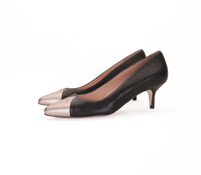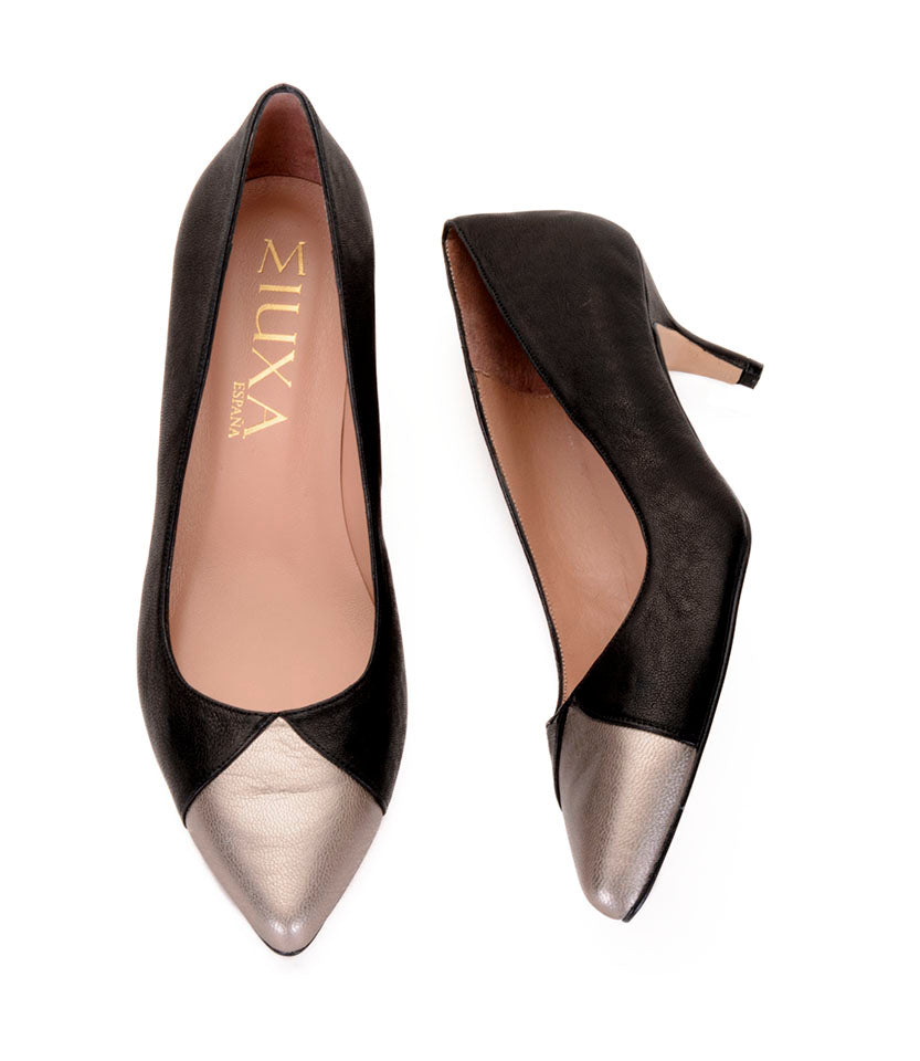 Salón en piel con acabado natural color negro.  Detalle de puntera en piel metalizada bronce. Forro interior en piel. Plantilla de piel acolchada. Tacón de 4,5cm, forrado en piel color negro. Suela antideslizante.
