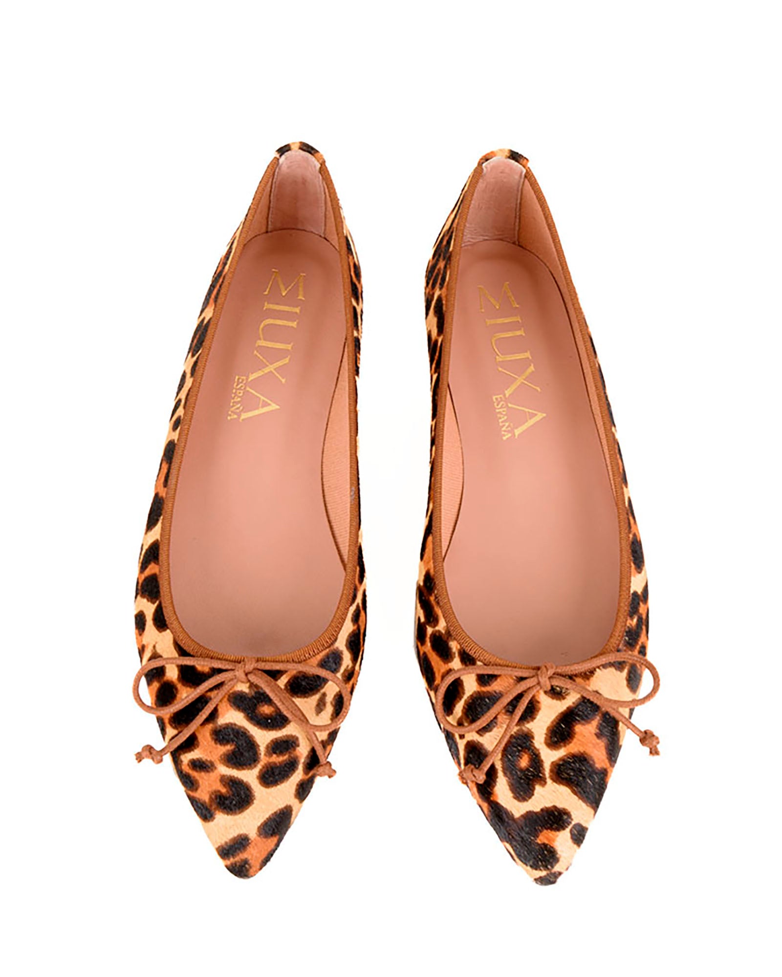Bailarina en pelo de potro natural con estampado de leopardo. Detalle de lazo camel. Forro interior piel. Plantilla de piel acolchada. Tacón de 1,5cm. Suela antideslizante.