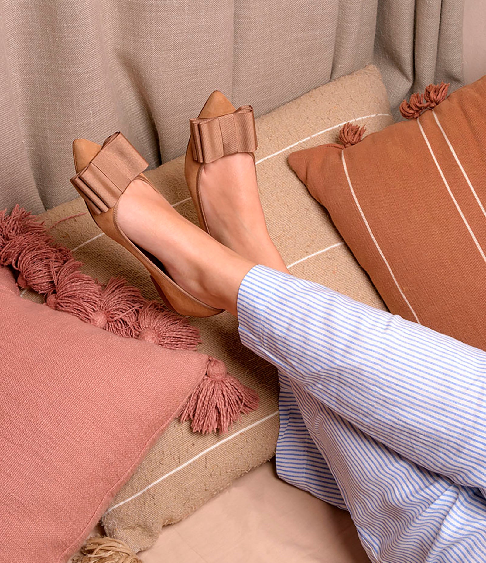 Bailarina en ante suave camel. Detalle de lazo camel. Forro interior textil. Plantilla de piel acolchada. Tacón de 3,5cm, forrado en ante. Suela antideslizante.