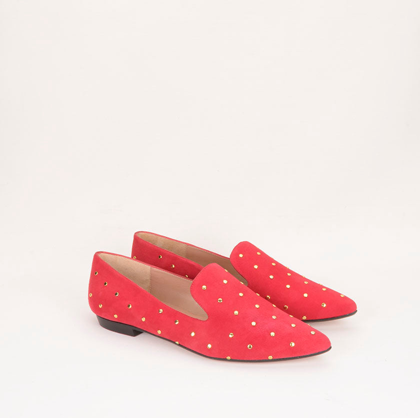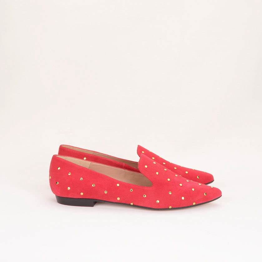 Slipper fabricada en ante suave en color rojo. Detalle de mini tachas doradas. Forro interior piel. Plantilla de piel acolchada. Tacón de 1,5 cm de altura. Suela antideslizante.