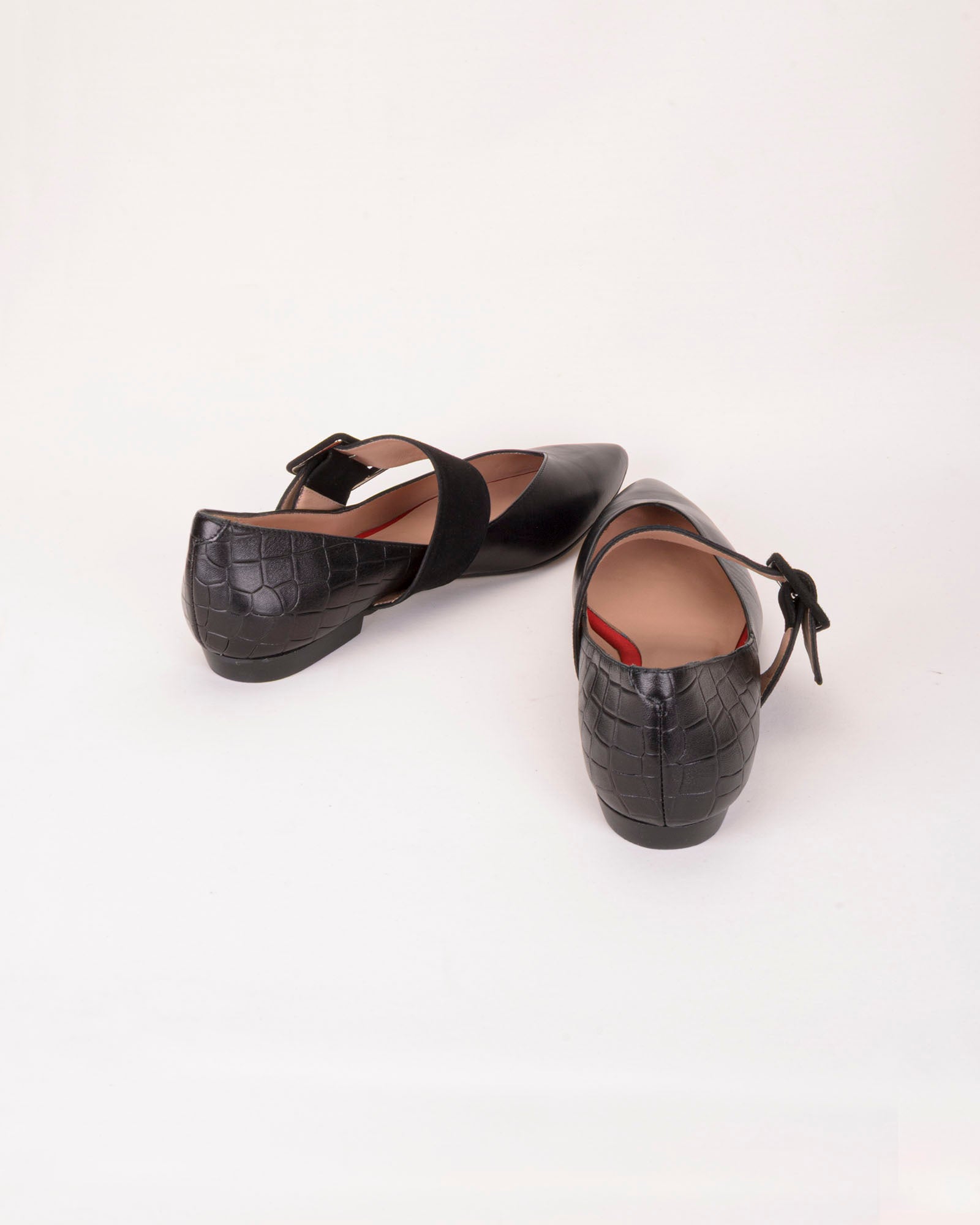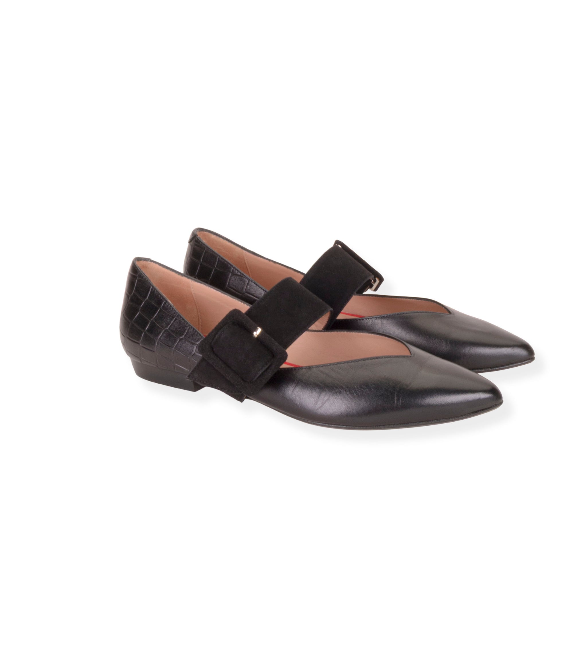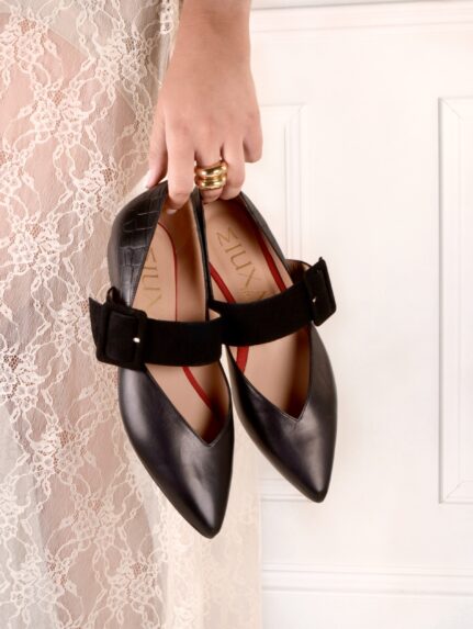 Bailarina en piel suave color negro. Detalle de tira y hebilla en ante color negro. Forro interior piel. Plantilla de piel acolchada. Tacón de 1,5cm de altura. Suela antideslizante.