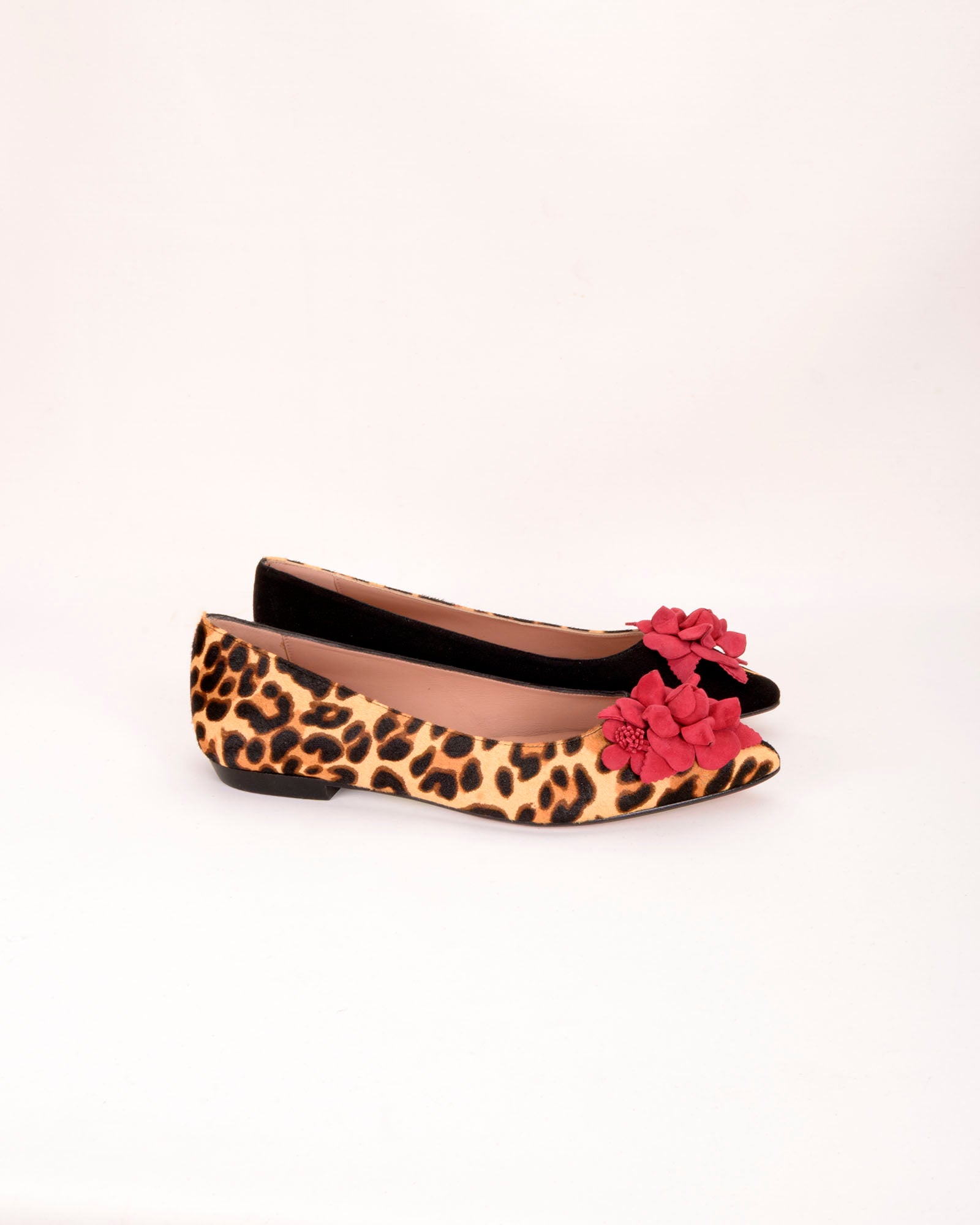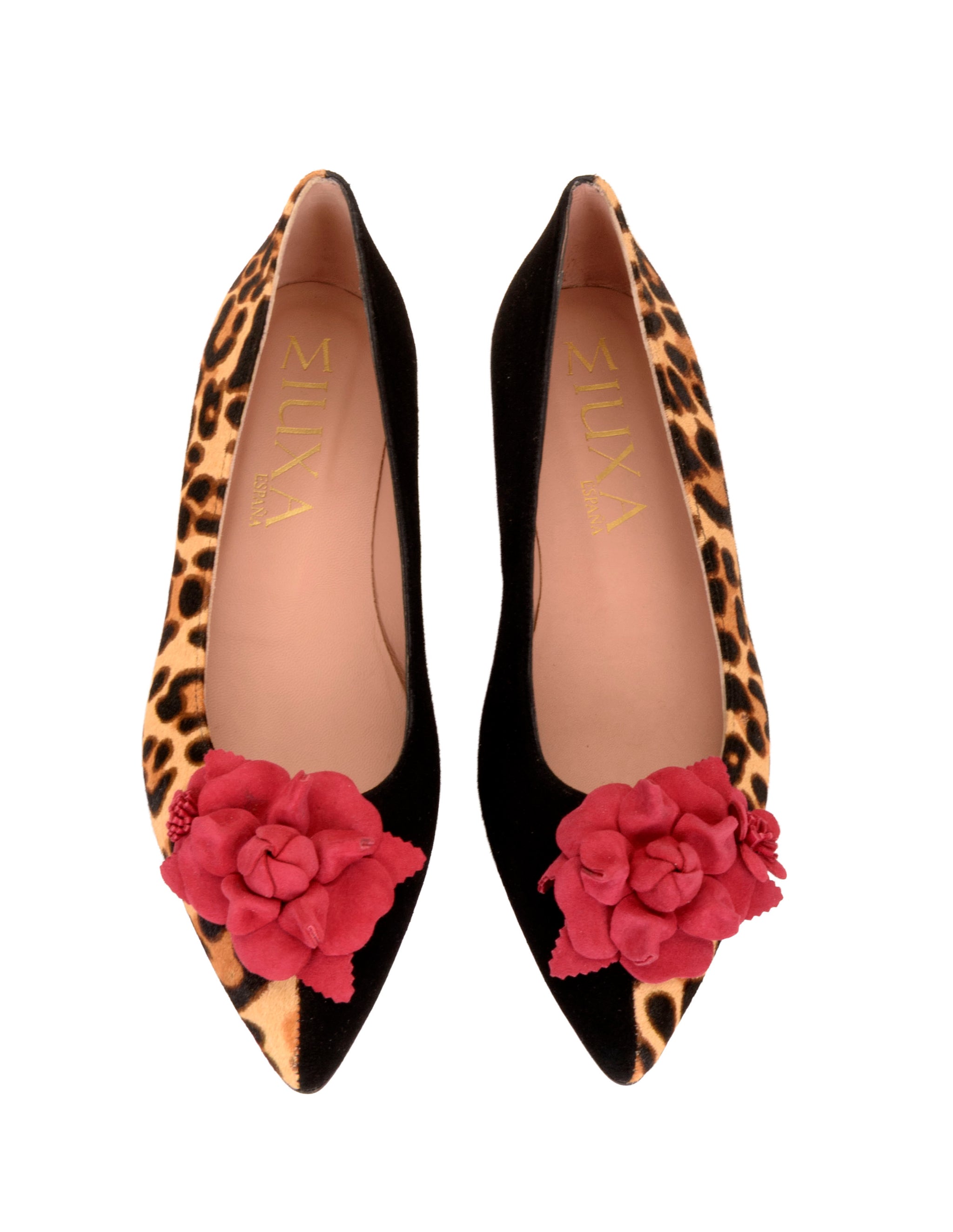 - Bailarina fabricada en ante negro y piel con pelo estampado leopardo.