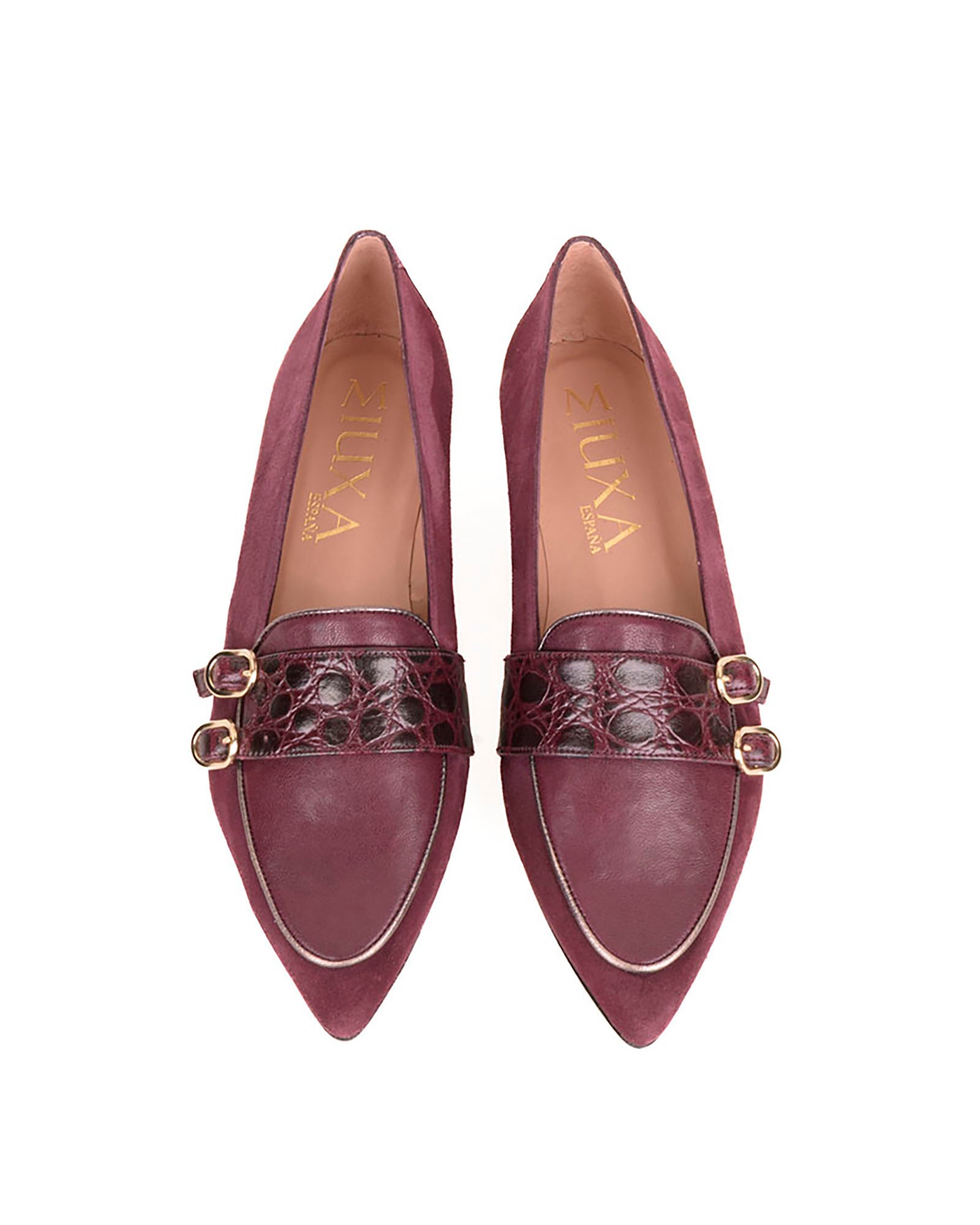 Mocasín en ante suave color burdeos. Pala en piel con acabado natural color burdeos. Detalle en la pala en piel con grabado coco burdeos con vivo en piel bronce . Forro interior en piel. Plantilla de piel acolchada. Tacón de 1,5cm de altura. Suela antideslizante.