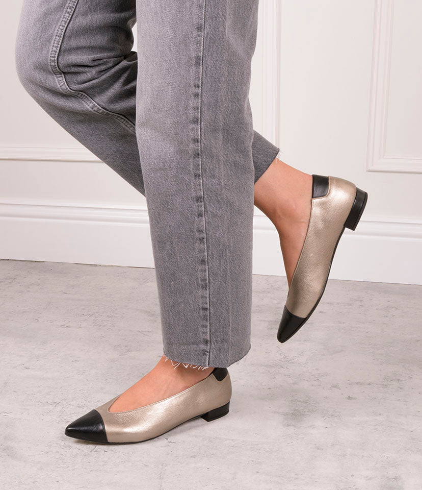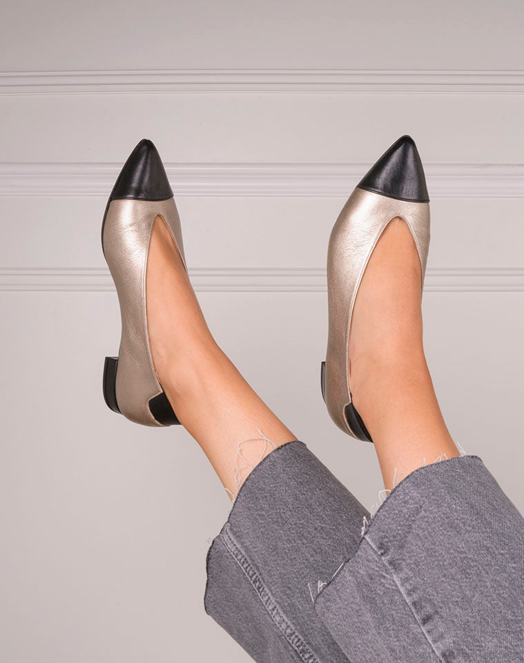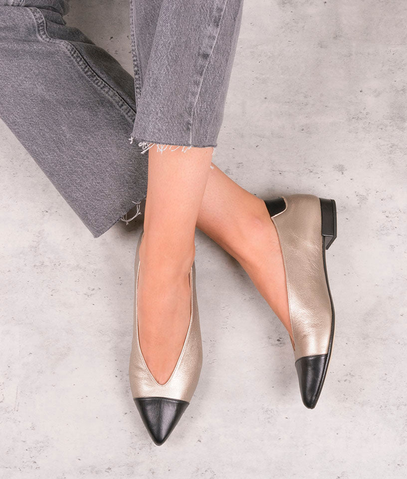 Bailarina en piel suave color bronce. Detalle de punta y talón en piel negra. Forro interior piel. Plantilla de piel acolchada. Tacón de 2cm, forrado en piel negra. Suela antideslizante.