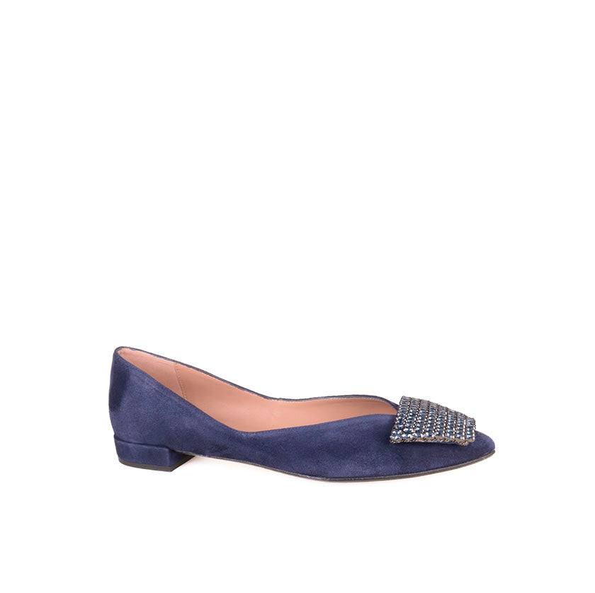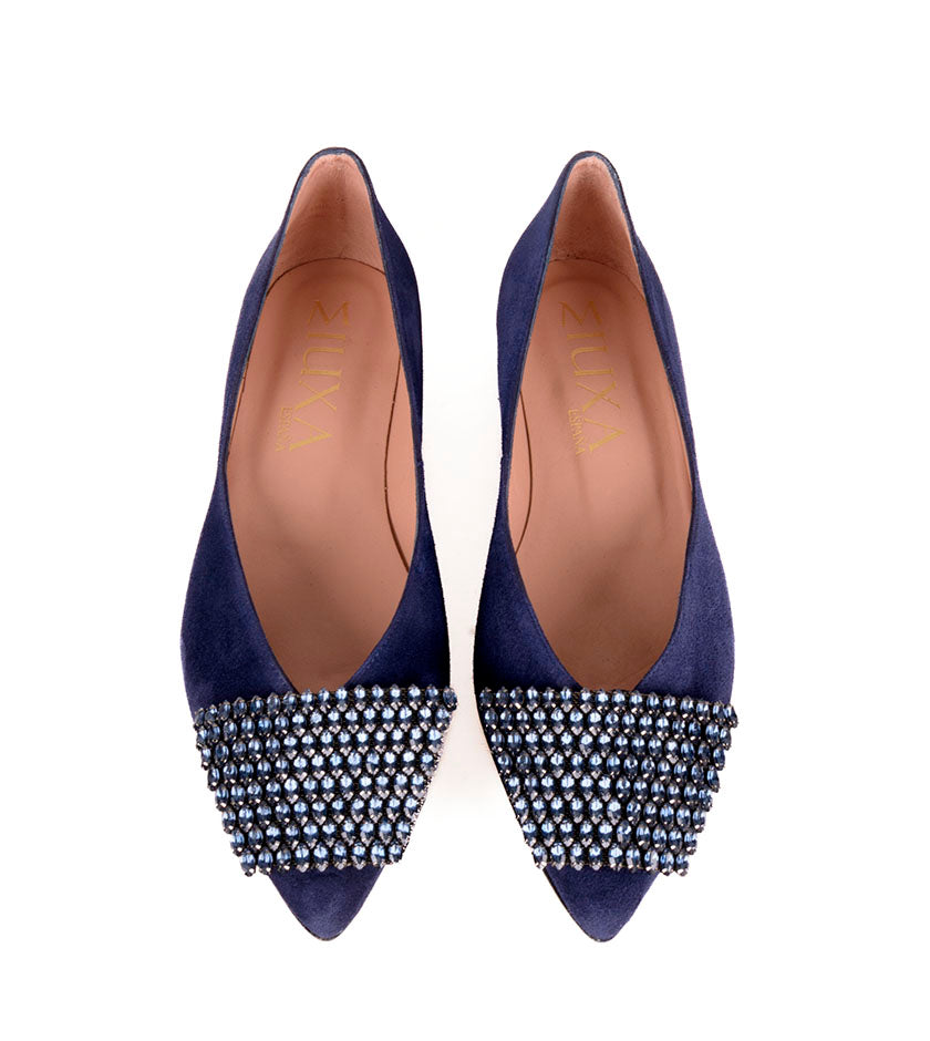 Bailarina en ante muy suave color marino. Detalle de adorno con mini cristales marino.  Forro interior piel. Plantilla de piel. Tacón de 2cm forrado en ante marino. Suela antideslizante.