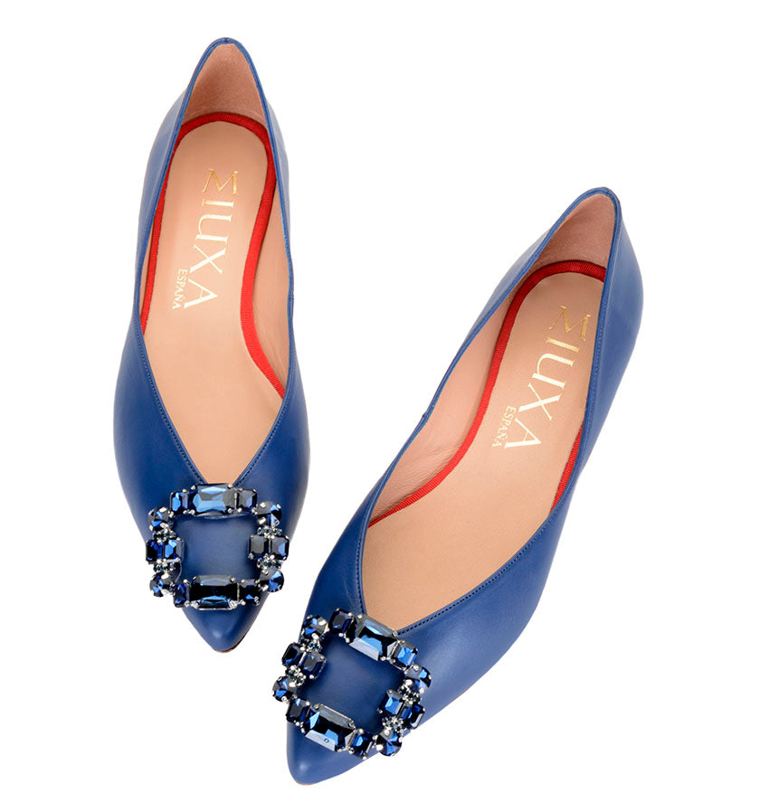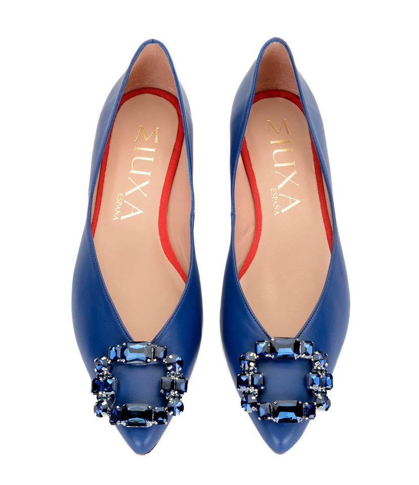 Bailarina en piel suave color azul. Detalle de adorno con cristales color azul. Forro interior piel. Plantilla de piel acolchada. Tacón de 2 cm de altura, forrado en piel azul. Suela antideslizante.