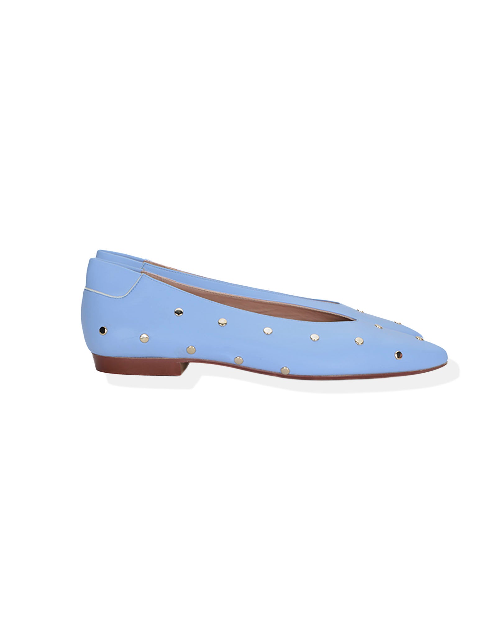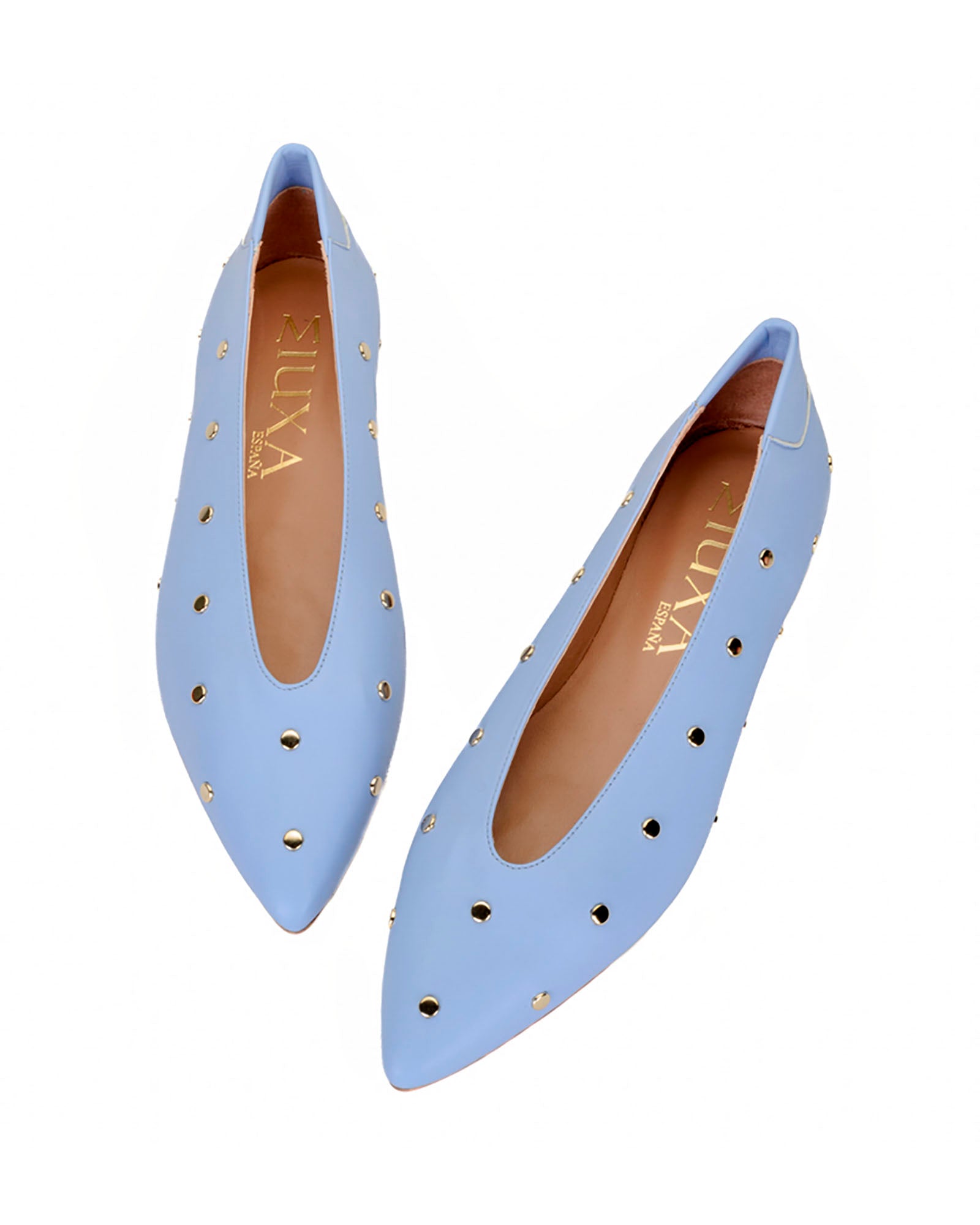 Bailarina en piel muy suave color azul. Apliques de tachas doradas. Forro interior piel. Plantilla de piel. Tacón de 1,5 cm. Suela antideslizante.