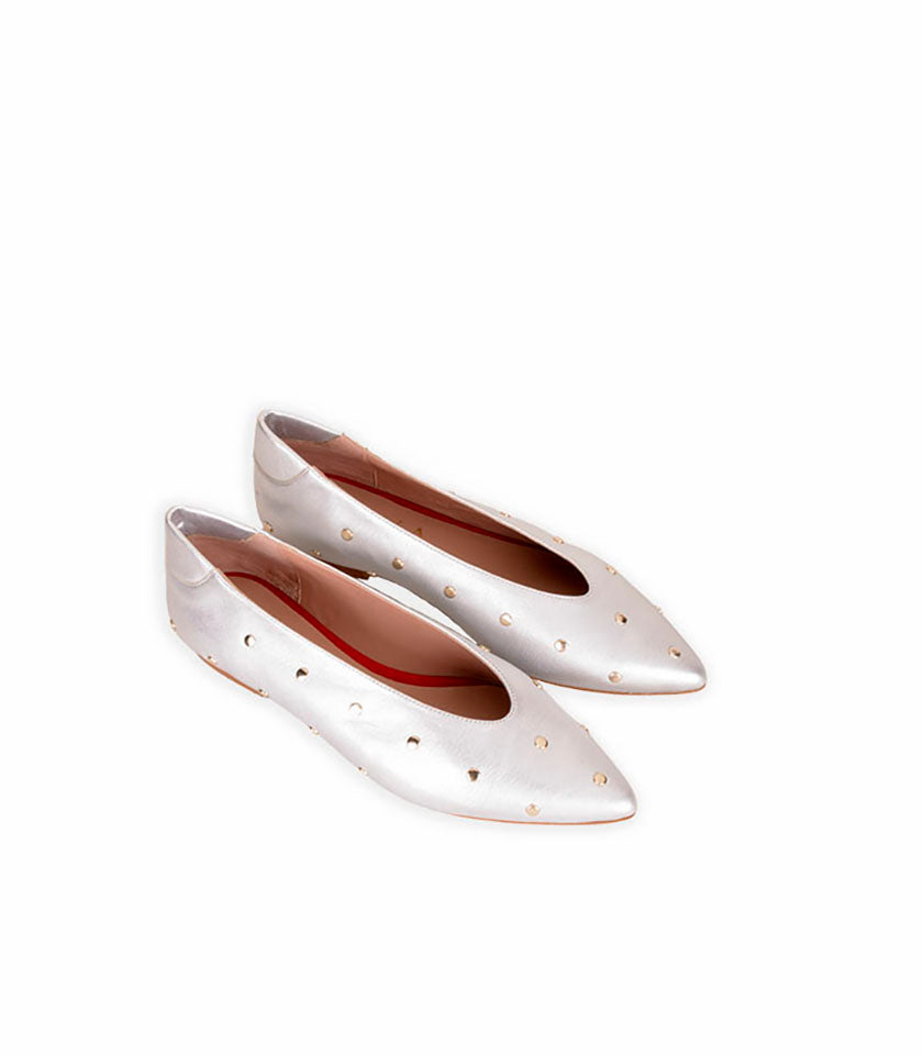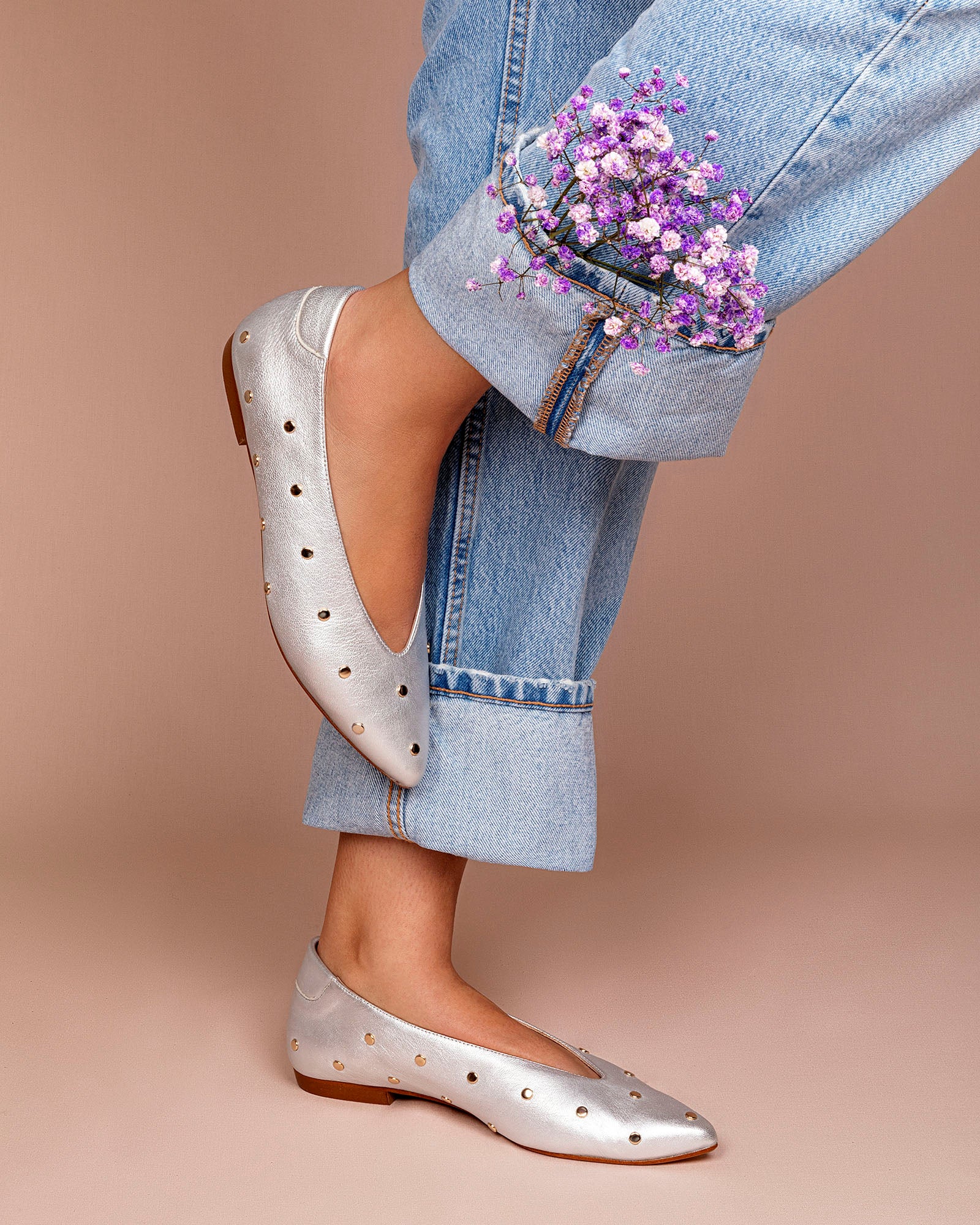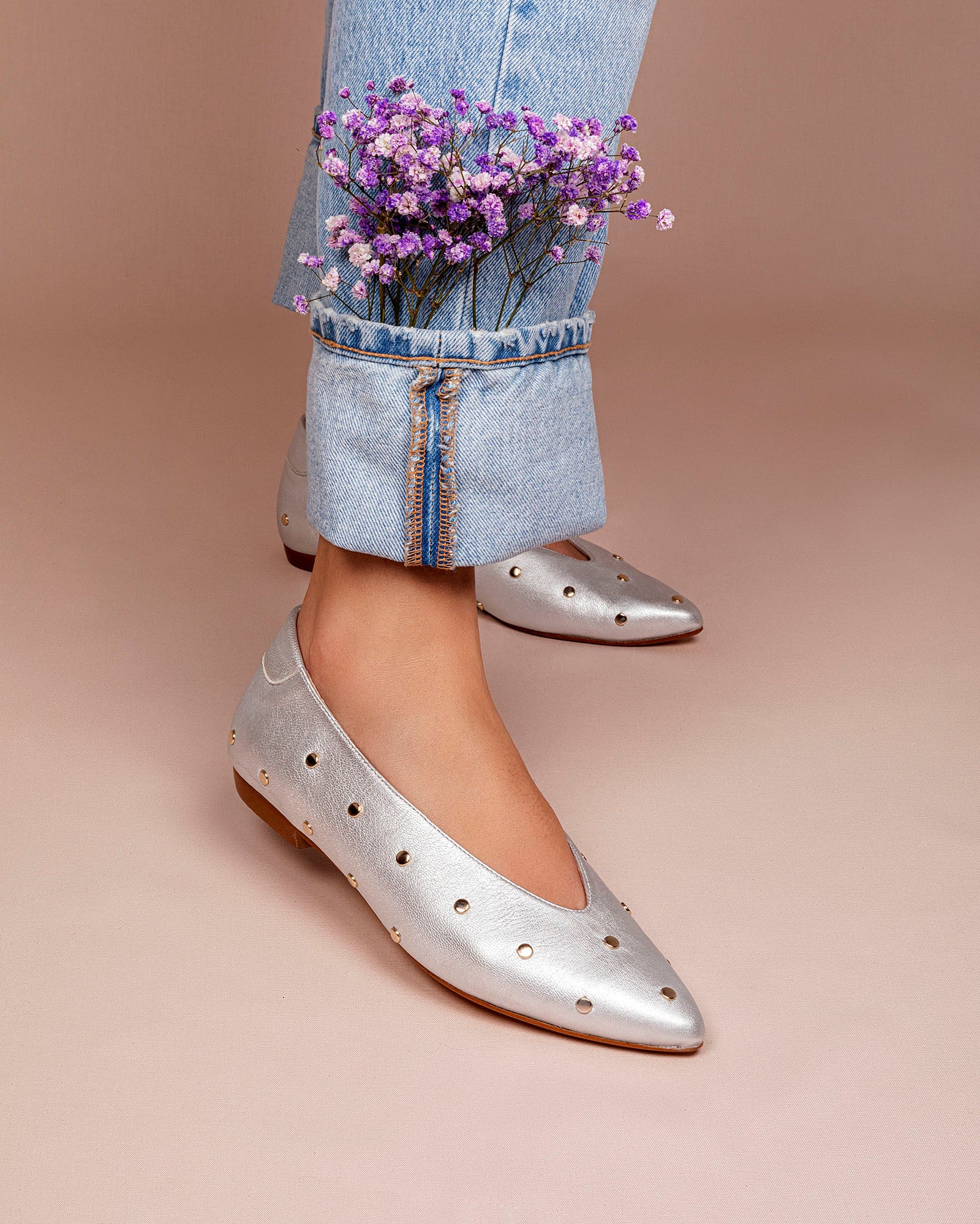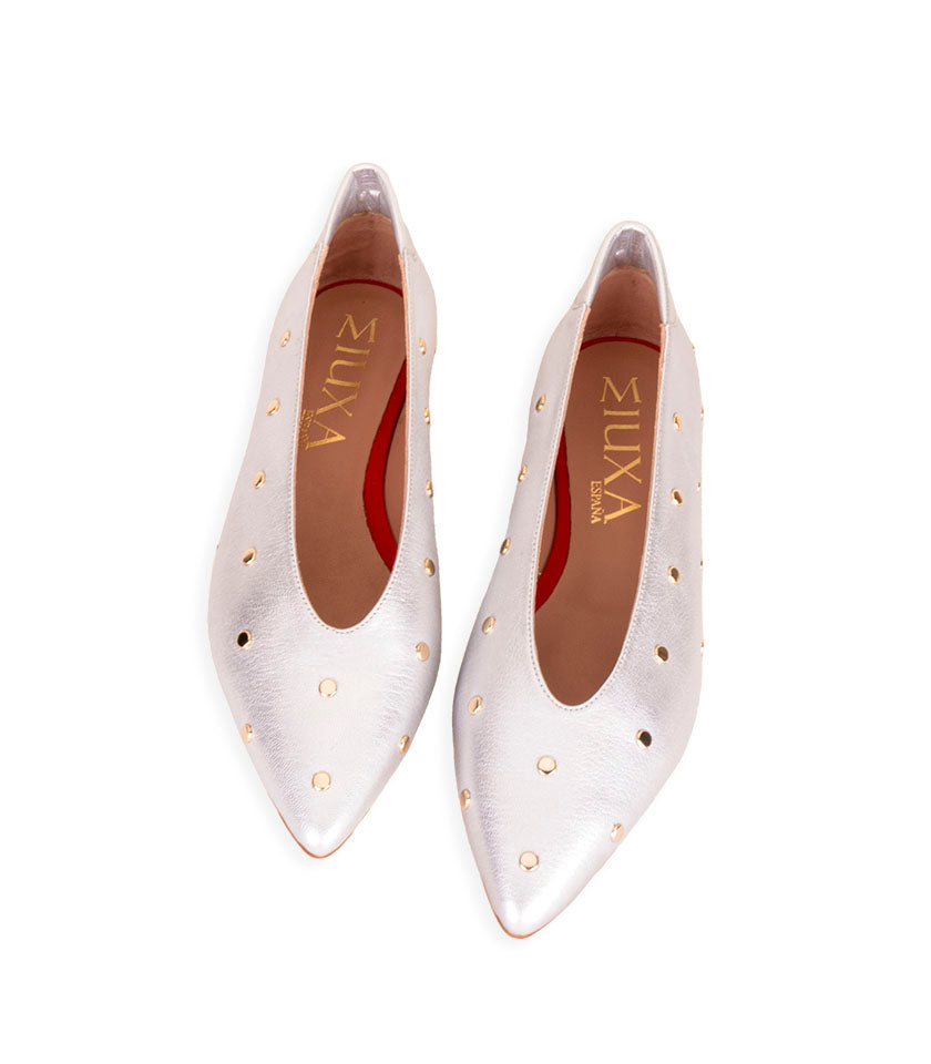 Bailarina en piel muy suave color plata. Apliques de tachas doradas. Forro interior piel. Plantilla de piel. Tacón de 1,5 cm de altura. Suela antideslizante.