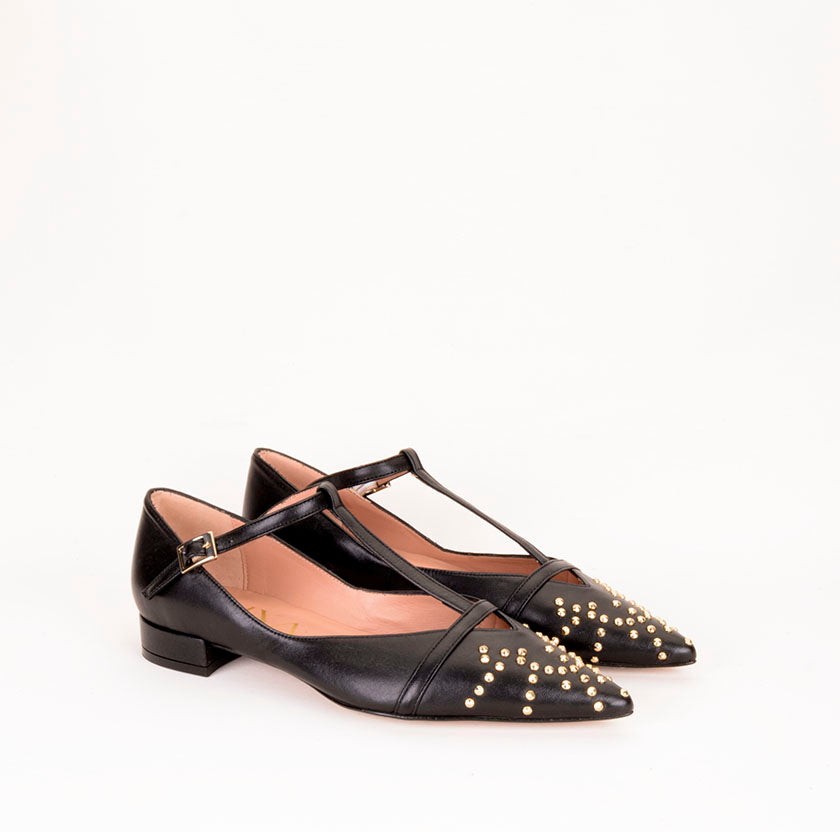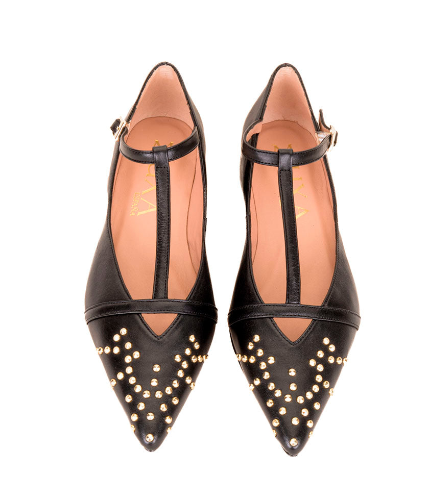 Detalle de tiras en piel negra y tachas doradas en la pala.