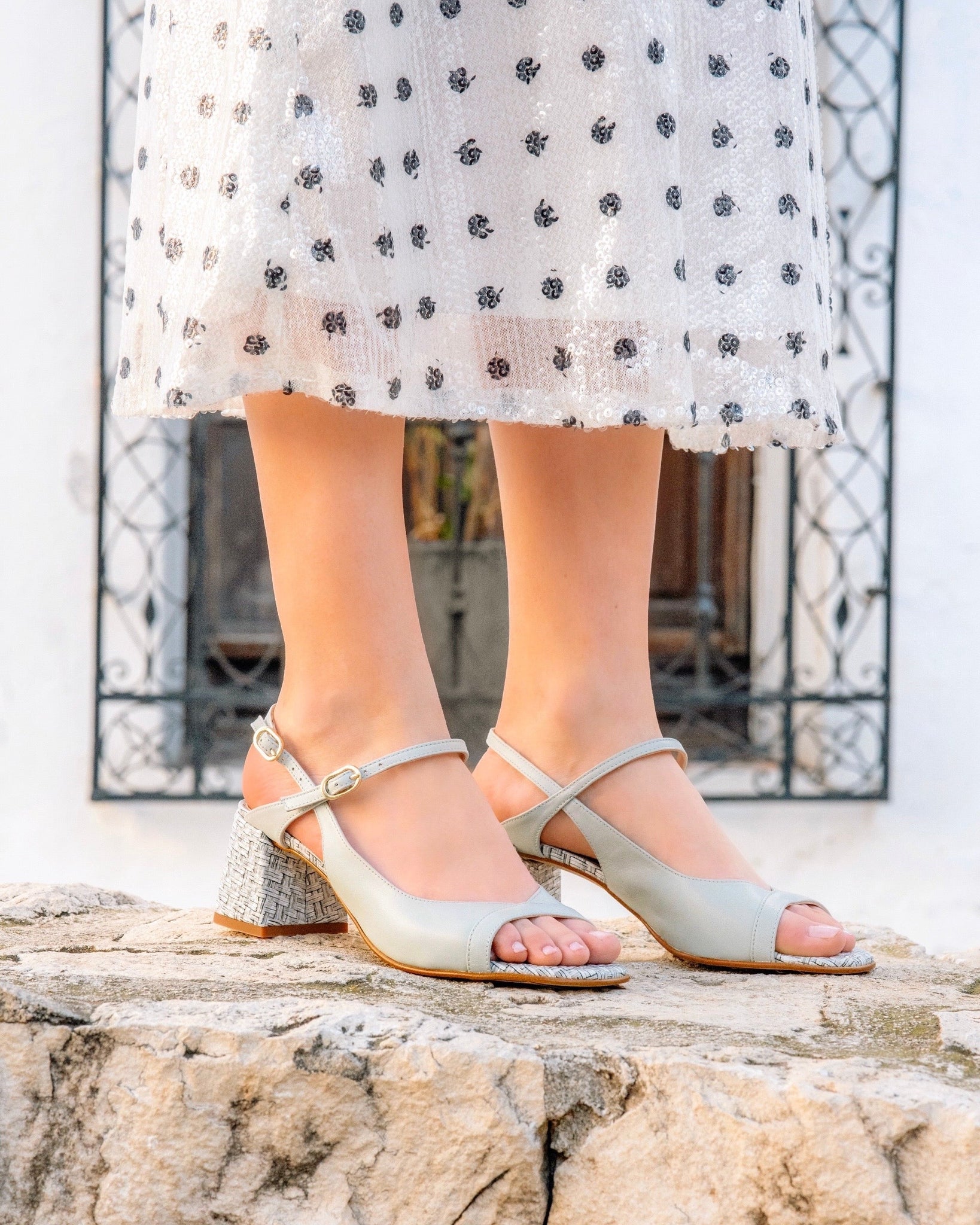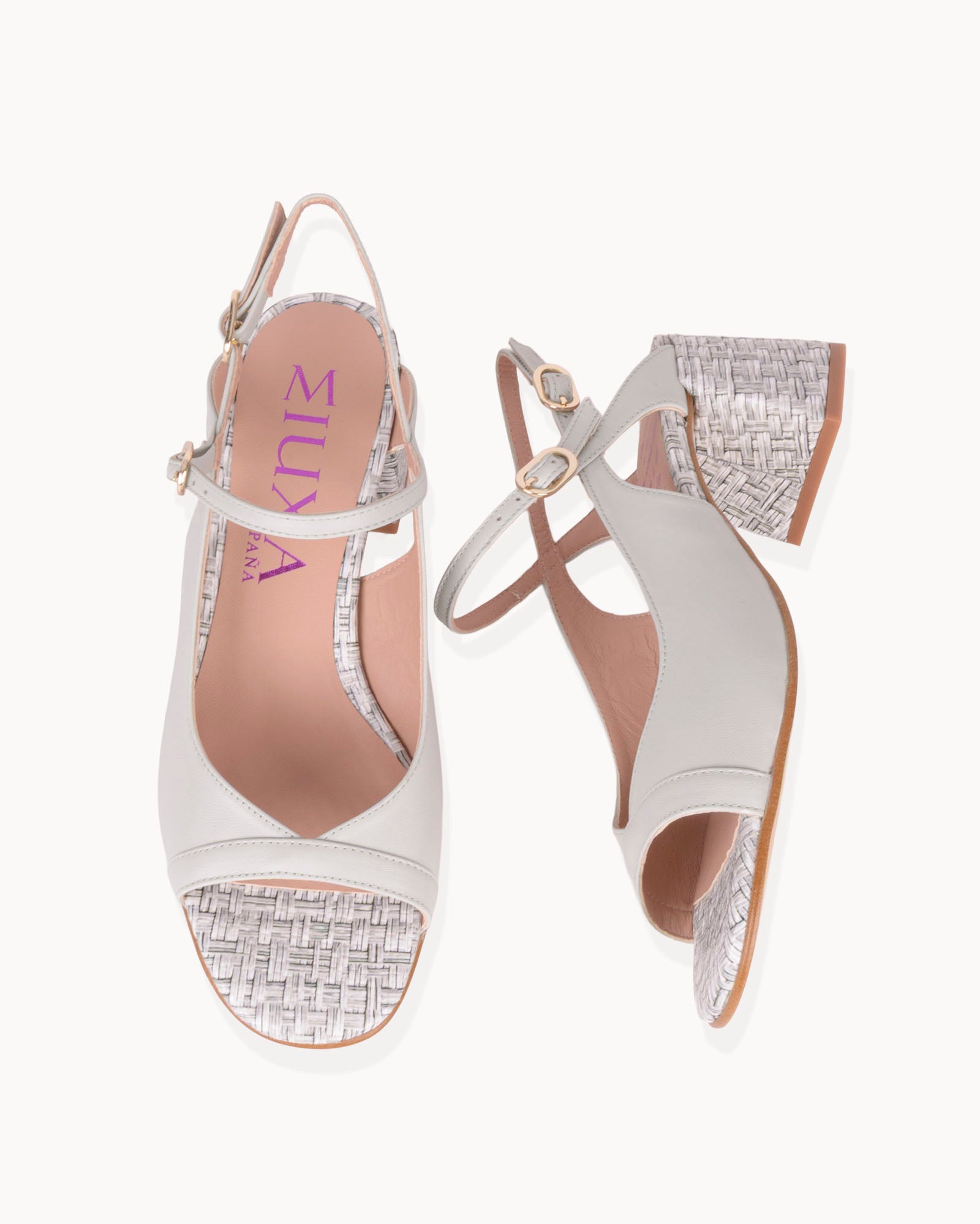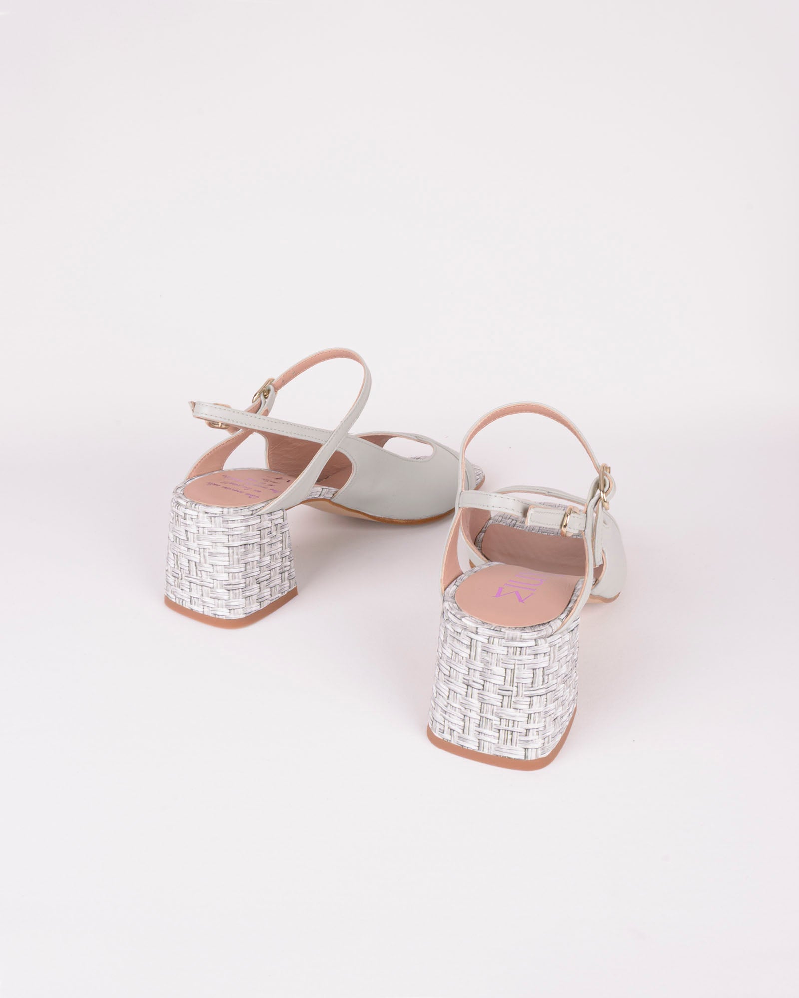 Sandalia en piel color verde agua combinada con piel grabada efecto rafia. Detalle de tiras en piel verde agua con hebillas doradas. Interior forrado en piel con plantilla acolchada. Tacón de 4,5 cm forrado en piel con grabado efecto rafia y suela antideslizante.