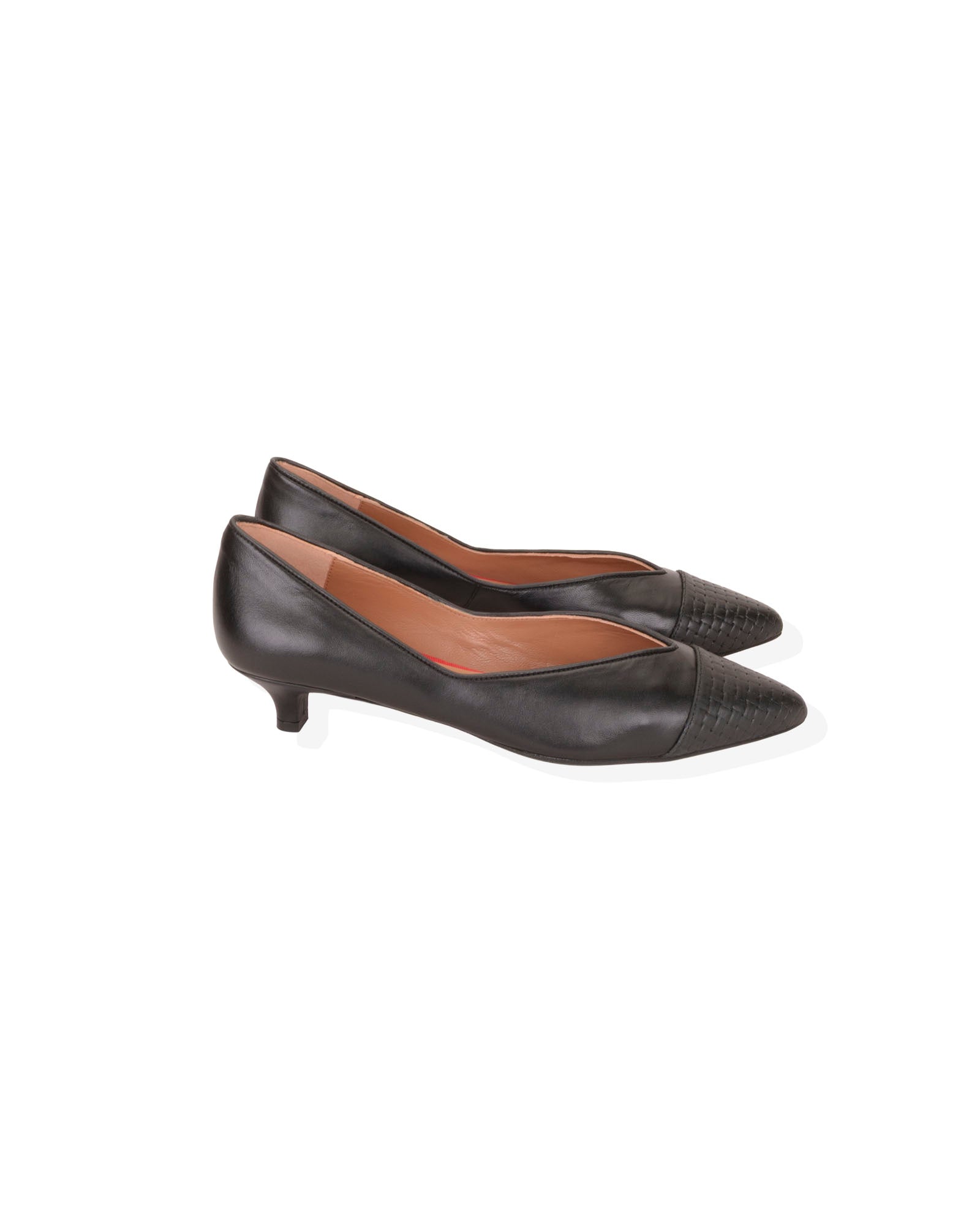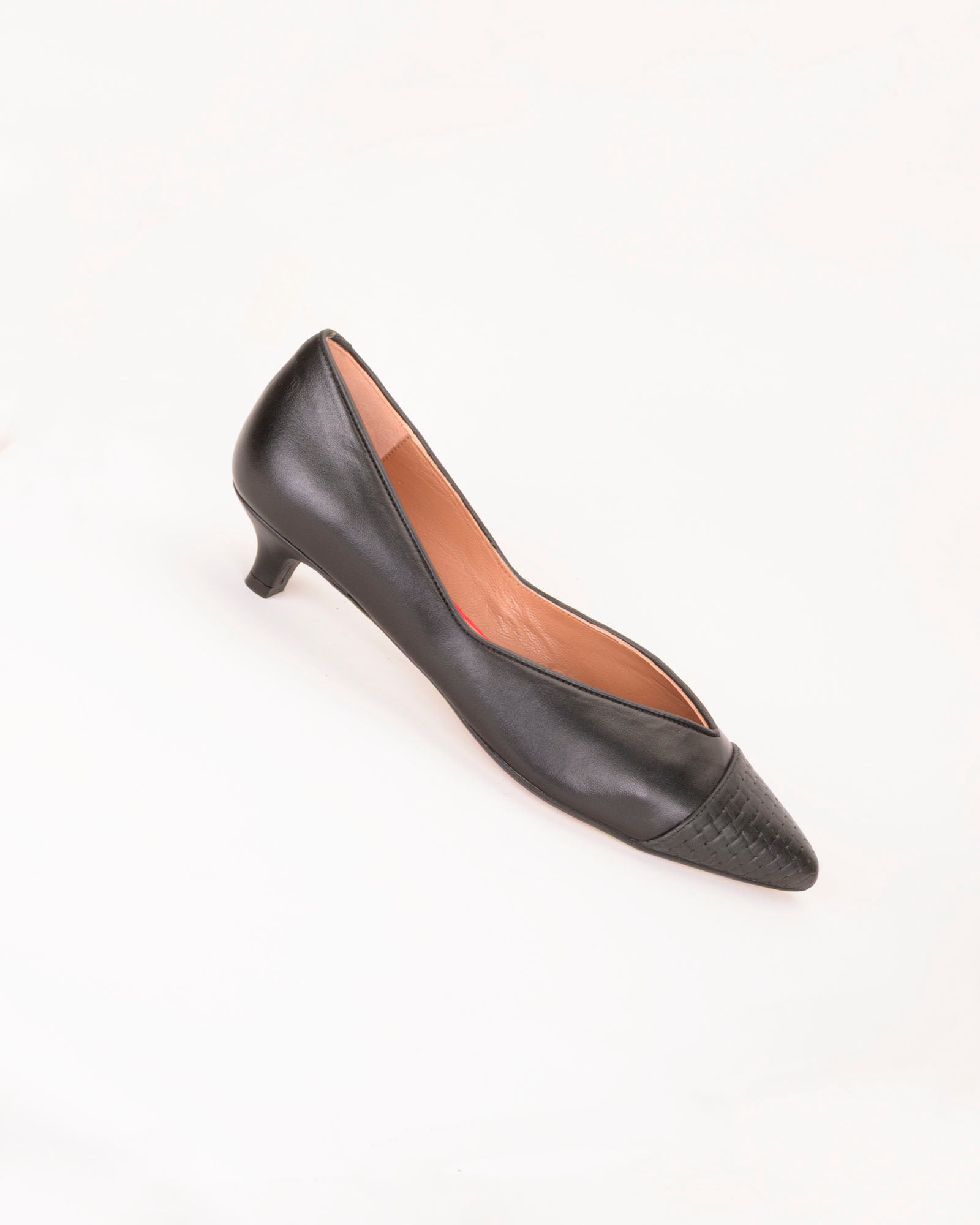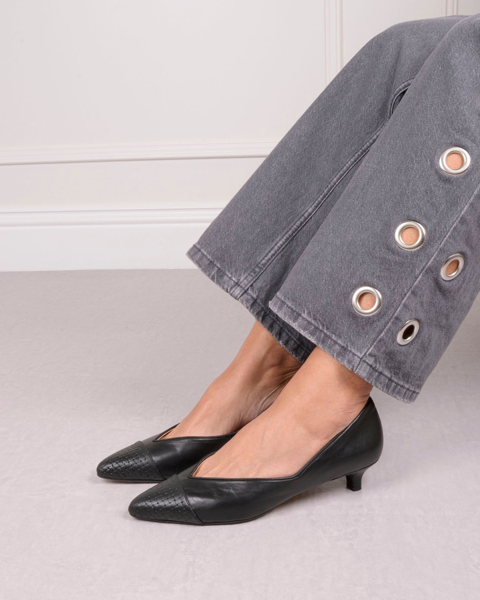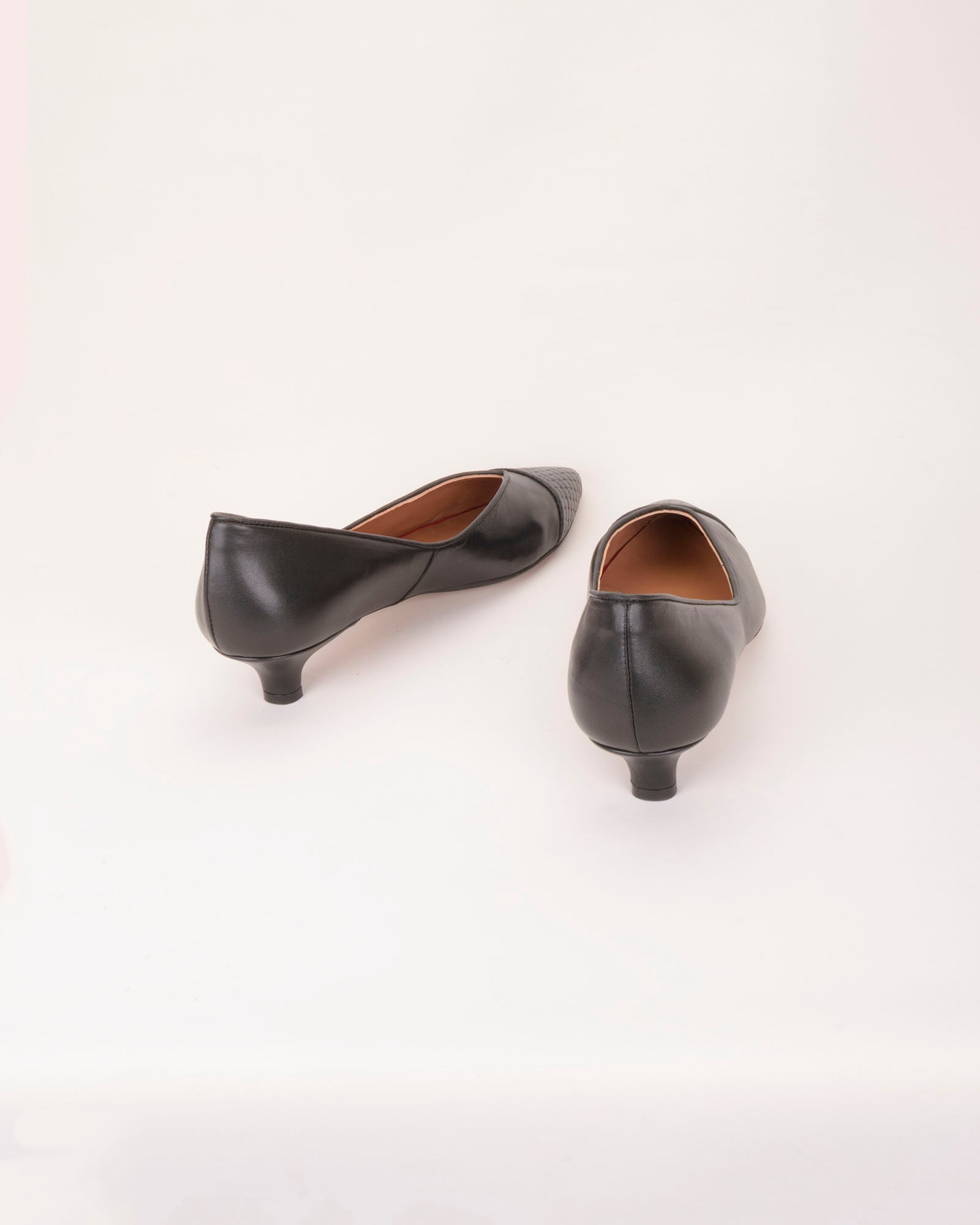 • Detalle de puntera en piel grabada de mini cuadros negros.