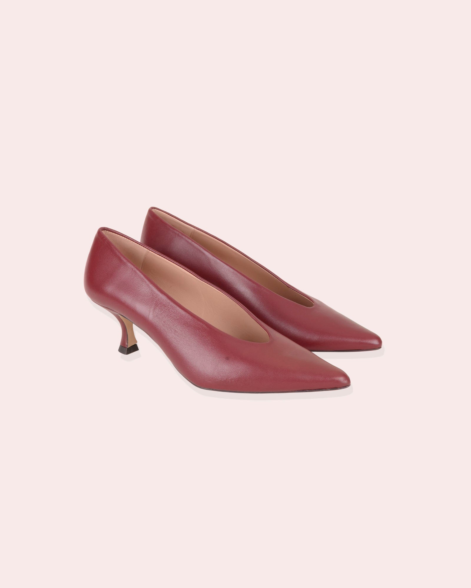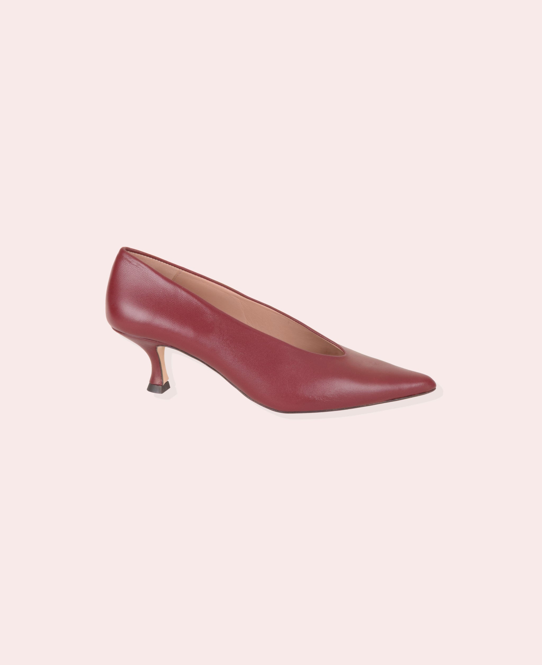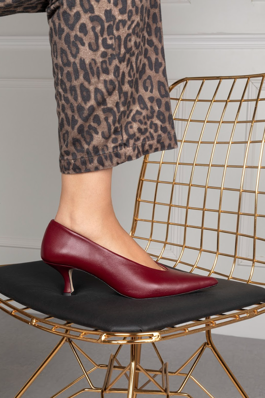 • Tacón de 4,5cm forrado en piel color cereza.
