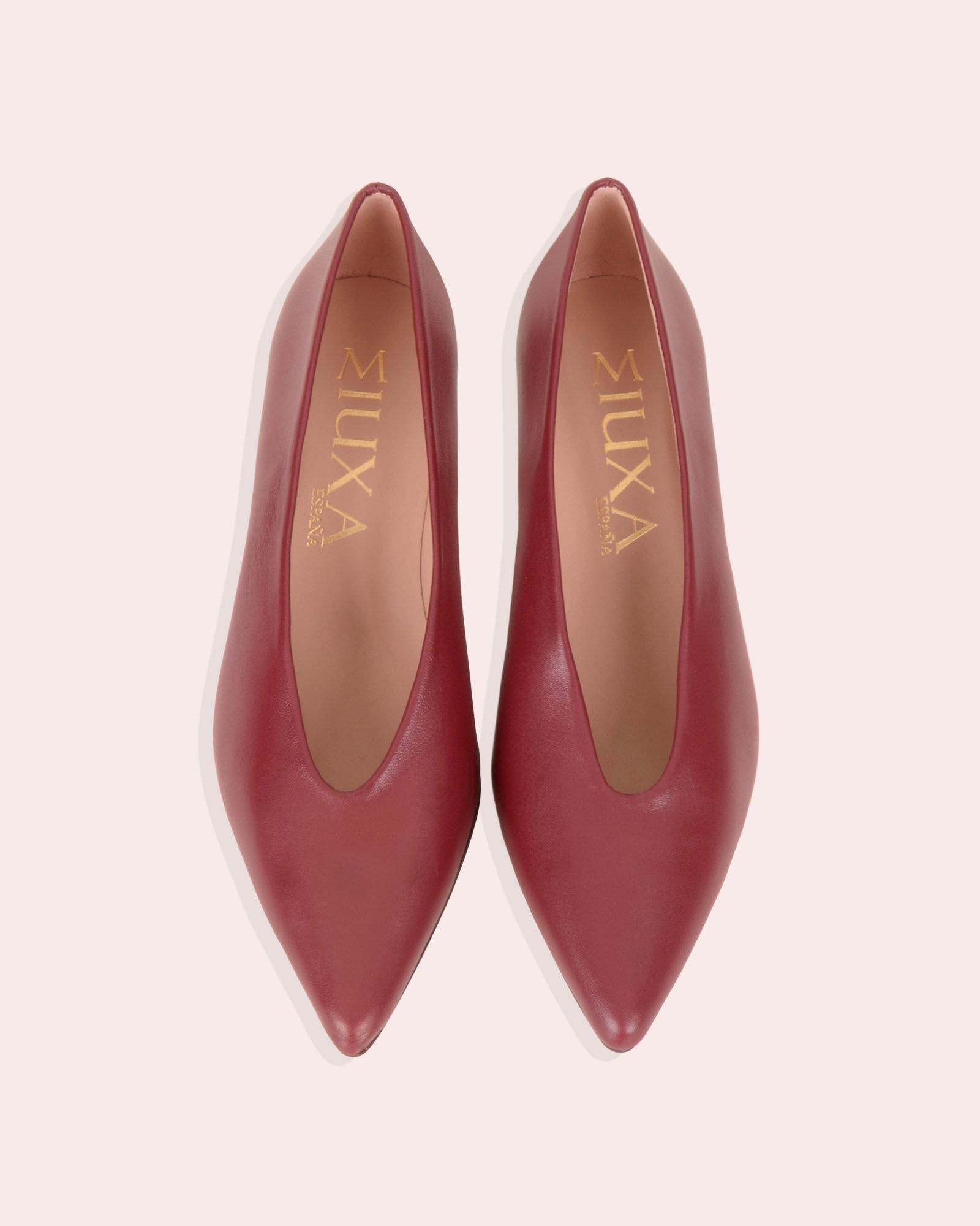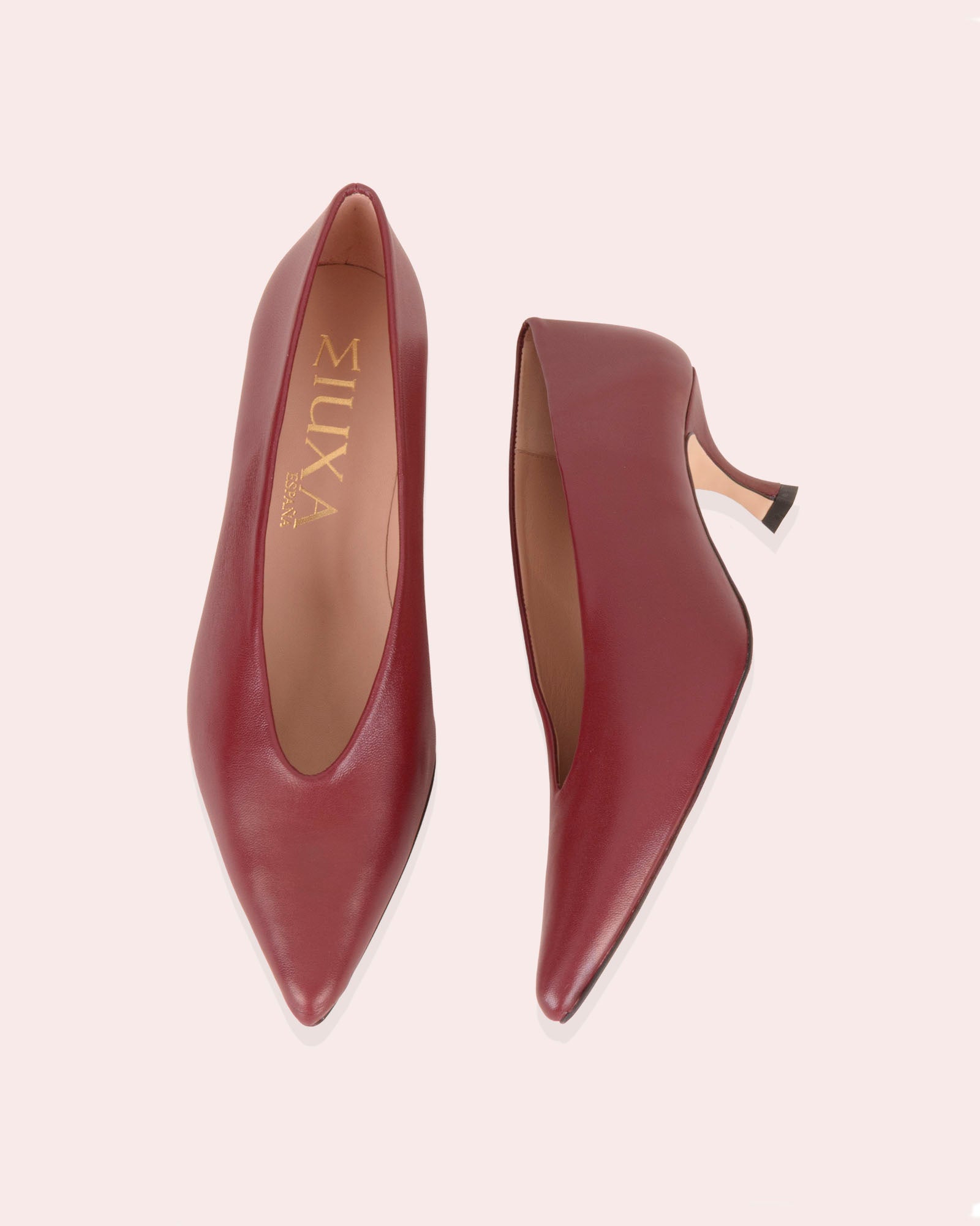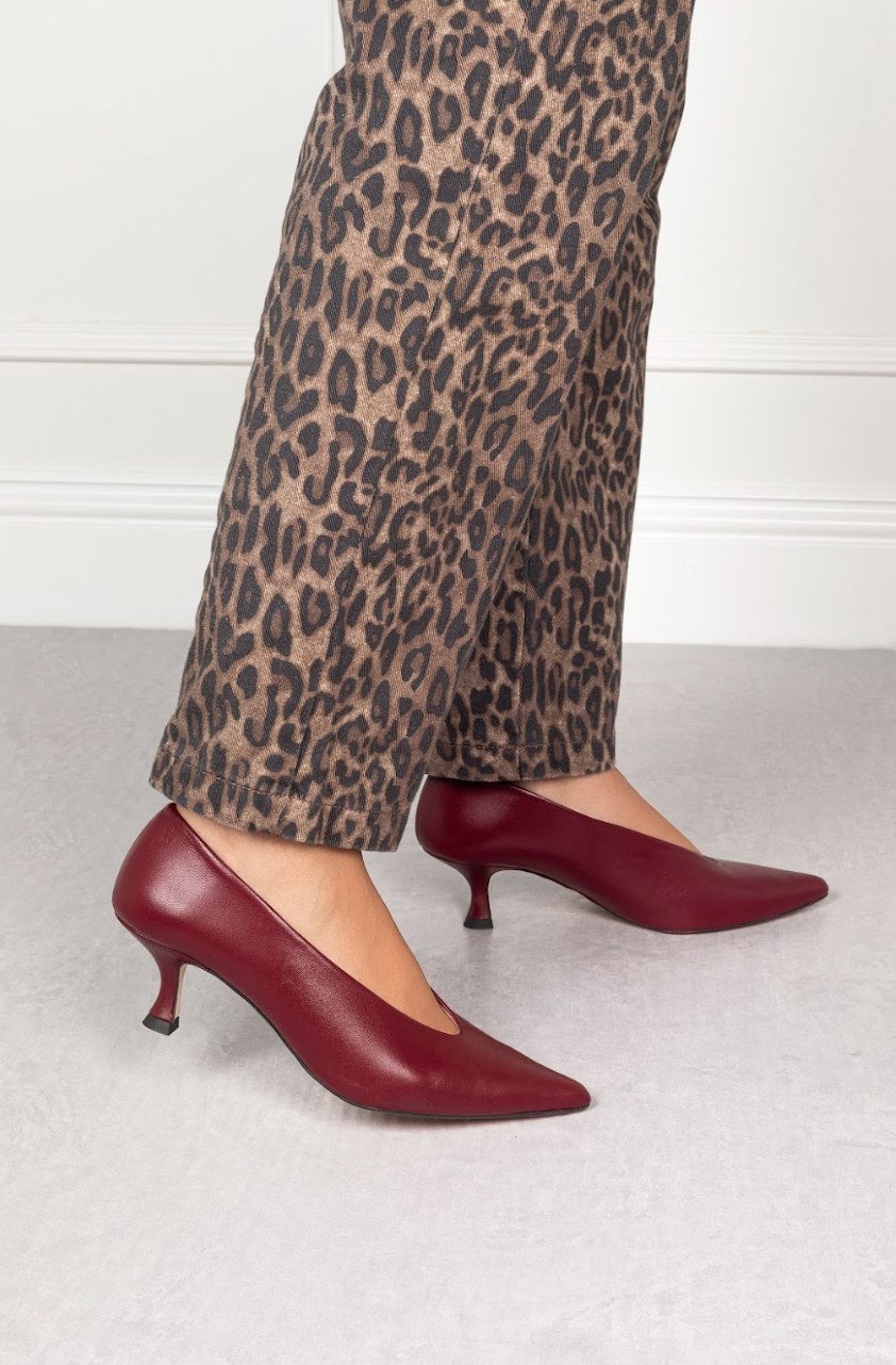 • Tacón de 4,5cm forrado en piel color cereza.