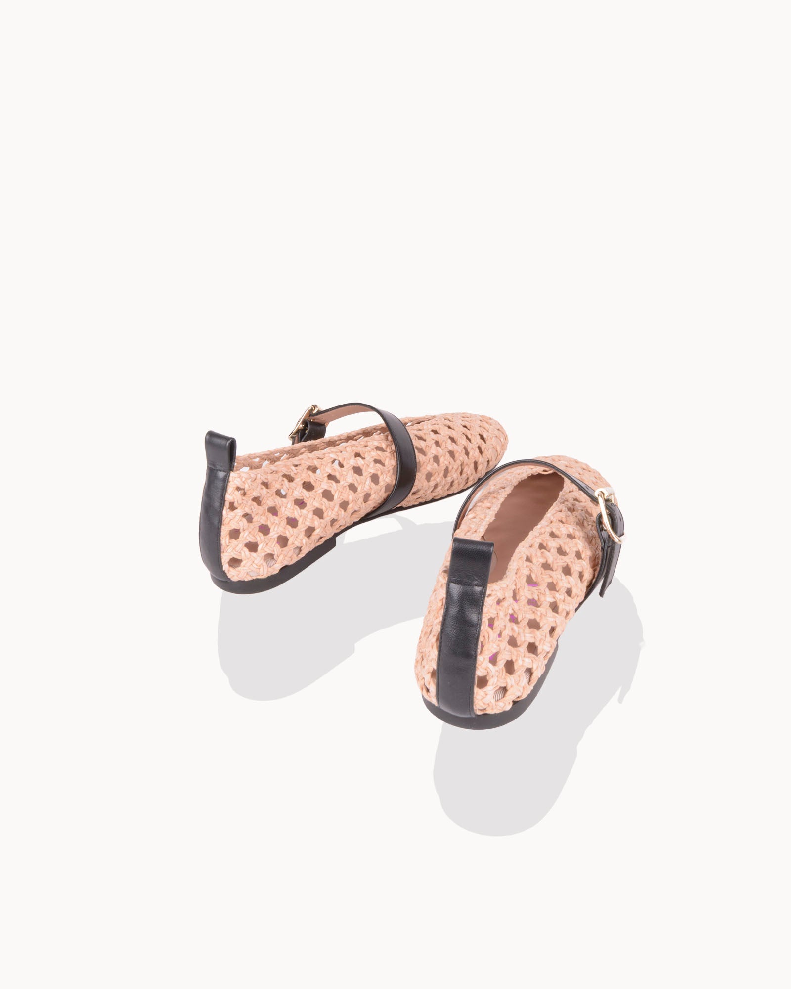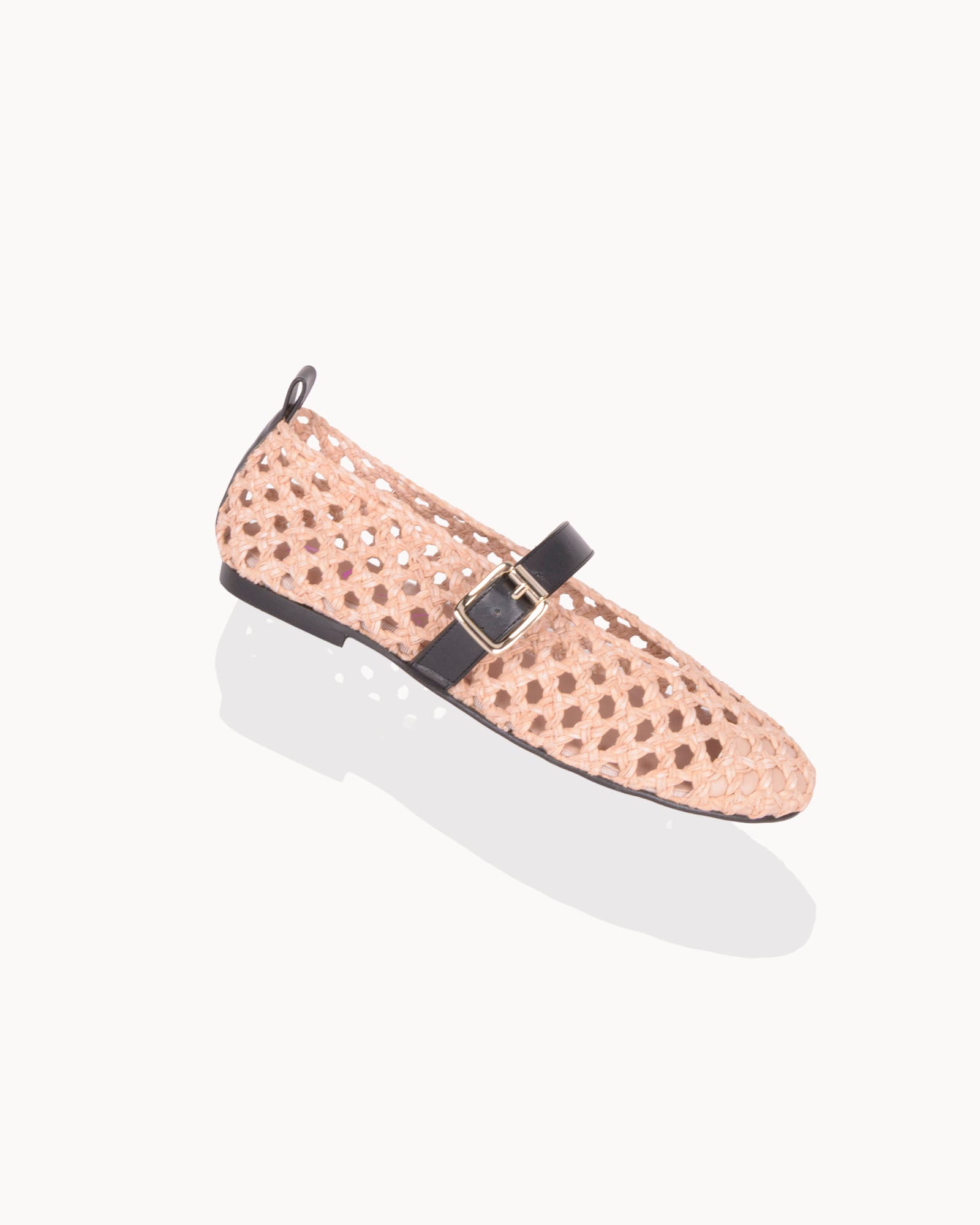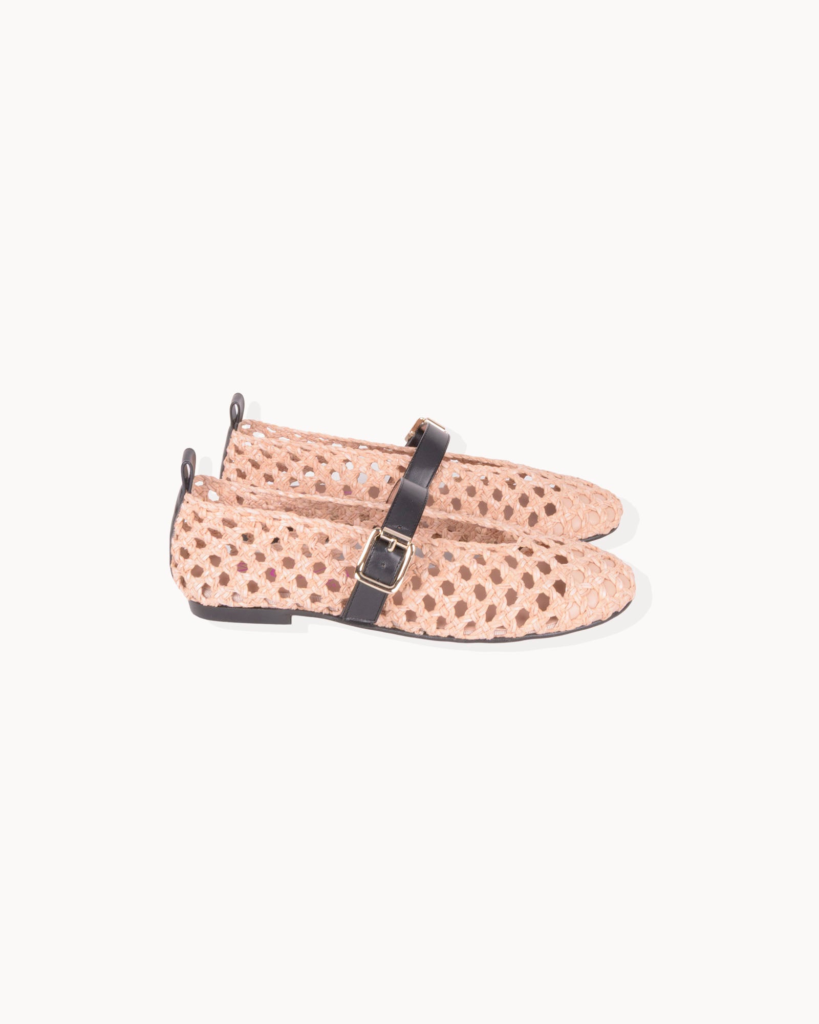 Bailarina en trenzado nude. Detalle de correa en piel color negro con cierre de hebilla. Plantilla de piel acolchada. Tacón de 1,5cm y suela antideslizante.